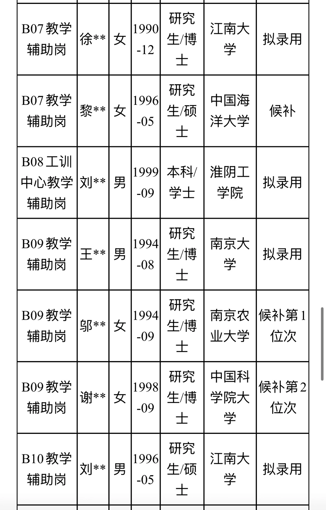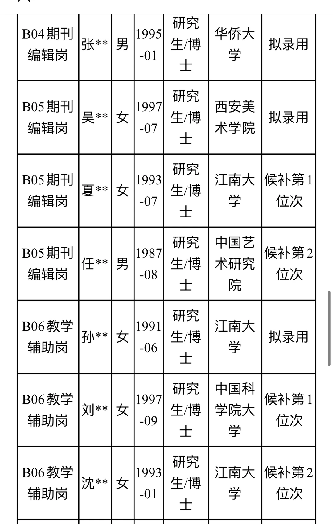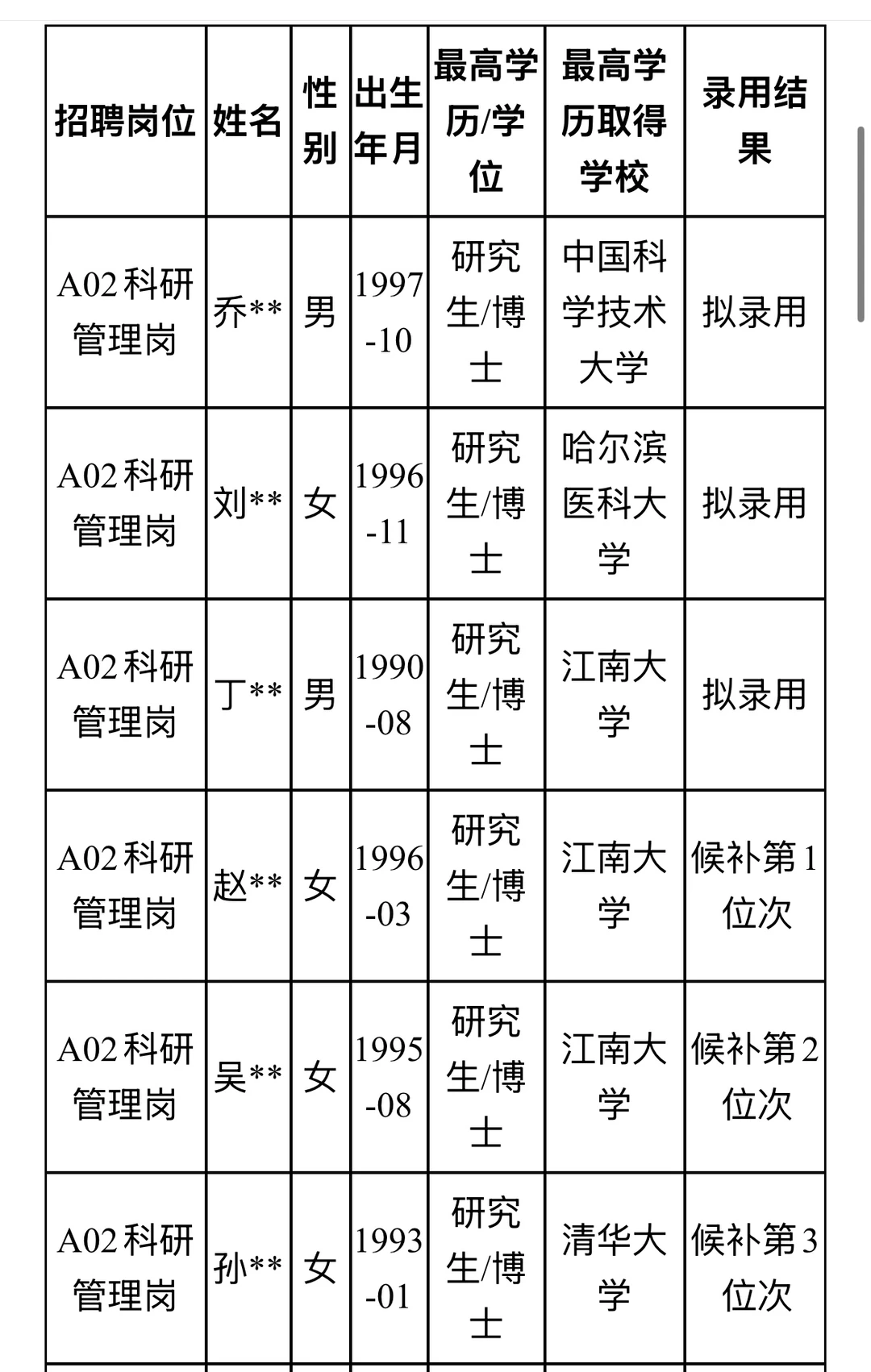 根据《江南大学2025年下半年管理岗、其他专技岗招聘公告》相关要求,经资格审核、综合考核,拟录用乔**等23位同志,赵思佳等30位同志为候补人员。
