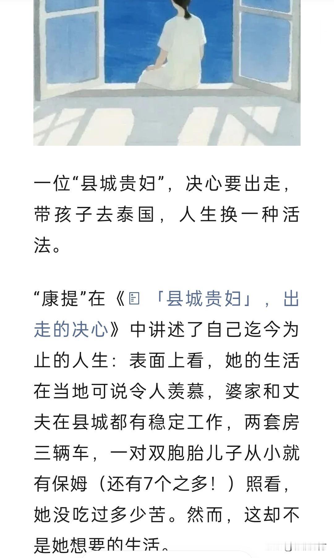 一位“县城贵妇”决定出走。她们家在县城生活条件优裕,自己没有上班,甚至孩子也不用自己带,有保姆。但她却对这种生活越来越不满意,因为“一眼就能看到头儿”。所以她决定带孩子去泰国生活,而夫家对她也足够支持,让她去享受“自由”。创作训练营2期开营啦 可以选择的生活总是值得羡慕,但我怀疑这位女士又会对新的生活产生厌倦感。因为人的满足感总是会随着事物获取量的增长而逐渐降低,俗话说得好,“距离产生美”,而美也会随着近距离接触而慢慢失去新奇感,这时就会产生新的不满足。 但不管怎样,还是祝福吧,希望她能在别处找到有“意义”的生活,可以一眼望不到头儿。[笑哭]