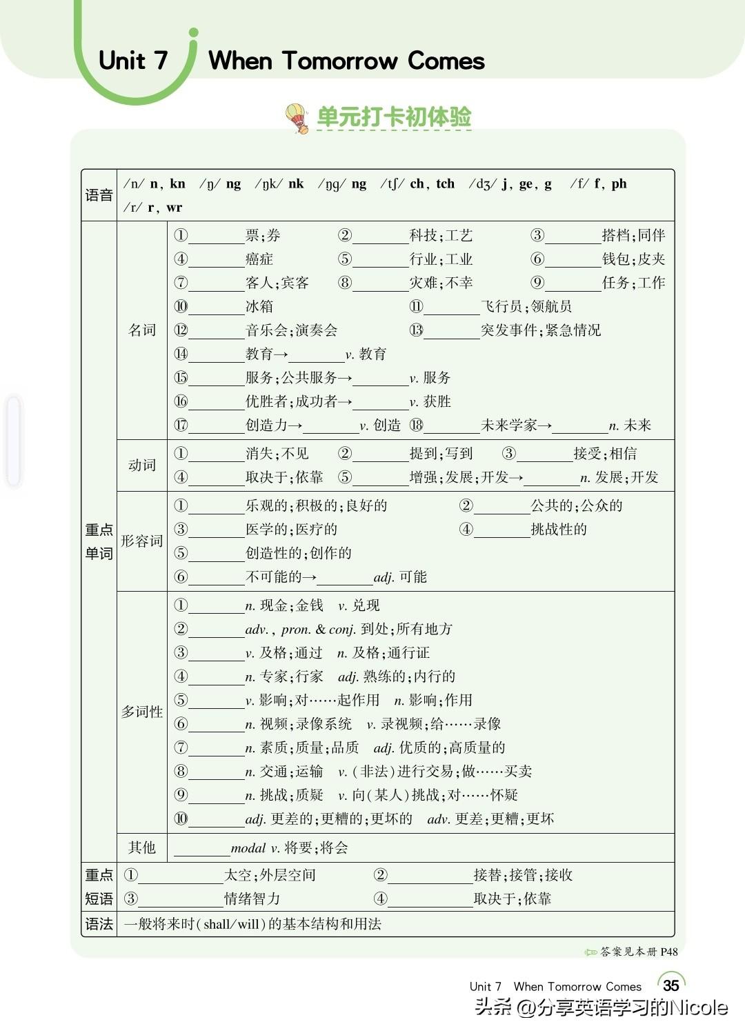 📚 人教版上册八年级 八年级单元7打卡初体验:掌握当明天来临时必备词汇与短语!💡当开启单元7打卡初体验,仿佛打开了一扇通往全新英语世界的大门。这些当明天来临时必备的词汇与短语,就像一把把钥匙,能帮助我们更好地表达和交流。 比如“anticipate”这个词,它代表着期待、预期,当我们说明天来临时,心中对未来有美好的憧憬,用“anticipate”就再合适不过了。还有“prospect”,既可以表示前景,也能指可能性。明天充满了不确定性和无限可能,用“prospect”来形容再好不过。 短语方面,“look forward to”经典又实用,简单直白地表达对明天到来的期盼。“in the offing”也很有趣,它表示即将到来、临近,给人一种明天已经在不远处招手的感觉。 通过这次打卡初体验,我不仅记住了这些词汇和短语,更感受到了它们在实际运用中的魅力。相信随着不断地学习和积累,当明天真正来临时,我们能够更加自信、流利地用英语表达自己的想法和感受。💪