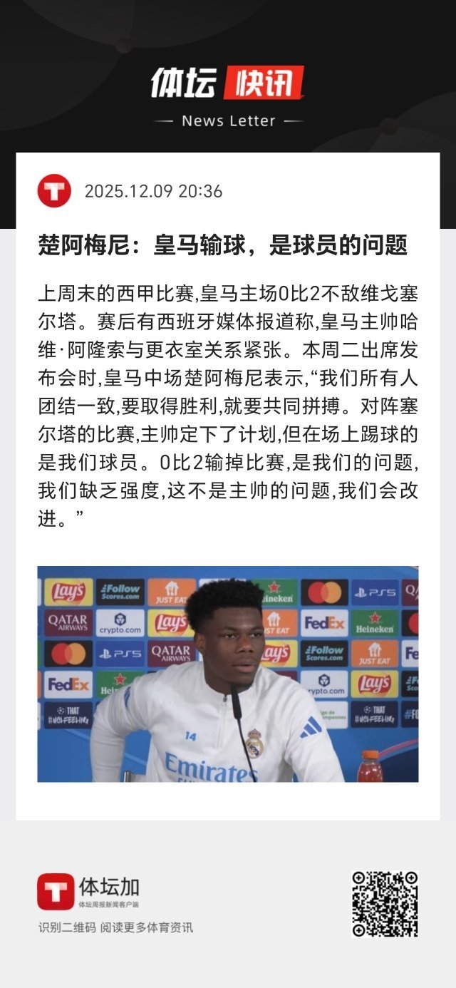 被问起换帅传闻时,阿隆索表示,“当一个人执教皇马时,那么他总归会对这种局面做好准