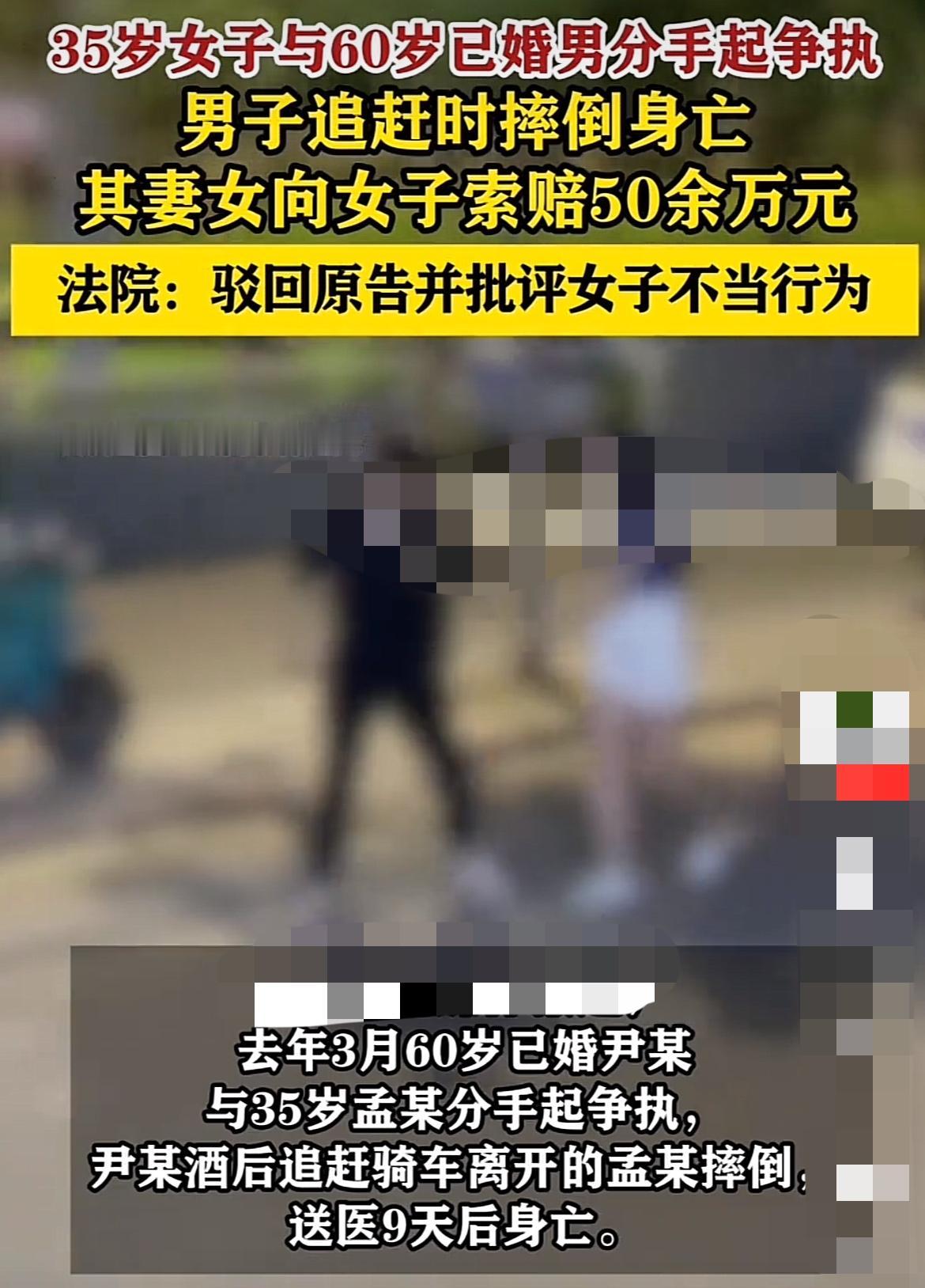 60岁已婚男追赶35岁暧昧对象时摔死!最后法院竟然这样判! “她就骑上车走了,一个60岁的人,在后面追啊……” 在上海浦东新区,一个60岁的已婚男子尹某,在追赶骑共享单车离开的35岁女子孟某时摔倒,9天后去世。他的妻女向孟某索赔54万余元,而法院近日的一审判决,驳回了全部诉求。 这件事的起点是一场有酒有歌的聚会。散场后,尹某和孟某同乘一辆出租车离开,但中途便提前下了车。判决书还原了二人之间最后的情感拉锯:他们在公交车站并肩行走、交谈,孟某解锁一辆共享单车准备离开时,尹某曾上前挽留。僵持数分钟后,孟某最终骑车离去,尹某则在追赶出约200米后踉跄摔倒。 事后双方在法庭上的陈述截然不同。尹某家属指责孟某“放任”醉酒者追赶,属间接故意。而孟某则称,尹某当时意识清楚,能与司机正常沟通,自己骑车离开时开着语音导航,并未察觉后方异常。 法院的判决清晰地划分了道德情感与法律责任的边界。核心结论基于两点:首先,原告未能证明孟某的行为与尹某的死亡存在法律上的因果关系。关键证据是医院的记录,尹某的直接死因为“心脏呼吸衰竭”,而非醉酒或外伤。其次,法院明确指出,“尹某作为成年人,应当是自身安危的第一责任人”。 判决书并未回避对这段关系的道德评判,特别指出“孟某与有家室的尹某之间关系暧昧,实属不该”,并对此予以严肃批评。 这场情与法的交锋,这事儿您瞅着咋整?是支持法院的明确判罚,还是觉得其中有值得商榷之处?评论区唠两块钱的! [免责声明]文章的时间、过程、图片均来自于网络,文章旨在传播正能量,均无低俗等不良引导,请观众理性看待本事件,切勿留下主观臆断的恶意评论,互联网不是法外之地。本文如若真实性存在争议、事件版权或图片侵权问题,请及时联系作者,我们将予以删除。