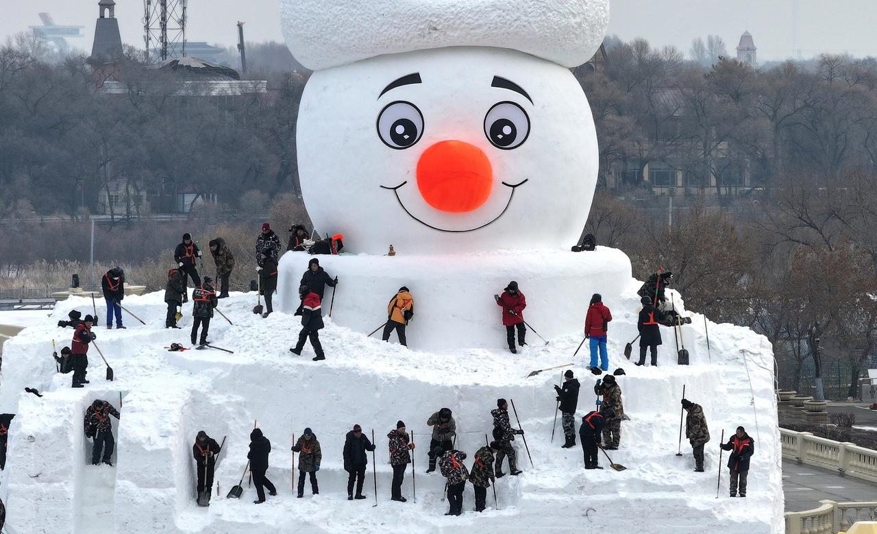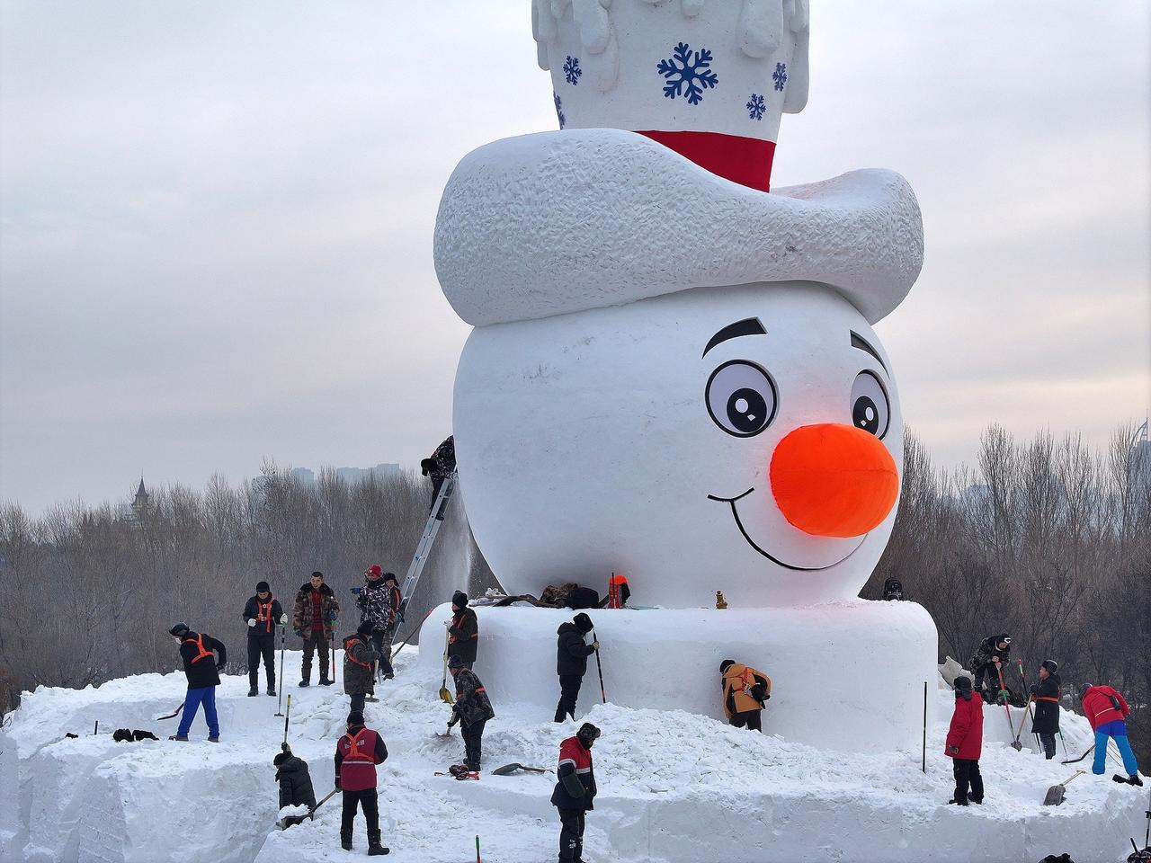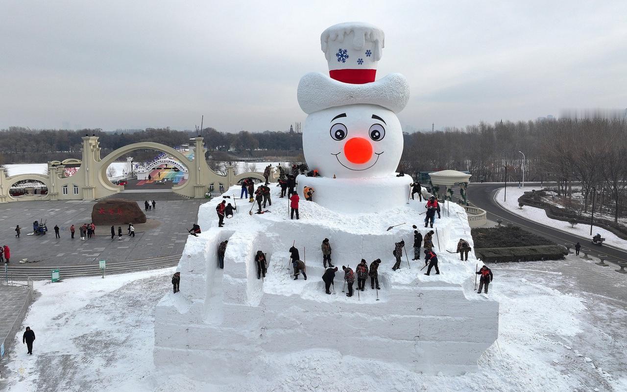 哈尔滨太阳岛风景名胜区用5000立方米的雪建造了一座高达23.8米的雪人,这座雪人是该景区一年一度备受游客喜爱的冬季标志性景观。