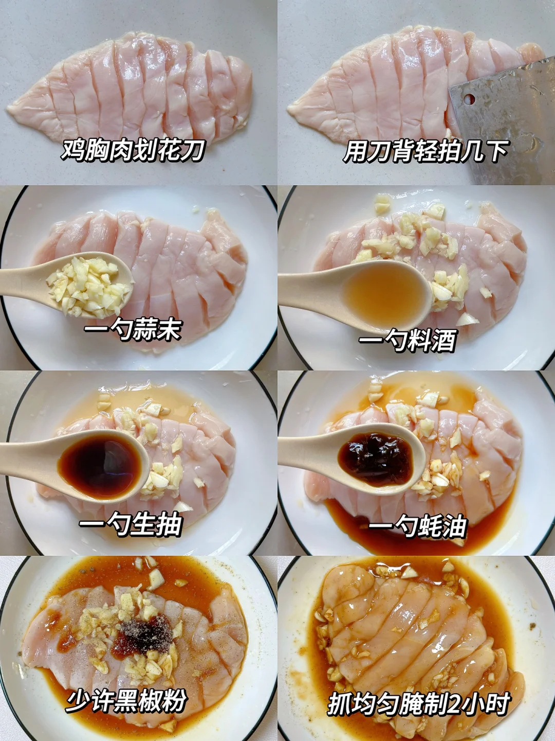 低脂的香煎鸡胸肉这样做太香啦,巨好吃,鲜嫩多汁,一点都不柴,做法超简单,要提前腌制一下喔,也可以提前一晚腌制,减脂期的姐妹一定要试试哟!! 🥗食材:鸡胸肉、蒜末 🥘做法:看图4和图5哟,有详细的介绍 ~~~~~~~~~~~~~~~~~~~~ ⚠️鸡胸肉一定要提前腌制哟!