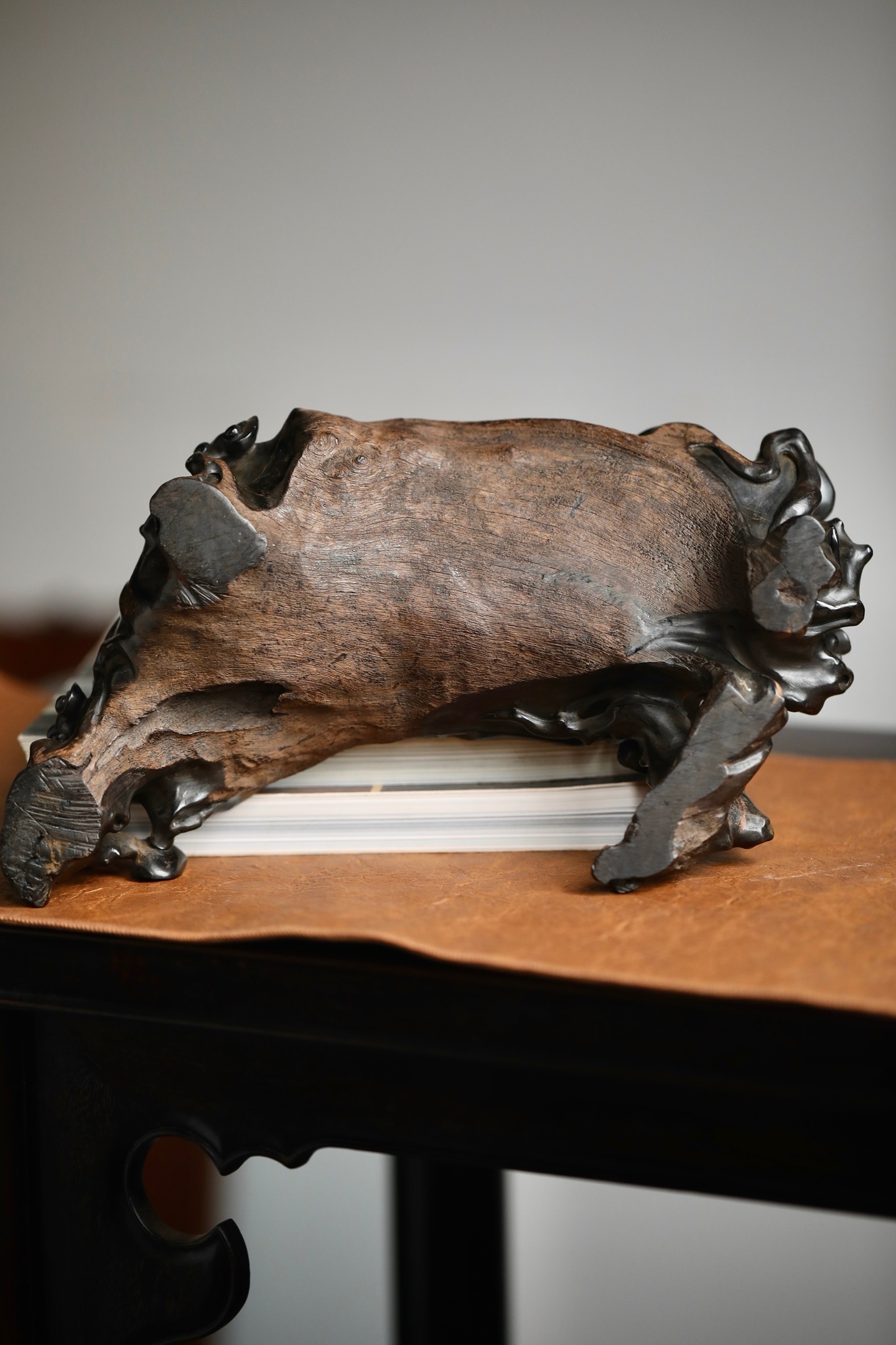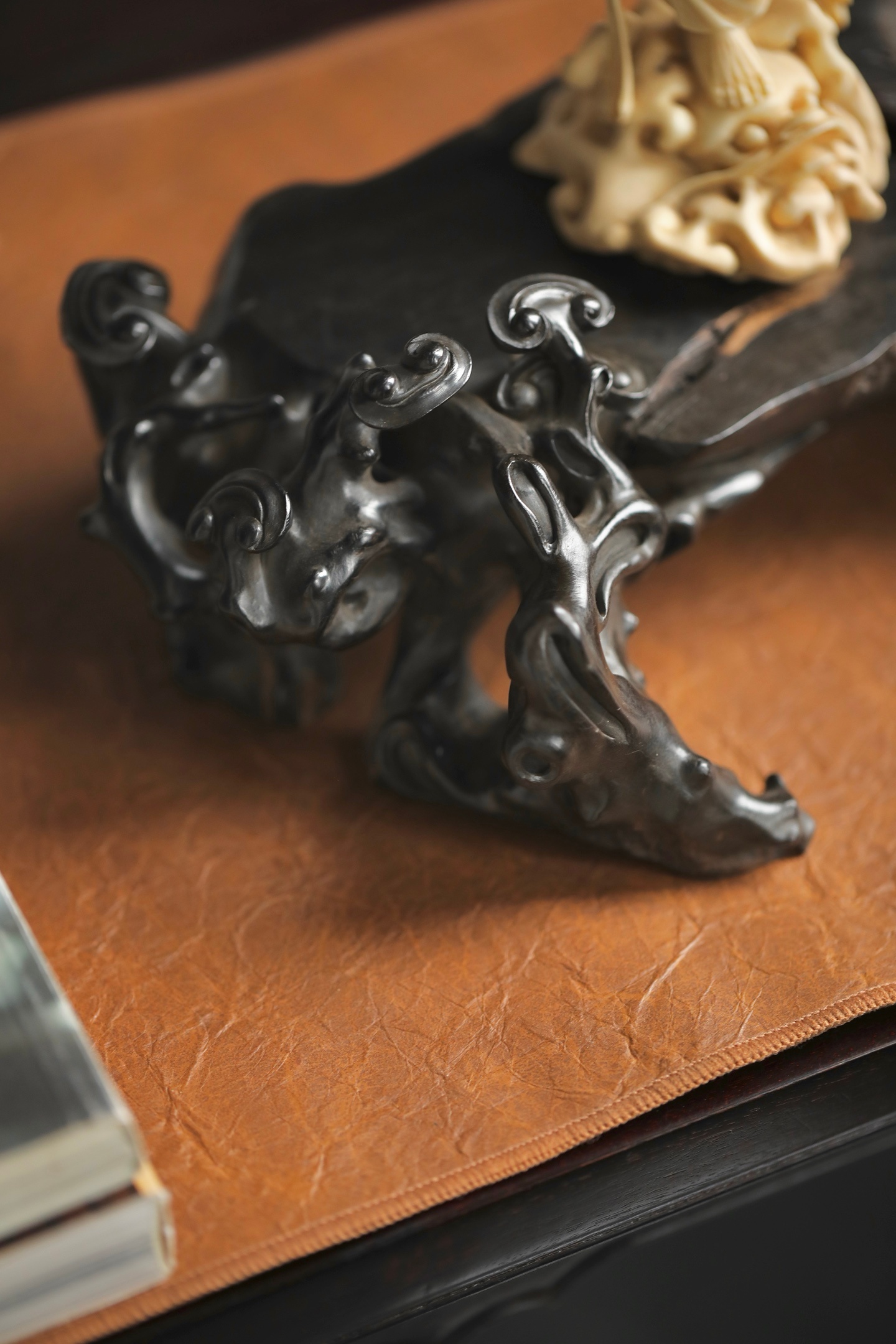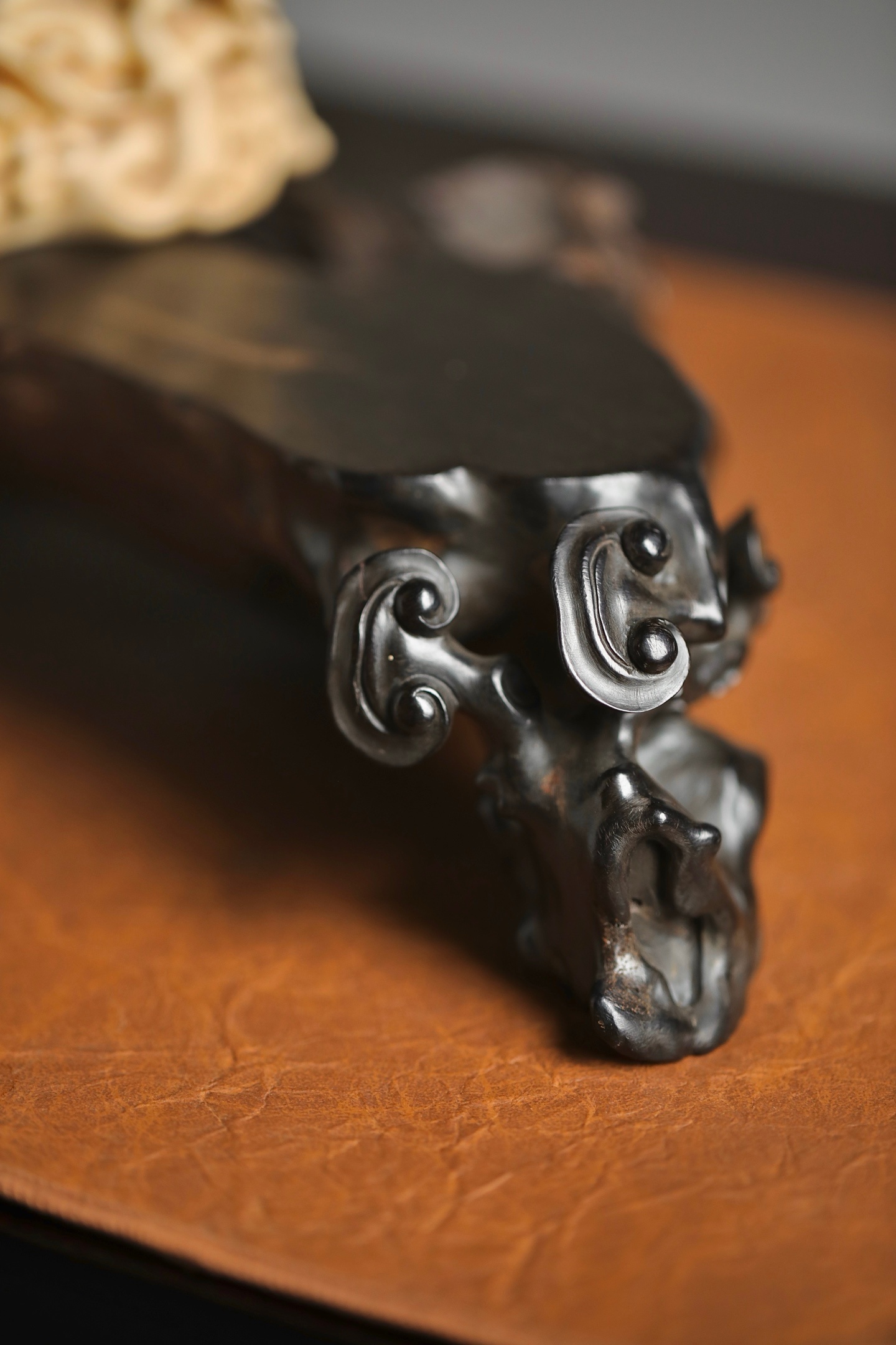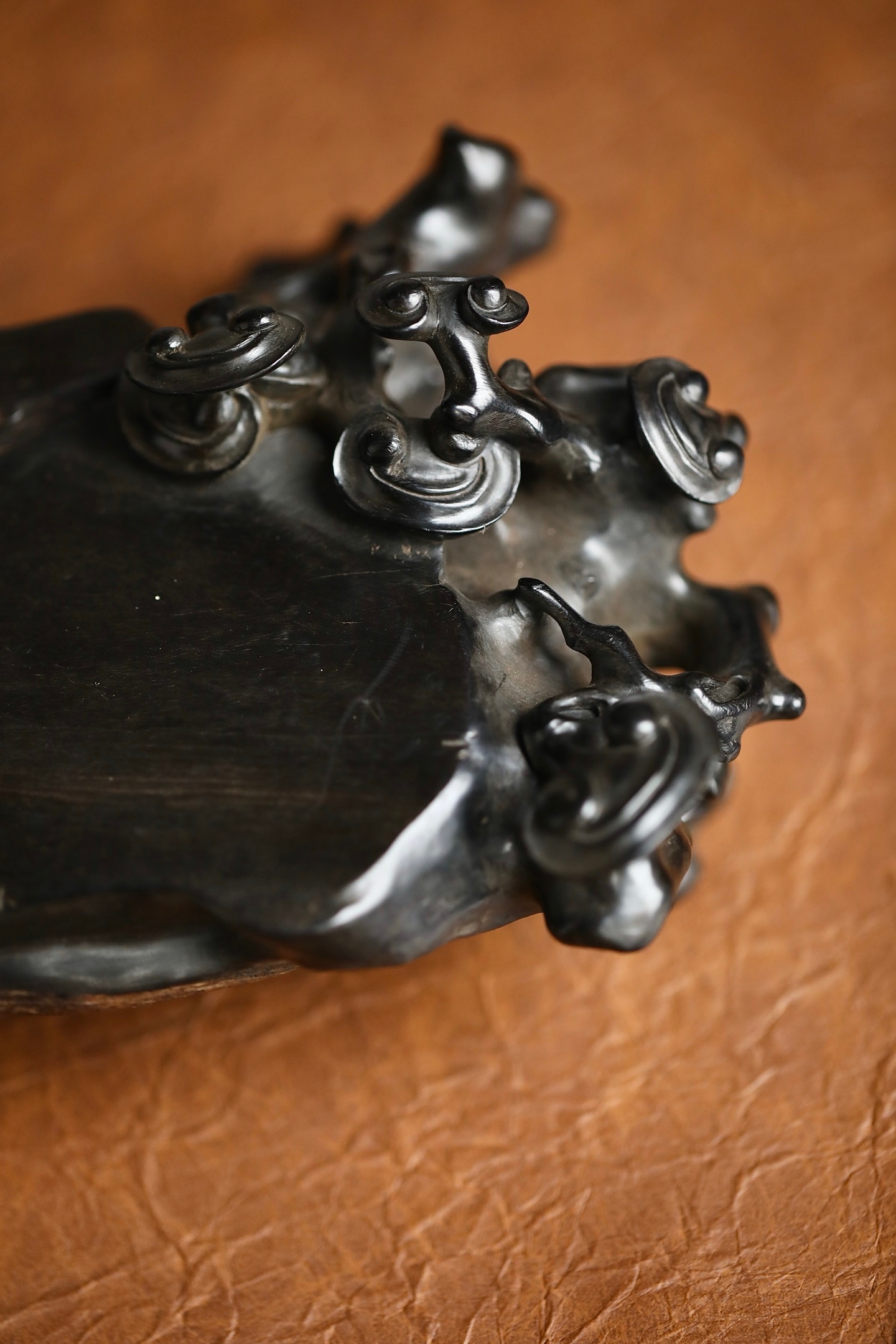 乌木 | 随形灵芝底座木质坚密沉润,色如墨漆。随料就形雕琢灵芝卷云纹,枝蔓盘曲灵动,天然的木质纹理与人工雕工相融,朴拙中见精巧。