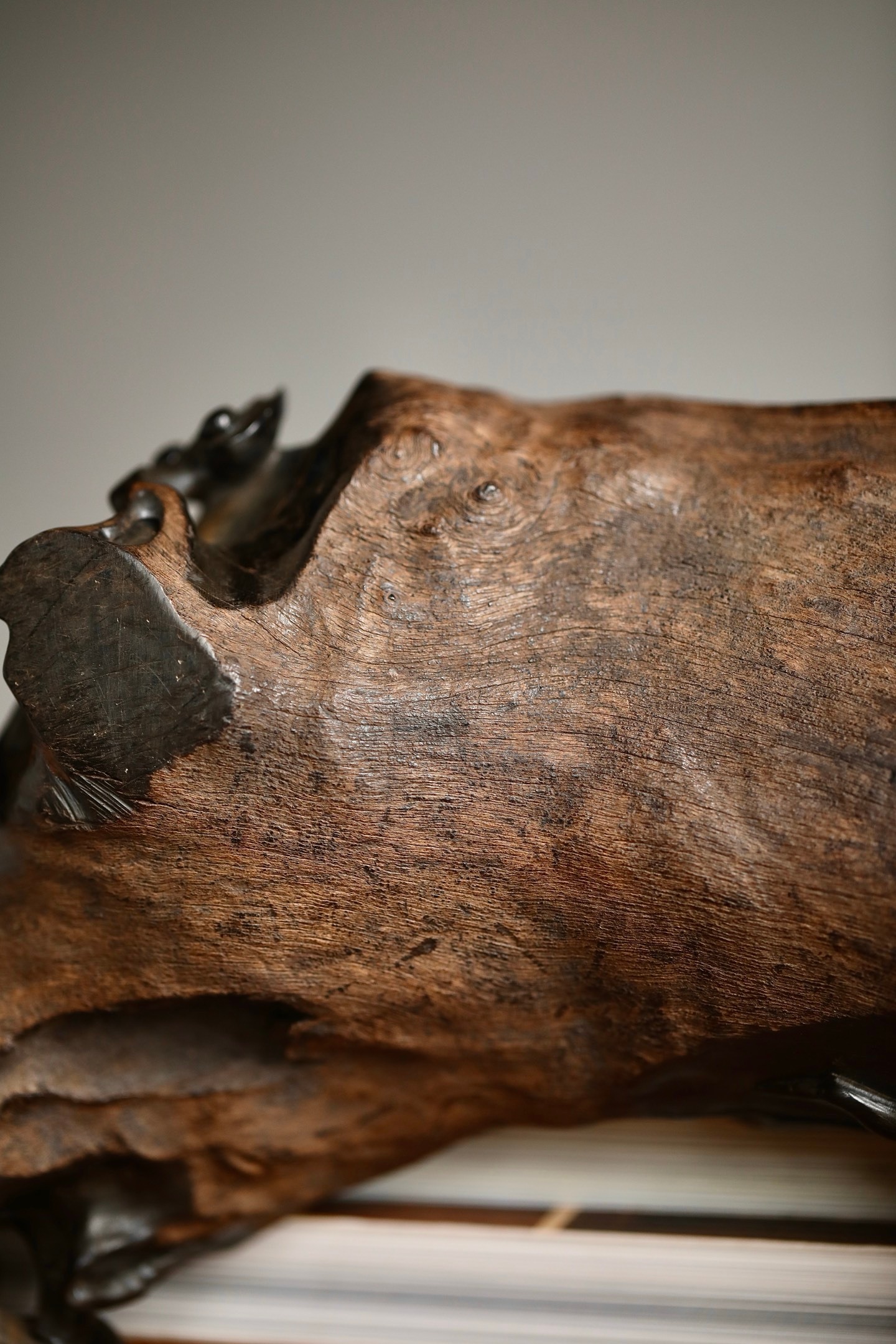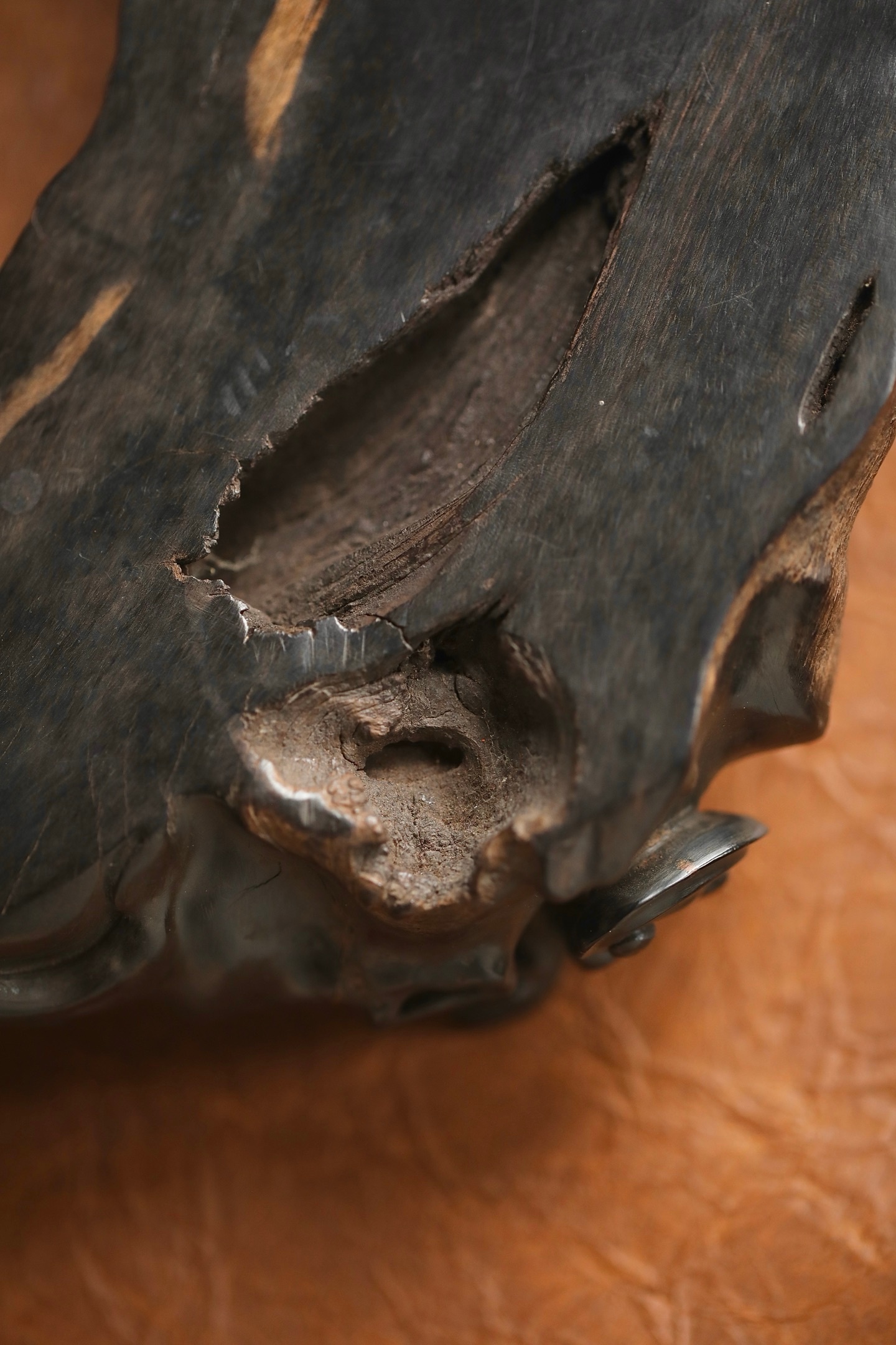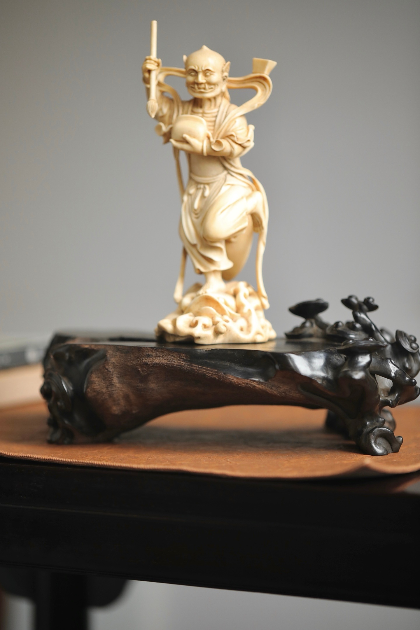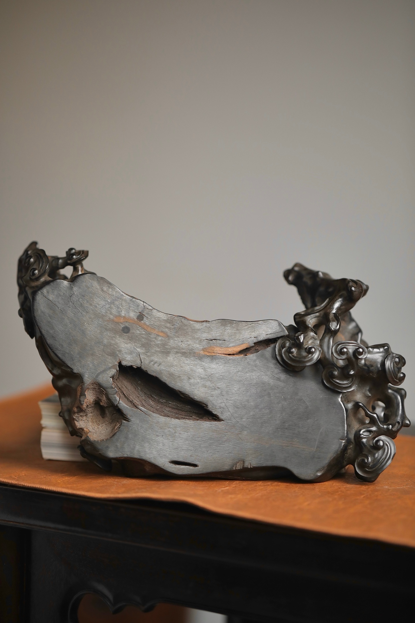 乌木 | 随形灵芝底座木质坚密沉润,色如墨漆。随料就形雕琢灵芝卷云纹,枝蔓盘曲灵动,天然的木质纹理与人工雕工相融,朴拙中见精巧。