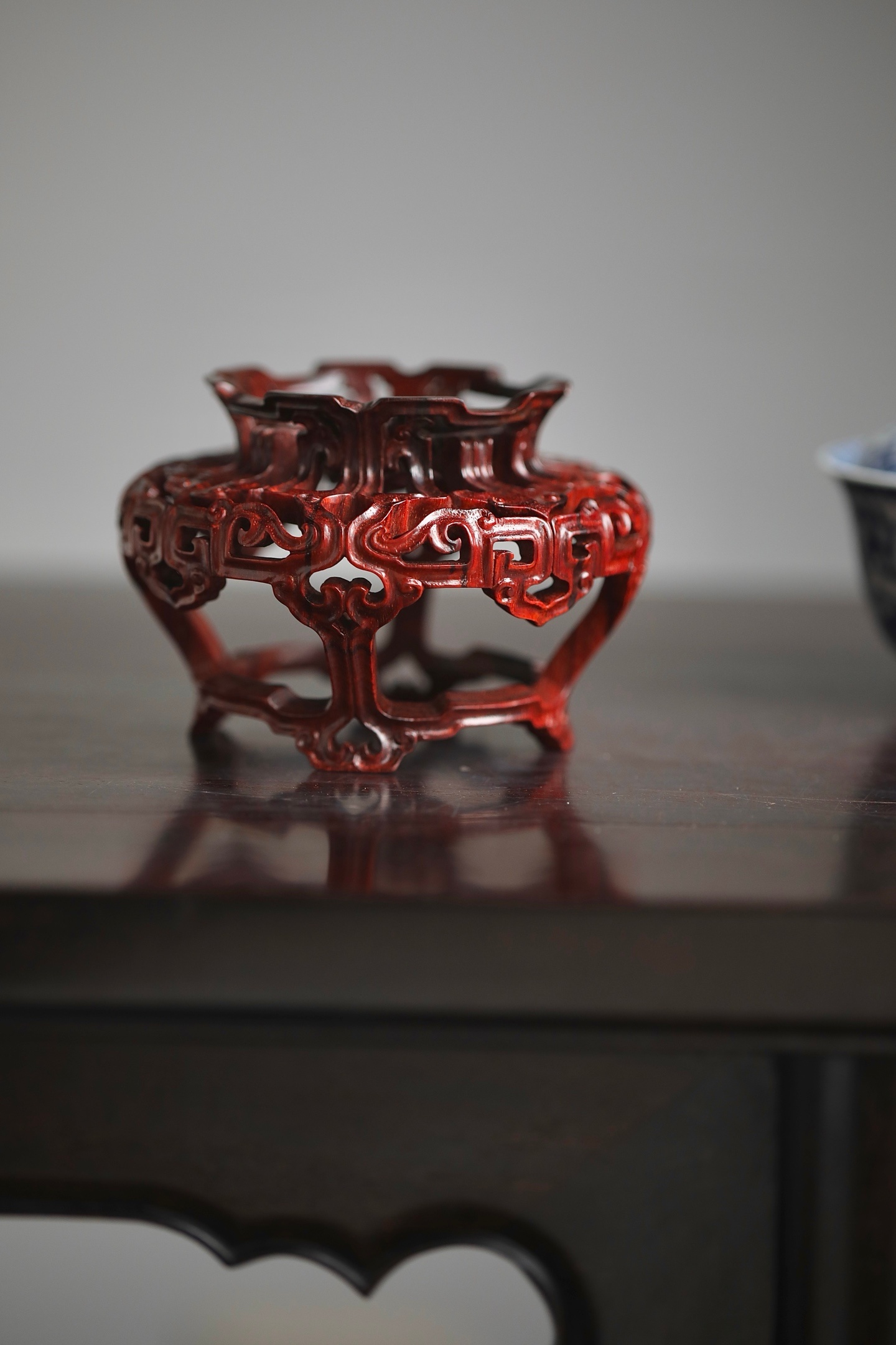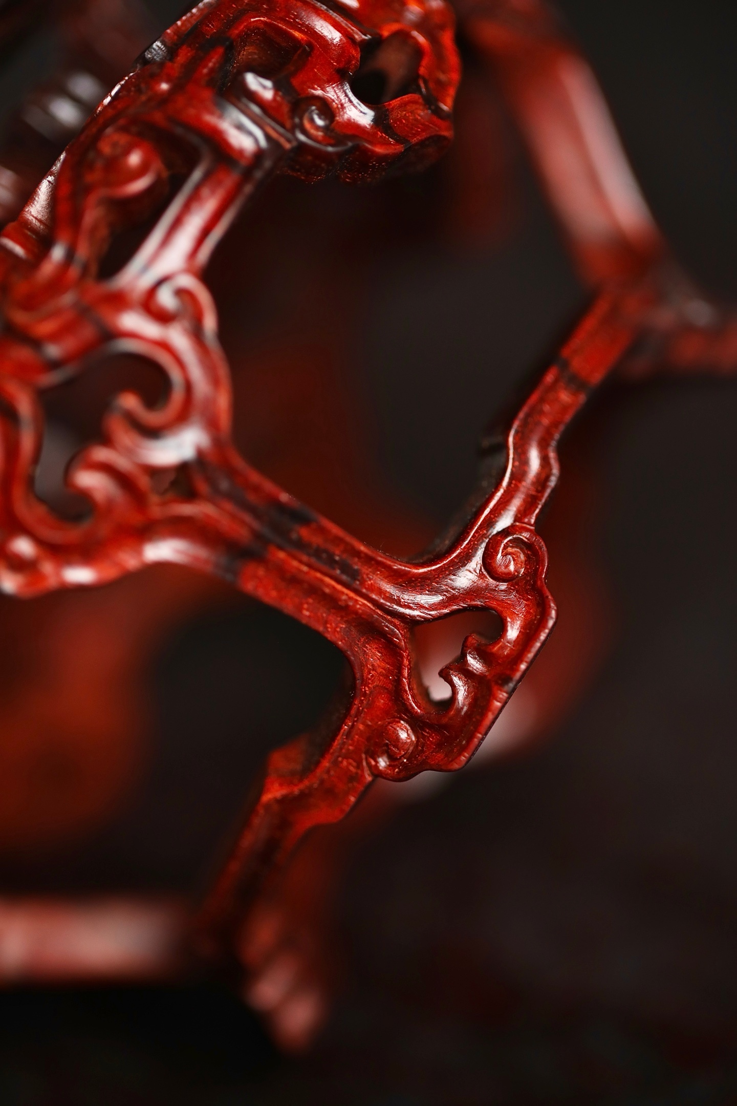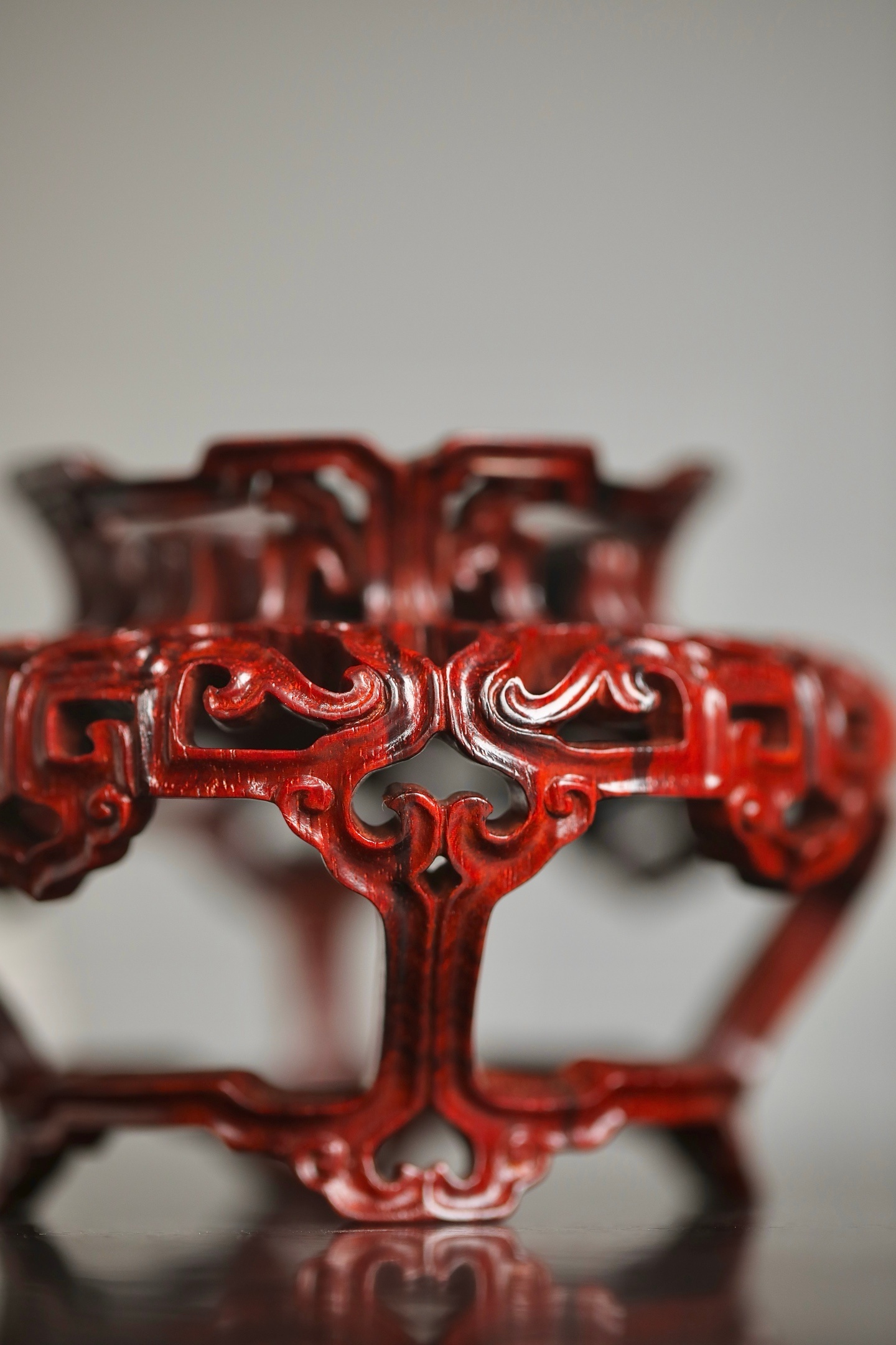 紫檀 | 器座以镂空的缠枝纹样,承载起器物的重量,更承起中式美学的古韵风华。置于案上,是底座,更是一件独立的雕刻艺术品。10.8×7.3 内径:5.6cm
