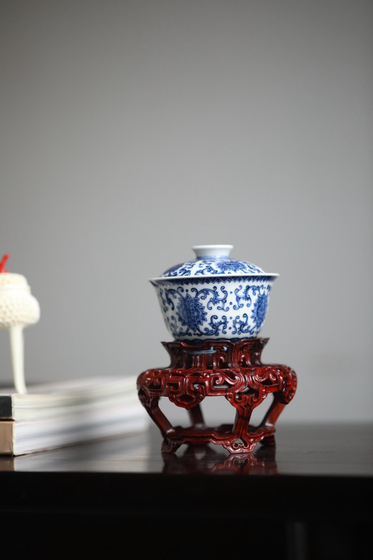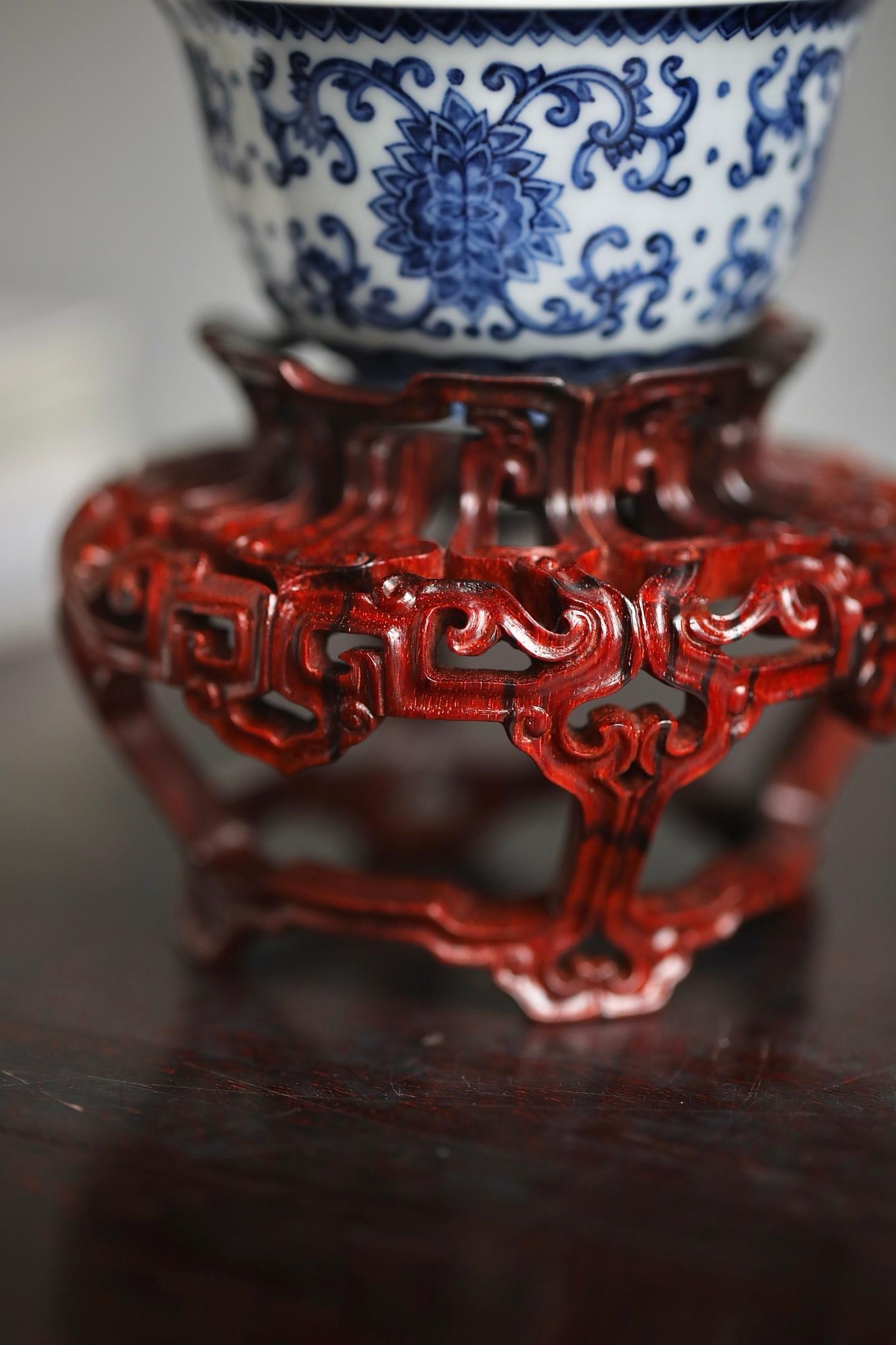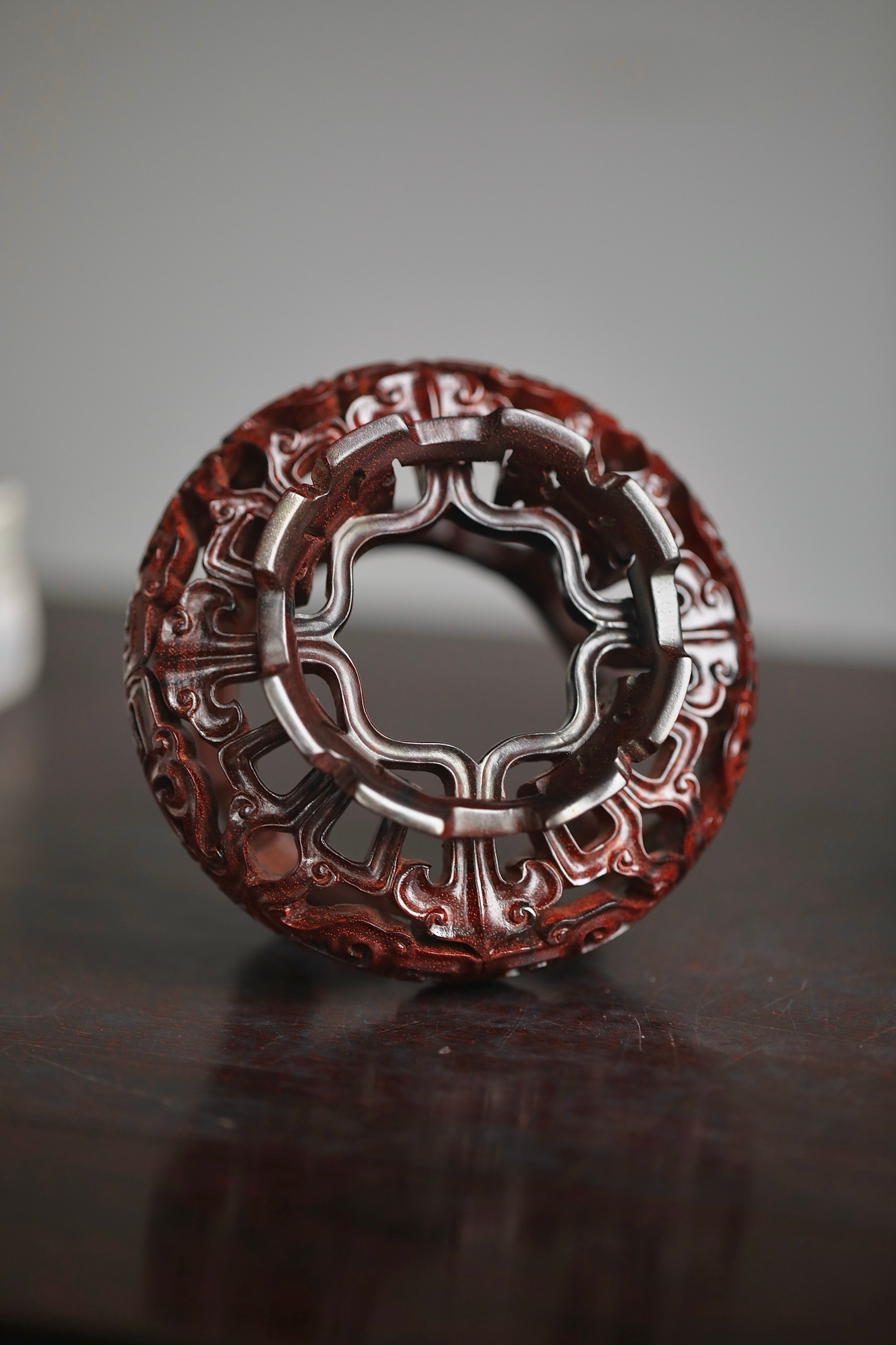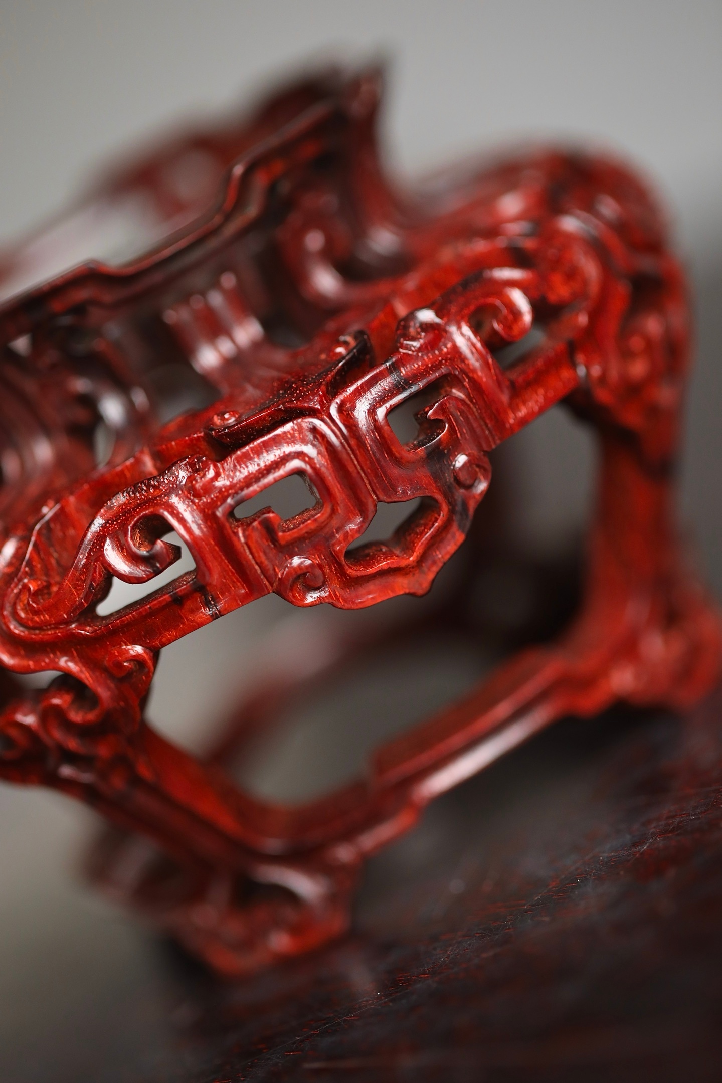 紫檀 | 器座以镂空的缠枝纹样,承载起器物的重量,更承起中式美学的古韵风华。置于案上,是底座,更是一件独立的雕刻艺术品。10.8×7.3 内径:5.6cm