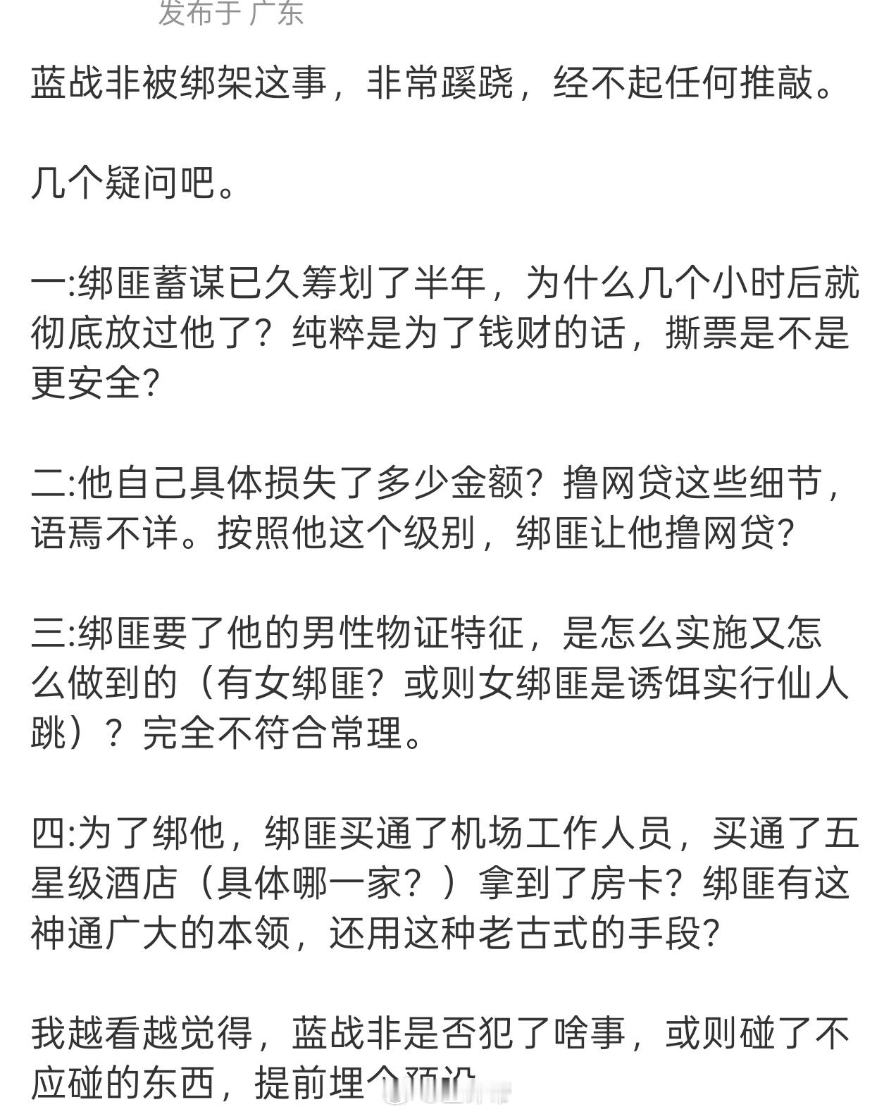 多方回应蓝战非自曝遭绑架看网上不少人开始质疑蓝战非是自导自演?说可能是犯了事儿故意这样的有没有福尔摩斯啊?你们说这个事后续会不会有反转?