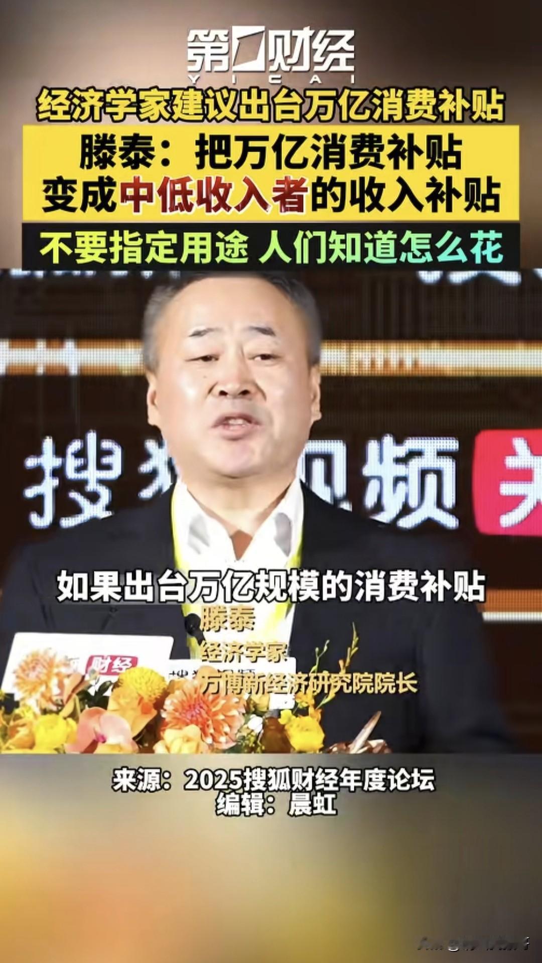 个人觉得2025搜狐财经年度论坛上经济学家滕泰说的太对了,他建言如果考虑发放万亿级消费补贴用于提振消费,不要搞商品补贴,直接给老百姓发通用消费券,不要指定购买商品的种类,最多给这个消费券一个有效期,老百姓自己知道该买什么。 他还指出未来要接受投资低增长甚至负增长,减少低效无效投资,把省出的钱转成居民收入来扩大消费。这些观点太有前瞻性和建设性了,希望能早日落地。