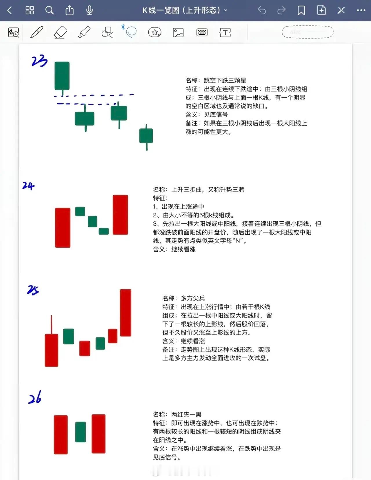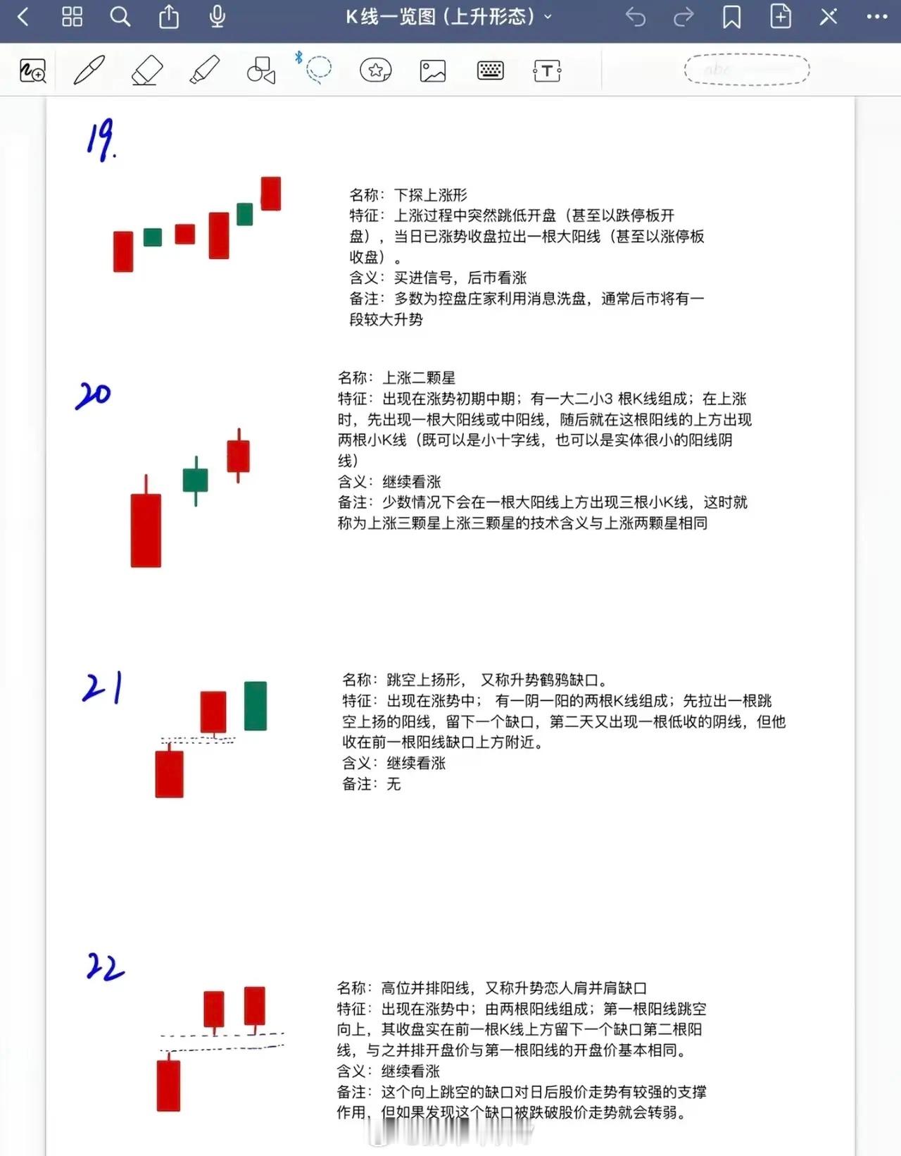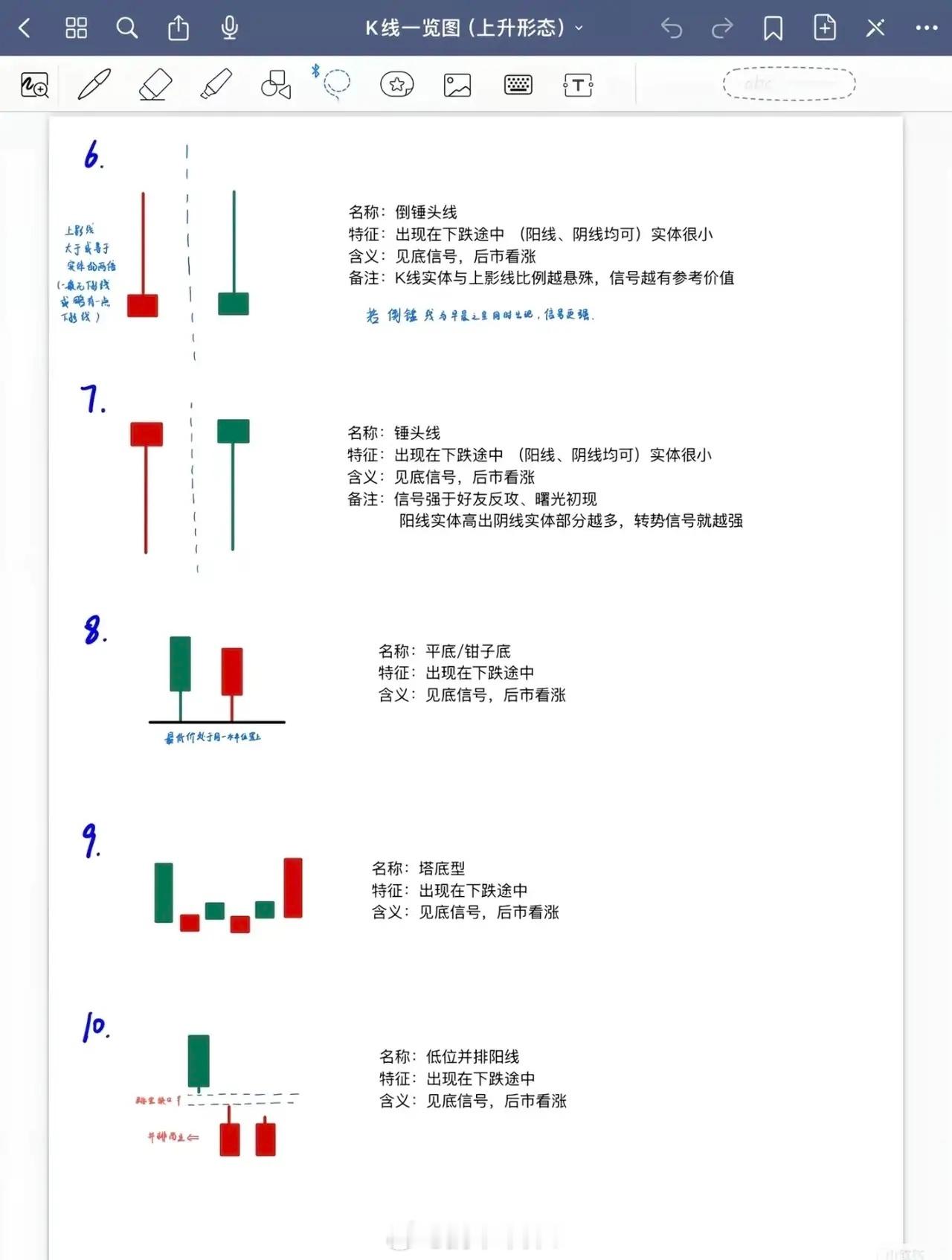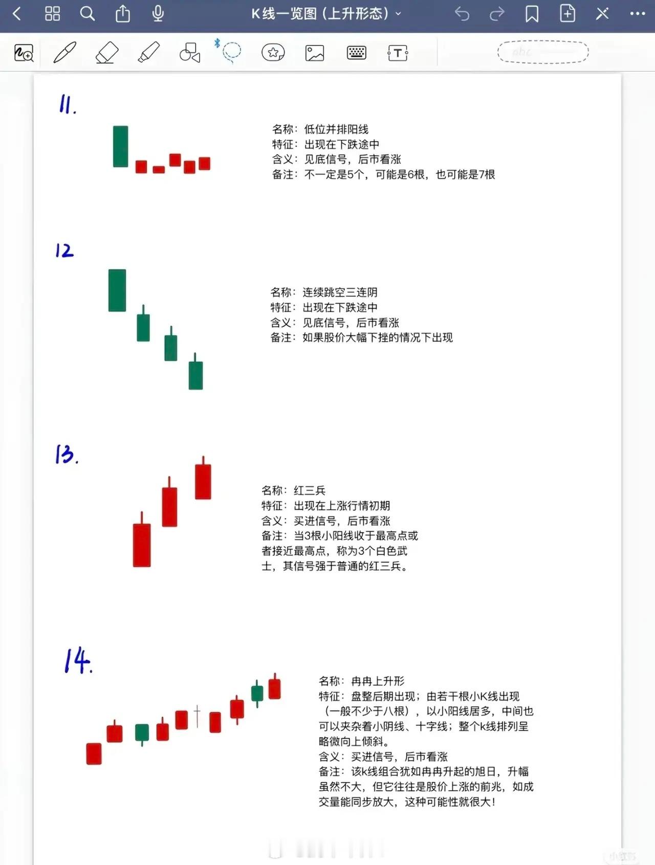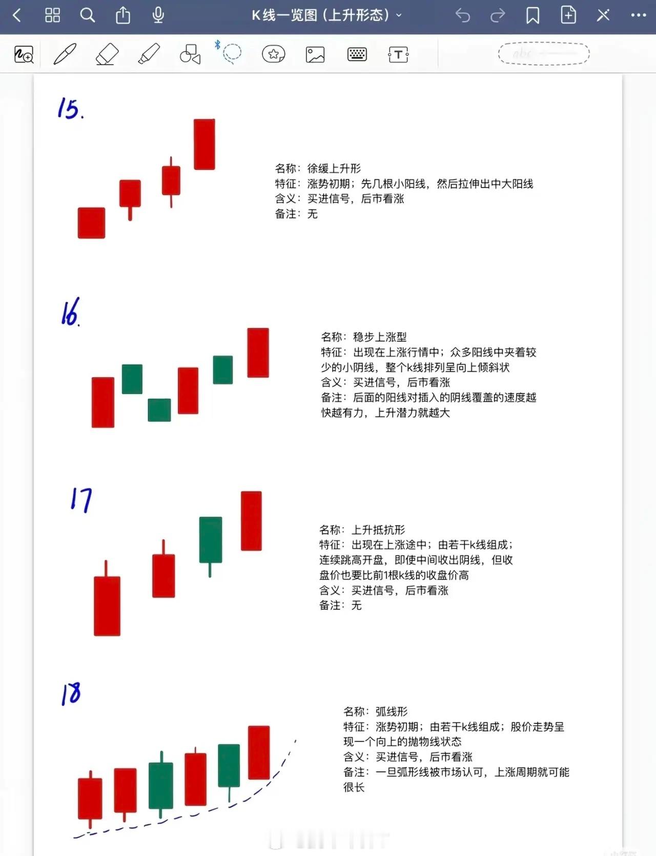 以下是对6张K线上升形态内容的系统总结,按形态类别及核心要点梳理:一、下跌途中出现的见底看涨形态(1-12)此类形态均出现在下跌趋势中,预示股价可能见底回升,信号强度因形态细节差异有所不同:1. 早晨十字星/希望十字星:下跌途中出现,见底看涨信号最强。2. 早晨之星/希望之星:下跌途中出现,见底看涨但信号弱于早晨十字星。3. 好友反攻:下跌途中出现,见底看涨,转势信号弱于曙光初现。4. 曙光初现:下跌途中出现,阳线实体深入阴线越多,转势信号越强。5. 旭日东升:下跌途中出现,阳线高出阴线越多,信号强于好友反攻、曙光初现。6. 倒锤头线:实体小,上影线≥实体2倍(可阳可阴);实体与上影线比例越悬殊,信号越可靠;若与早晨之星同时出现,信号更强。7. 锤头线:实体小(可阳可阴),信号强于好友反攻、曙光初现。8. 平底/钳子底:下跌途中出现,见底看涨。9. 塔底型:下跌途中出现,见底看涨。10. 低位并排阳线(首次提及):下跌途中出现,见底看涨(第11项补充:不一定5根,可能6-7根)。11. 连续跳空三连阴:下跌途中大幅下挫时出现,见底看涨。二、上涨初期/盘整后期的买进看涨形态(13-14)此类形态预示上涨行情启动或盘整后突破,需关注信号强度及量能配合:12. 红三兵:上涨行情初期出现,3根小阳线收于最高点或接近最高点(称“三个白色武士”),信号强于普通红三兵。13. 冉冉上升形:盘整后期出现,由≥8根小K线(以小阳为主,夹杂小阴/十字线)组成,排列略向上倾斜;如成交量同步放大,上涨可能性更大。三、涨势初期的买进看涨形态(15-18)此类形态标志涨势启动,需关注形态结构及市场认可度:14. 徐缓上升形:涨势初期,先几根小阳线,后拉伸出中大阳线。15. 稳步上涨型:上涨行情中,众多阳线夹少量小阴线,排列向上倾斜;后续阳线覆盖阴线速度越快越有力,上升潜力越大。16. 上升抵抗形:上涨途中,连续跳高开盘,即使收阴线,收盘价仍高于前一根K线收盘价。17. 弧线形:涨势初期,K线排列呈向上抛物线;一旦被市场认可,上涨周期可能很长。四、涨势中继续看涨的形态(19-22)此类形态出现在上涨过程中,预示趋势延续,需注意洗盘或缺口支撑:18. 下探上涨形:上涨中突然跳低开盘(甚至跌停),当日以大阳线(甚至涨停)收盘;多为庄家洗盘,后市可能有较大升势。19. 上涨二颗星:涨势初/中期,一大二小3根K线(大阳线后上方两根小K线);少数情况为“上涨三颗星”(大阳线上方三根小K线),技术含义相同。20. 跳空上扬形(升势鹤鸦缺口):涨势中,先跳空阳线留缺口,次日阴线收在缺口上方附近。21. 高位并排阳线(升势恋人肩并肩缺口):涨势中,两根阳线第一根跳空,第二根并排开盘;缺口有支撑作用,跌破则走势转弱。五、特殊见底/延续看涨形态(23-26)此类形态结构独特,需结合缺口、排列等细节判断信号:22. 跳空下跌三颗星:连续下跌途中,大阴线后接三根小阴线(与上方K线有明显缺口);若后续出现大阳线,上涨可能性更大。23. 上升三步曲(升势三鸦):上涨途中,由5根K线组成(大阳线→三根未破阳线开盘价的小阴线→大阳线),走势类似“N”型。24. 多方尖兵:上涨行情中,大阳线带长上影线后回落,不久涨至上影线上方;为多方的试探性进攻。25. 两红夹一黑:两阳夹一阴(阴线较短);涨势中出现继续看涨,跌势中出现见底信号。总结:所有上升形态围绕“见底”或“延续上涨”展开,核心关注形态出现的位置(下跌/上涨阶段)、K线组合细节(如实体长度、影线比例、缺口)及量能配合(如冉冉上升形需成交量放大),信号强度随形态特异性(如早晨十字星>早晨之星)和市场认可度(如弧线形)有所差异。