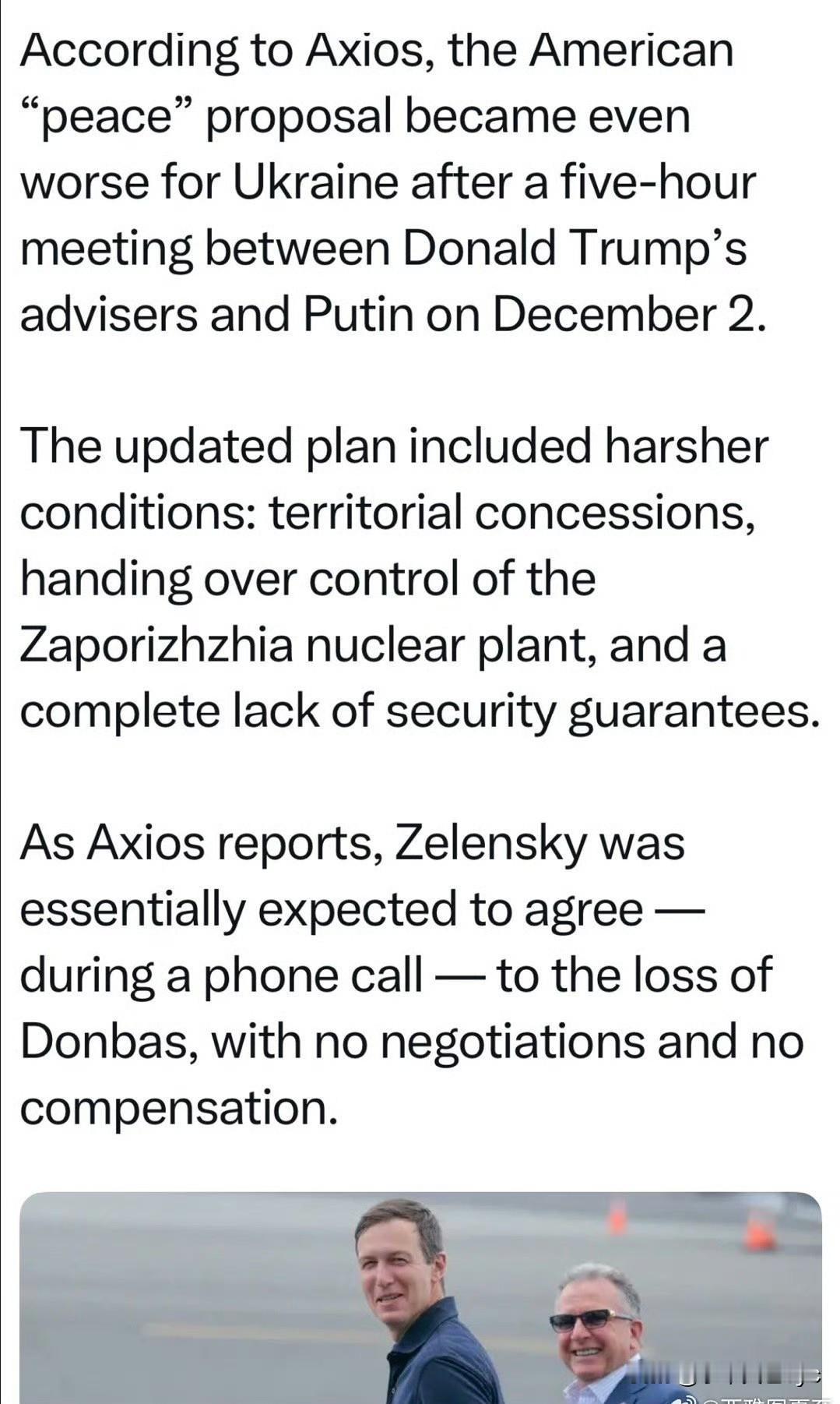 特朗普在接受媒体采访时说道:“如果不是我当总统,现在已经打三战…现在问题也很大,欧洲做得不怎么样” 对于乌克兰冲突的和平谈判,他指责泽连斯基“不看协议”。 特朗普公开表态:“乌应该进行大选,战争是借口,泽连斯基也许能赢、也许赢不了”。 美媒报道:特使威特科夫和女婿库什纳,在电话中要求泽连斯基立刻同意放弃整个乌东、以及核电站,并且没有承诺任何安全保障。与之前相比,条件更苛刻。 特朗普的言论主要集中在三个方面: 批评乌克兰“不民主”:他认为乌克兰以战争为借口长期不举行选举,已经到了“不再是民主国家”的地步。他公开表示,乌克兰应该举行选举,并称泽连斯基“也许能赢,也许赢不了”。 表达对泽连斯基的不满:特朗普公开表示,对泽连斯基尚未阅读美方提出的“和平计划”感到“失望”,暗示泽连斯基是推进和谈的障碍。 据美国政治新闻网(Politico)报道,特朗普的多名核心幕僚已秘密会见了乌克兰前总统波罗申科、前总理季莫申科等泽连斯基的政治对手。这被外界解读为在向泽连斯基施压的同时,为其可能的政治变局做准备。 特朗普的最新言论是其对乌克兰“极限施压”策略的公开化。其核心逻辑是将战争久拖不决的责任部分归咎于乌克兰的“不民主”和领导人不合作,以此为手段,强迫乌克兰接受一个可能包含重大领土让步的快速和平方案。这一过程正在激化美欧矛盾,并将乌克兰置于空前困难的地缘政治夹缝之中。当然最难的还是泽连斯基,随时都有被拿下的风险。一旦那样,大概率会遭多方清算。