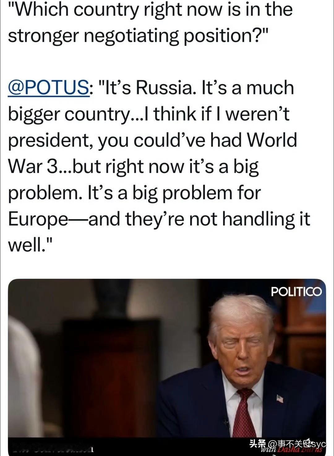 特朗普在接受媒体采访时说道:“如果不是我当总统,现在已经打三战…现在问题也很大,