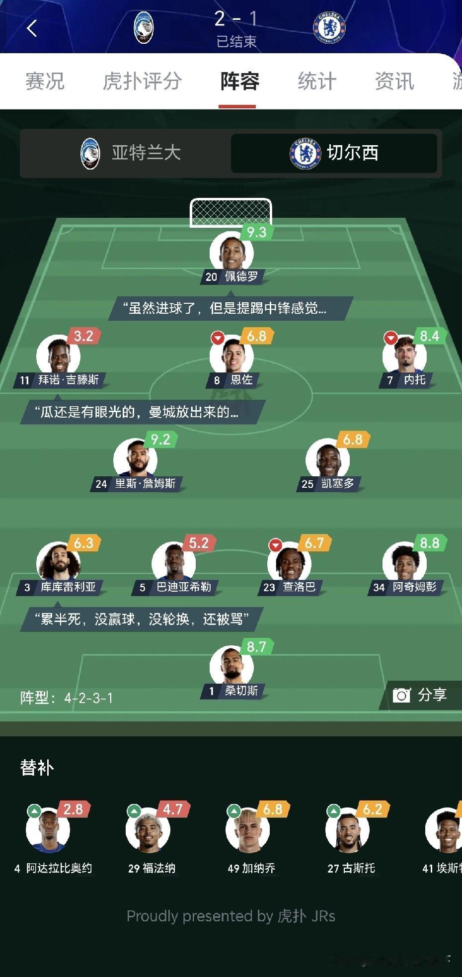 切尔西这是咋了?英超第5输给意甲第12,铁血了两场强队之后三场都没缓过来,各赛事四场不胜。 难道都是死拼阿森纳那场的原因?还是赢巴萨之后就不会踢球了? 我想问这马嗨什么时候下课啊?都快连续三场比赛射门比对面少了,这种教练留着过年?永远猜不到的首发,自杀式的换人。 话说这亚特兰大也是神奇的队伍,意甲能输维罗纳,欧冠能赢切尔西。 我估计是利物浦那边遇到假蓝黑,亚特兰大才是真蓝黑。