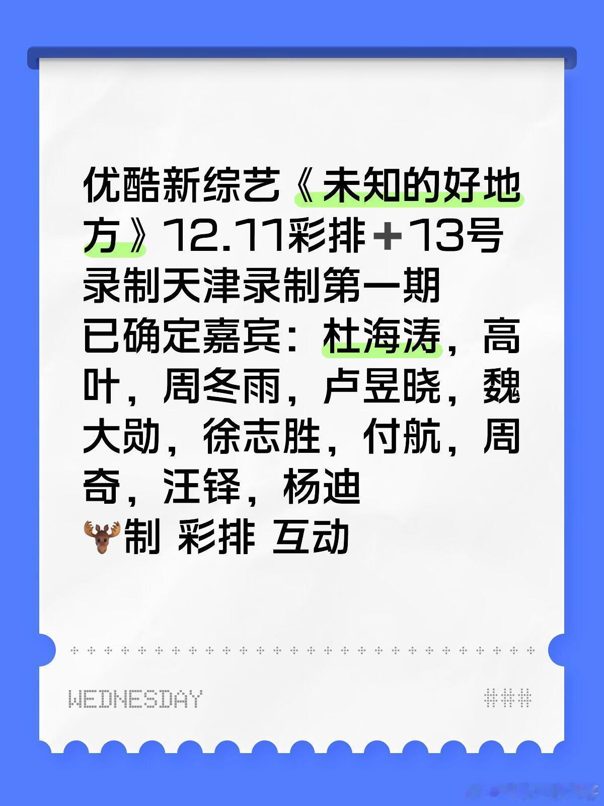 优酷新综艺《未知的好地方》12.11彩排➕13号录制天津录制第一期已确定嘉宾:杜海涛,高叶,周冬雨,卢昱晓,魏大勋,徐志胜,付航,周奇,汪铎,杨迪🫎制 彩排 互动未知的好地方|