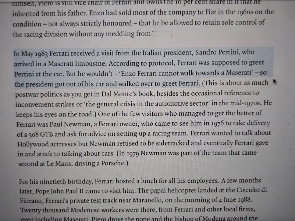 1983年5月,意大利总统桑德罗·佩尔蒂尼前往拜访法拉利,他乘坐的是一辆玛莎拉蒂的豪华轿车。按礼宾规定,恩佐应当走到车前迎接总统。但恩佐拒绝了——“恩佐·法拉利不能走向一辆玛莎拉蒂。”于是,总统下车,反过来走向恩佐与之致意。