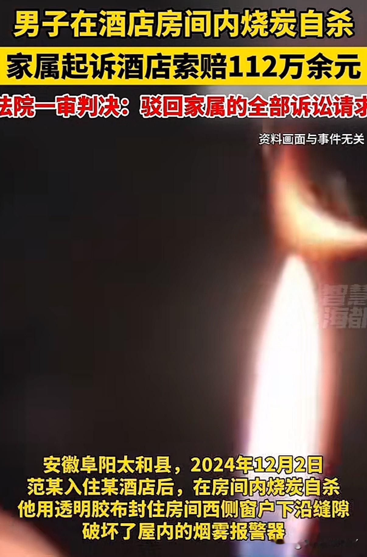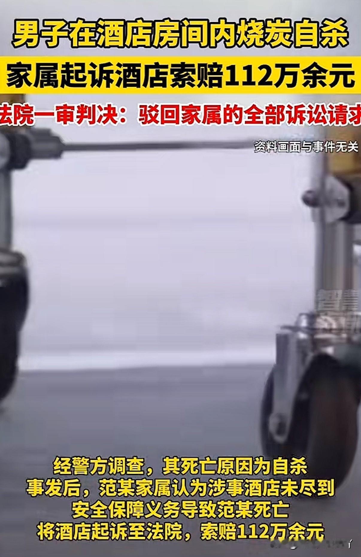 男子酒店烧炭自杀家属起诉酒店赔偿112万被驳回 2024年12月2号安徽阜阳一男子范某办理酒店入住后使用胶带将门窗封住又破坏酒店房间内烟雾报警器点燃自行购买的木炭与碳炉自杀身亡。事后范某家属也酒店方未尽到安全保障义务为由起诉索赔112万,近日法院一审宣判认为酒店方不存在未尽安全保障义务的行为而且范某所留下的遗书中显示疑患抑郁症而且蓄意自杀念头已久故驳回范某家属全部诉讼请求 范某家属这算不算有小博大? 如果官司打赢了范某虽然自杀了但还能换回一大笔赔偿如果官司输了也就是出一点诉讼费,虽然没理但只要告就有机会得一大笔钱不告就肯定没有 不敢想如果这样清晰明确的事实面前还能让他的家属拿到赔偿以后酒店会不会变成自杀圣地,在家里自杀房子变凶宅影响家人然后都去酒店 死者已去活着的人怎么就不能留最后一丝体面呢,为何人性如此贪婪,没有对家人给酒店造成影响有丝毫愧疚就罢了还要起诉试图获得赔偿,真要赔按道理说难道不应该是酒店方向家属索赔吗 接触很多案件后对人性的理解实在过于复杂,三观一次又一次的被击碎,很多事情本就该是这样的怎么有人他就是无法理解呢,有时我会怀疑是不是跟他们生活在同一个世界接受同样的德育教育