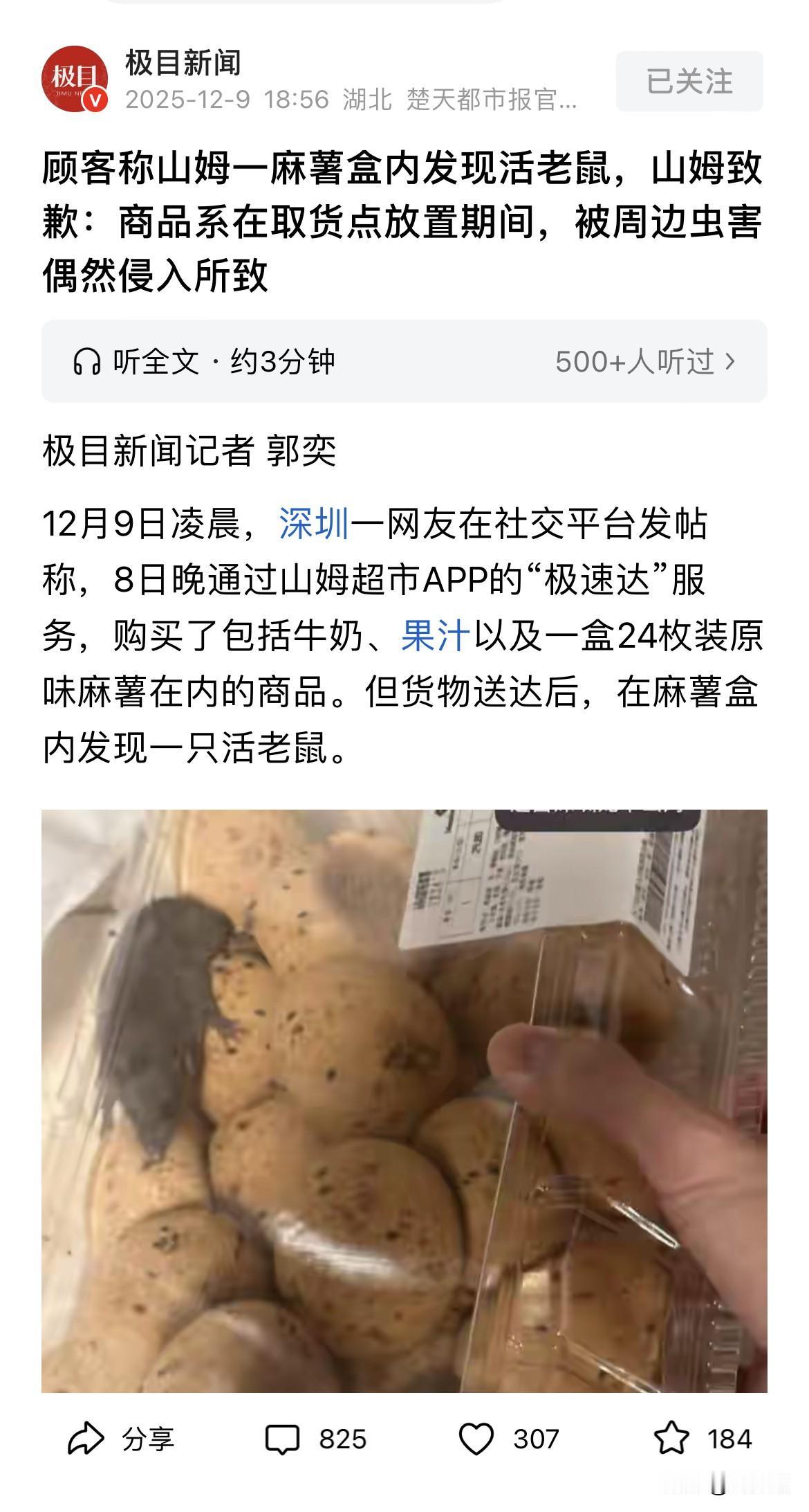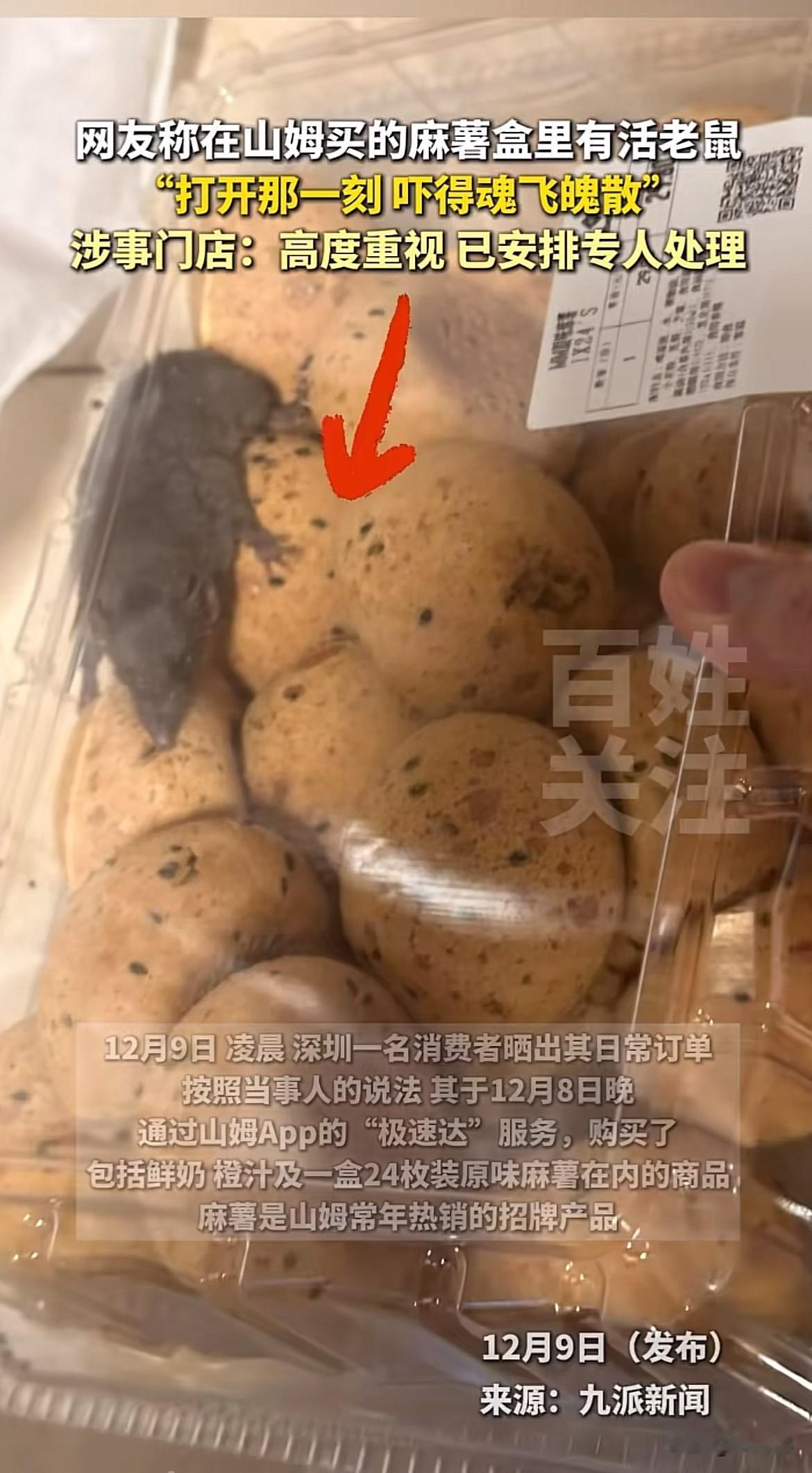深圳山姆麻薯盒出现活老鼠,山姆方面站出来道歉了,网友却为山姆喊冤,打抱不平。 12月9日凌晨,深圳一网友发贴称自己在极速达下单了牛奶、果汁和麻薯等食品,但到货后发现麻薯盒有一只活生生的老鼠,把顾客当场吓得魂飞魄散。 山姆立即排查生产、包装、配送等过程,发现监控均无异常,随后致歉称“商品期货点在室外,周边有花林丛,被周边虫害偶然侵入所致。” 山姆和顾客已协商沟通好,顾客已删帖,但具体协商细节不得而知。 没想到,网友舆论一边倒,为山姆打抱不平,纷纷表示山姆麻薯塑料盒卡得很紧,老鼠不可能轻易进去,更不可能进入后又关上,这不合常理。也有网友说,明显是故意放进去的,为流量博眼球,说好的极力维权,一下子就删帖了,就是为赔偿。 顾客消费发现有问题,找商家维权毋容置疑,但不能胡编乱造,触发法律红线;商家也有责任保障商品的质量和安全,严格控制产品生产、包装、销售、配送等全过程的品质和服务。 对此事你们怎么看?还愿意去山姆消费吗?