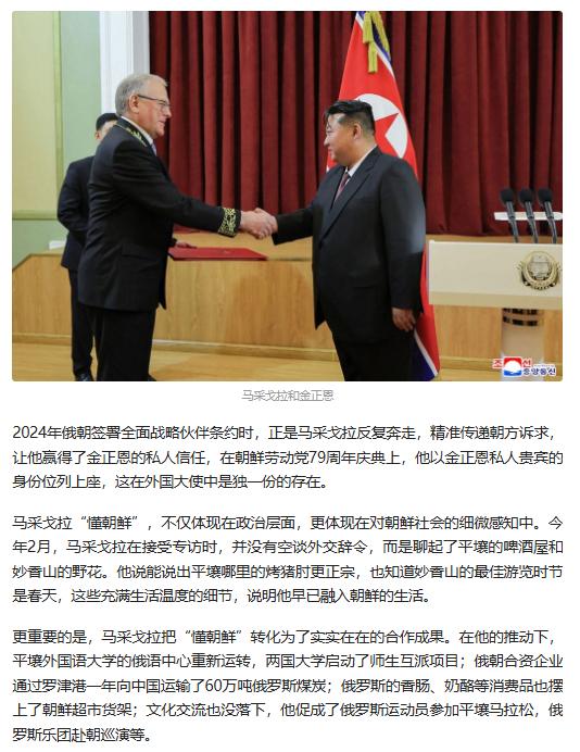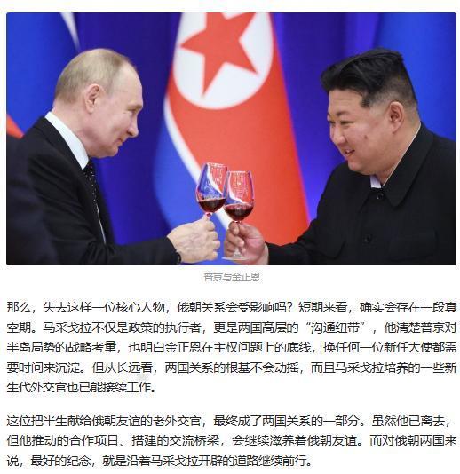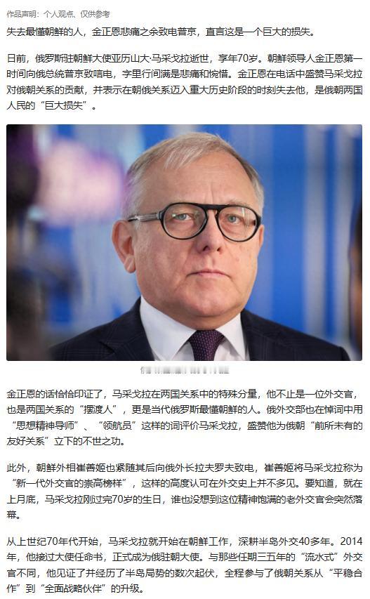 俄驻朝 “摆渡人” 马采戈拉猝然离世,深耕两国外交 40 余年促成全面战略伙伴关系,短期沟通或受影响。 原文来自:华府萝贝贝《失去最懂朝鲜的人,金正恩悲痛之余致电普京,直言这是巨大损失》