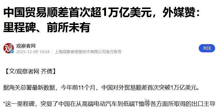 中国贸易顺差突破1万亿美元。 这太猛了! 可笑的是,美国政客们还在做梦呢? 他们加征的关税全砸回自己老百姓头上,超市货架价格飙涨,工人家庭勒紧裤腰带哭诉“活不下去了”! 中国早甩开美国单干,欧盟订单爆满、澳洲矿产抢购、东南亚街头满是国产AI眼镜,连商业航天都火遍全球——美国市场? 早不是香饽饽了! 这哪是贸易战破产,分明是美国经济裸奔现原形:高通胀、低就业,政客甩锅中国却救不了自家烂摊子。 明年A股起飞? 外贸这剂猛药够提神,但真正赢家是觉醒的全球消费者:便宜好货谁不爱? 美国再横,也挡不住世界向前冲!