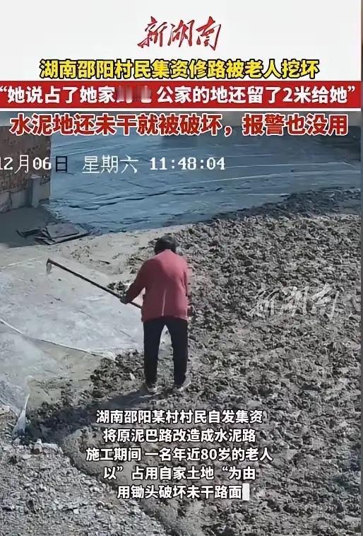 湖南邵阳村民集资修路被老人挖坏,“她占了她家的地 公家的地还留了2米给她”,水泥地还未干就被破坏,报警也没用。 湖南邵阳某村村民自发集资将原泥巴路改造成水泥路,施工期间一名近80岁的老人以“占用自家土地”为由,用锄头破坏未干路面。 这条待修的泥巴路是村里连接外界的唯一主干道,一到雨天就泥泞难行,摩托车都得推着走。去年秋收时,有村民拉着稻谷路过,车轮陷进泥坑,整车粮食都泡了水,这事成了全村人的心结。今年开春,村支书牵头提议集资修路,消息一出,在外打工的年轻人都主动转钱回来,留守老人也把攒下的养老钱拿了出来,短短半个月就凑齐了20多万工程款。施工队进场那天,全村人都到路边看热闹,有人搬来茶水,有人主动帮忙清理路边杂物,大家都盼着水泥路能早点通。 修路涉及的土地协调,村两委提前三个月就开始忙活。老人名下的那块地,原本是村集体早年划分的自留地,紧邻旧路边缘。为了减少占地纠纷,村两委特意调整了路线,不仅没动老人的核心地块,还在公家预留的地界里给她多留了2米宽的空地,方便她平时晾晒农作物。村支书带着村干部上门沟通了五次,老人当时没明确反对,只说“等开工了再说”,大家都以为这事已经谈妥,没成想施工队刚把水泥铺上,老人就扛着锄头赶了过来。 水泥浇筑到老人地块旁的路段时,已经是下午四点多,路面还泛着湿润的光泽。老人突然从路边的菜地里冲出来,举着锄头就往新铺的水泥上砸,刚成型的路面瞬间被刨出几个大坑,白色的水泥浆混着泥土溅得到处都是。施工队负责人赶紧上前阻拦,却被老人推开,她坐在地上哭喊“这是我的地,谁也别想占”,手里的锄头还在不停敲打路面。村民们围过来劝说,有人拿出土地确权文件,有人提起之前预留2米空地的约定,可老人根本不听,只顾着哭喊撒泼。 村支书第一时间报了警,民警赶到后,先安抚了老人的情绪,又查看了相关的土地证明。民警解释说老人的行为已涉嫌故意损毁财物,但考虑到她年纪大且没有造成重大后果,只能先进行口头教育和调解,没法采取强制措施。看着被破坏的路面,施工队负责人直叹气,刚铺的水泥没法修补,只能全部铲掉重新浇筑,不仅要多花三万多块钱,还得延误工期半个月。当晚村两委连夜开会,又凑了一笔钱补上缺口,可村民们心里的疙瘩却解不开了,有人说老人太自私,有人替她惋惜,好好的修路喜事,硬是添了堵。 事后有人打听才知道,老人是听了外地亲戚的挑唆,觉得修路会影响她的菜地采光,还担心以后车辆经过会吵到她。村支书又带着村干部上门,还请来了老人在县城工作的儿子帮忙劝说。老人的儿子看到被破坏的路面,当场就红了眼,对着老人说“全村人都盼着这条路,你怎么能这么糊涂”。老人沉默了半晌,终于松口不再阻拦修路,但对于已经造成的损失,她却表示“没钱赔,也赔不起”。 重新浇筑路面那天,老人远远地站在菜地里看着,没再上前。村民们依旧像之前一样来帮忙,只是没人再和她打招呼。新的水泥路通车时,全村人都放了鞭炮,可热闹的人群里,没人再提起老人的名字。有人说老人年纪大了认死理,也有人说集体利益面前,个人诉求得有边界,这件事在村里成了长久的话题。 乡村建设的推进需要集体共识和个体包容,土地纠纷的化解不能只靠硬性规定,更要打通人心的隔阂。 各位读者你们怎么看?欢迎在评论区讨论。