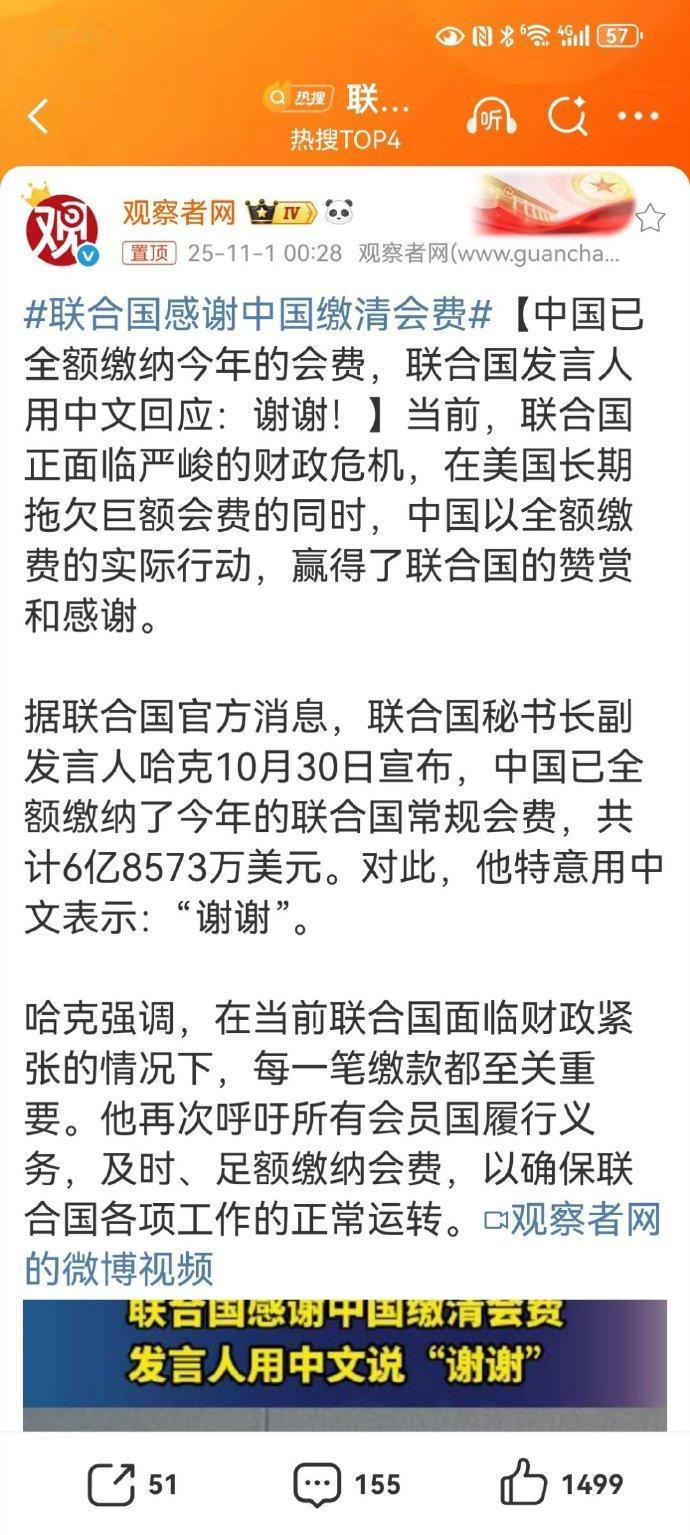 不为正义发声: 不为二战成果站台, 联合国的费用你们自己想办法。 中国付出巨大牺牲才换来如今局面,缴纳巨额会费是为正义,若联合国无视这些,那会费花得实在不值,应让该负责的国家承担。 那些拖欠会费的国家,享受着和平红利,却不正视历史。 还让负责任的国家为他们的行为买单,这实在不公平,联合国得有个说法。 联合国秘书长古特雷斯10月提交的预算方案里,一句“再不缴会费就要破产”的警告,把这个全球最大国际组织的尴尬摆上了台面。截至9月底,2025年的会费只收到66.2%,比去年同期少了12个百分点。 可就在各国拖欠金额高达15.86亿美元的时候,中国作为第二大会费国,早就按规定缴清了今年超过3亿美元的常规预算分摊款——相当于141个足额缴费国总额的18%,而美国一家就拖欠着8.26亿美元当年会费——这个数字,足够维持联合国近半年的维和行动燃料消耗。 这种对比刺痛的不仅是账本。当联合国因15.86亿美元欠费被迫削减19%行政预算、13%维和规模时,受影响的是刚果(金)难民营的粮食供应,是也门儿童的疫苗冷链,是叙利亚停火谈判的翻译团队。 反观拖欠国一边享受着安理会常任理事国的决策权,一边让中国为其海外军事存在的"国际责任"买单,这种错位在苏丹冲突中尤为明显:2025年联合国维和部队因经费不足缩减30%兵力时,中国维和工兵分队仍在独自抢修被炸毁的喀土穆机场。 更深层的矛盾在于历史正义的消解。联合国总部那座"铸剑为犁"的雕塑,基座下埋着中国远征军将士的忠魂。1943年开罗会议,中国坚持将"日本窃取的中国领土归还"写入宣言,为战后秩序奠定法理基础;1945年旧金山制宪会议,中国代表顾维钧力主在宪章中加入"禁止种族歧视"条款,这些努力让联合国区别于国联的强权逻辑。 但今天,当拖欠会费的国家在涉乌、涉巴问题上玩弄双重标准,当维和行动因经费不足沦为"选择性干预",宪章精神正在被架空。中国连续五年全额缴费,某种程度上是在为78年前的承诺续命——我们不能让东条英机受审的法庭,变成今天某些国家的逃费天堂。 财政危机的背后,是责任体系的崩塌。根据会费比额公式,中国的分摊比例从2010年的3.19%跃升至2025年的12.01%,这个数字的背后是14亿人从人均GDP1000美元到1.2万美元的跨越,但人均GDP仍不足美国的1/6。反观欠费大国,美国以22%的最高比例连续15年拖欠,俄罗斯2025年欠费达2.13亿美元,这些国家的欠费总额,相当于中国2025年会费的2.3倍。 更微妙的是,当联合国因欠费计划裁减亚太经社会30%员额时,这些被裁岗位大多涉及"发展中国家技术援助",而欠费国的驻联合国代表团,却仍在享受着每年200万美元的外交豁免燃油补贴。 这种"吃肉不啃骨头"的游戏,正在透支联合国的合法性。2025年全球和平指数显示,59场国家间冲突中,73%发生在联合国维和力量薄弱的非洲和中东,而这些地区的维和预算,恰恰被欠费国以"财政困难"为由压缩。中国在马里的维和部队,2025年因经费延迟两个月发薪,却仍在恐怖袭击高发区巡逻——这种反差,让"大国责任"四个字在中国身上显得格外沉重。 当古特雷斯秘书长在预算会议上恳请"会员国想想维和士兵的工资单"时,台下拖欠会费的代表们,或许忘了1950年中国人民志愿军在朝鲜战场,正是为了守护这种"不让战火蔓延"的联合国理想而流血。 历史不会忘记,1945年6月26日,董必武在宪章上签字时,笔尖划过的不仅是纸张,更是一个民族对持久和平的期许。今天中国的每一分会费,都是在向当年那个在南京废墟上重建的联合国投信任票。但当拖欠成为常态,当正义需要靠"足额缴费"来证明,联合国就该问问:那些在二战中用生命奠基的国家,凭什么要为逃避责任的行为买单?这种追问,不是斤斤计较的会费博弈,而是对"战后秩序是否还姓'公'"的终极叩问。
