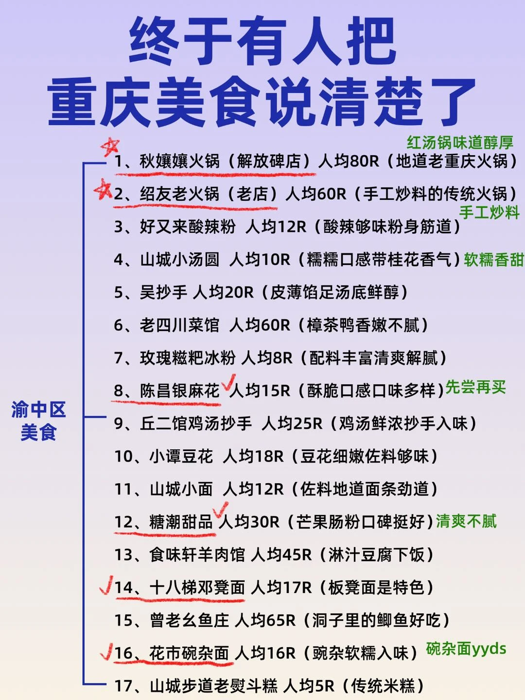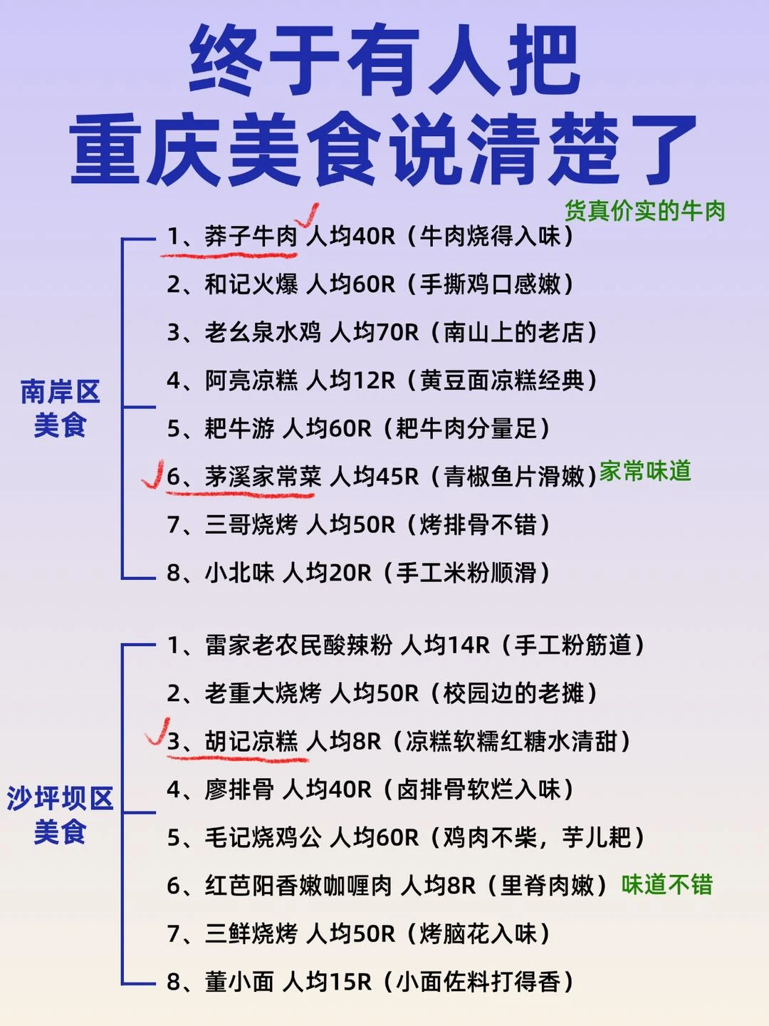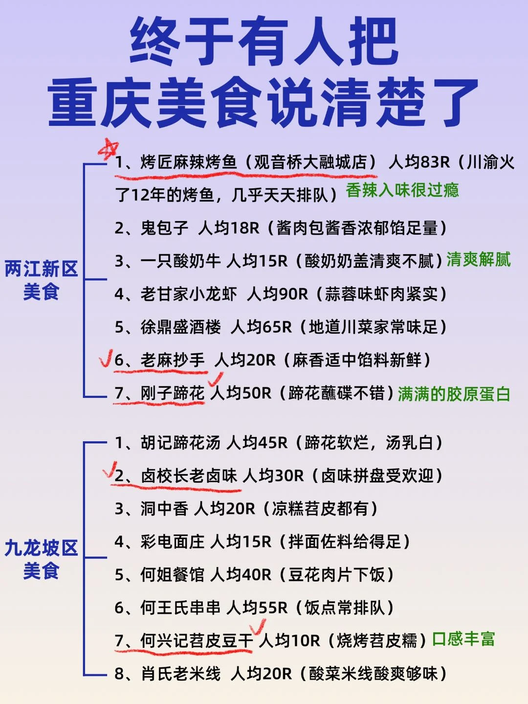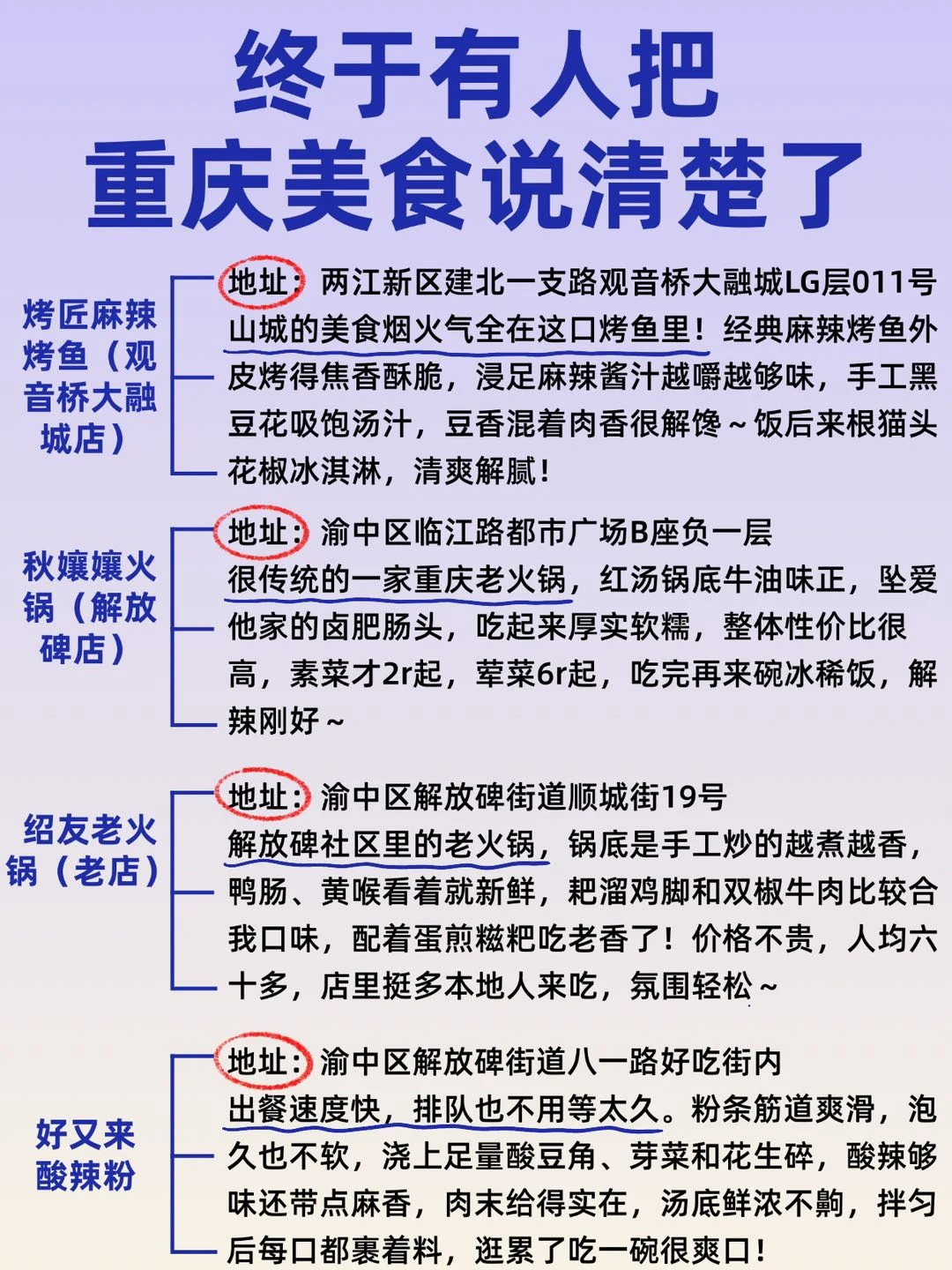 计划来重庆游玩的姐妹们👭给大家按重庆各区整理了一份详细的重庆美食攻略🍲来重庆不知道吃什么的就看这篇就对啦🥳都是本地人常吃的地道馆子😋有需要的赶紧码住呀~