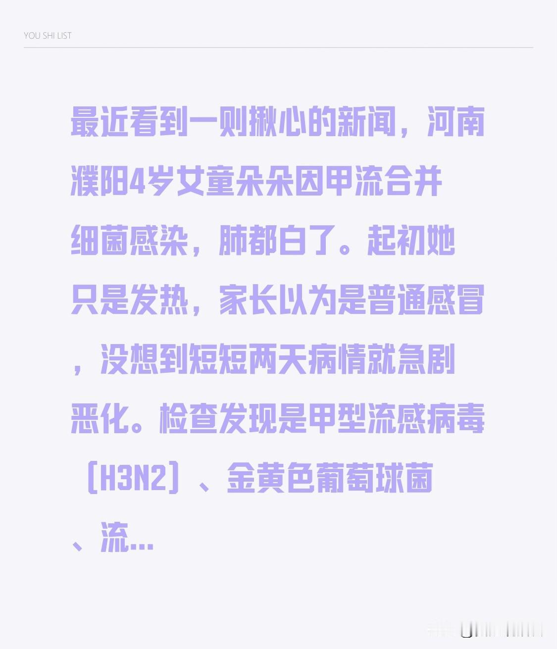 最近看到一则揪心的新闻,河南濮阳4岁女童朵朵因甲流合并细菌感染,肺都白了。起初她只是发热,家长以为是普通感冒,没想到短短两天病情就急剧恶化。检查发现是甲型流感病毒(H3N2)、金黄色葡萄球菌、流感嗜血杆菌“三重打击”,引发严重肺部感染,发展成急性呼吸窘迫综合征。 当地医院用了各种常规治疗手段都没用,朵朵血氧饱和度只能维持在80%-85%。危急时刻,河南省儿童医院ECMO团队携“人工肺”跨市救援。医生提醒,流感高发季,孩子一旦持续高热、呼吸困难,得赶紧就医,千万别像朵朵家长一样掉以轻心。