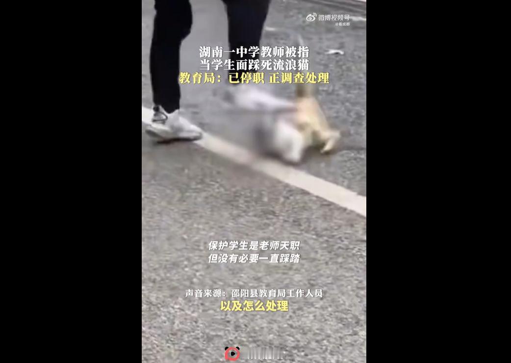 12 月 10 日,湖南邵阳县二中有位体育老师,因为自家娃逗校园里的胖橘猫被咬伤,居然当着一群学生的面,反复踩橘猫脑袋把它踩死了。 这橘猫在学校待挺久,学生常喂它,早就养得圆滚滚。 教育局说保护学生没错,但没必要一直踩,先把老师停职调查,网友都吐槽这老师太狠没师德,还怕教坏小孩。 这位体育老师怕不是把 “体育课” 上成 “暴力示范课” 了? 娃被猫咬了,哪怕拎去角落教育两句、找校工挪走都行,结果他偏选最 “血腥” 的操作,当着学生面跺猫脑袋,这是想给娃 “报仇”,还是想在学生面前耍威风啊? 再说当老师的,连只胖橘都容不下,难道指望他对调皮学生有耐心? 体育老师该教 “公平竞争”,他倒好,用 “以大欺小” 现身说法,这课谁受得了! 教育局就给个 “停职调查”,跟挠痒痒似的。要是这种没爱心、还爱耍横的老师继续留着,保不齐下次就不是踩猫,而是对学生甩脾气了,想想都替学校的娃捏把汗!