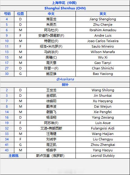 马纳法、特谢拉、路易斯、阿马杜全部首发,阿苏埃替补。谢鹏飞、戴伟浚进大名单。上海申花广岛三箭vs上海申花