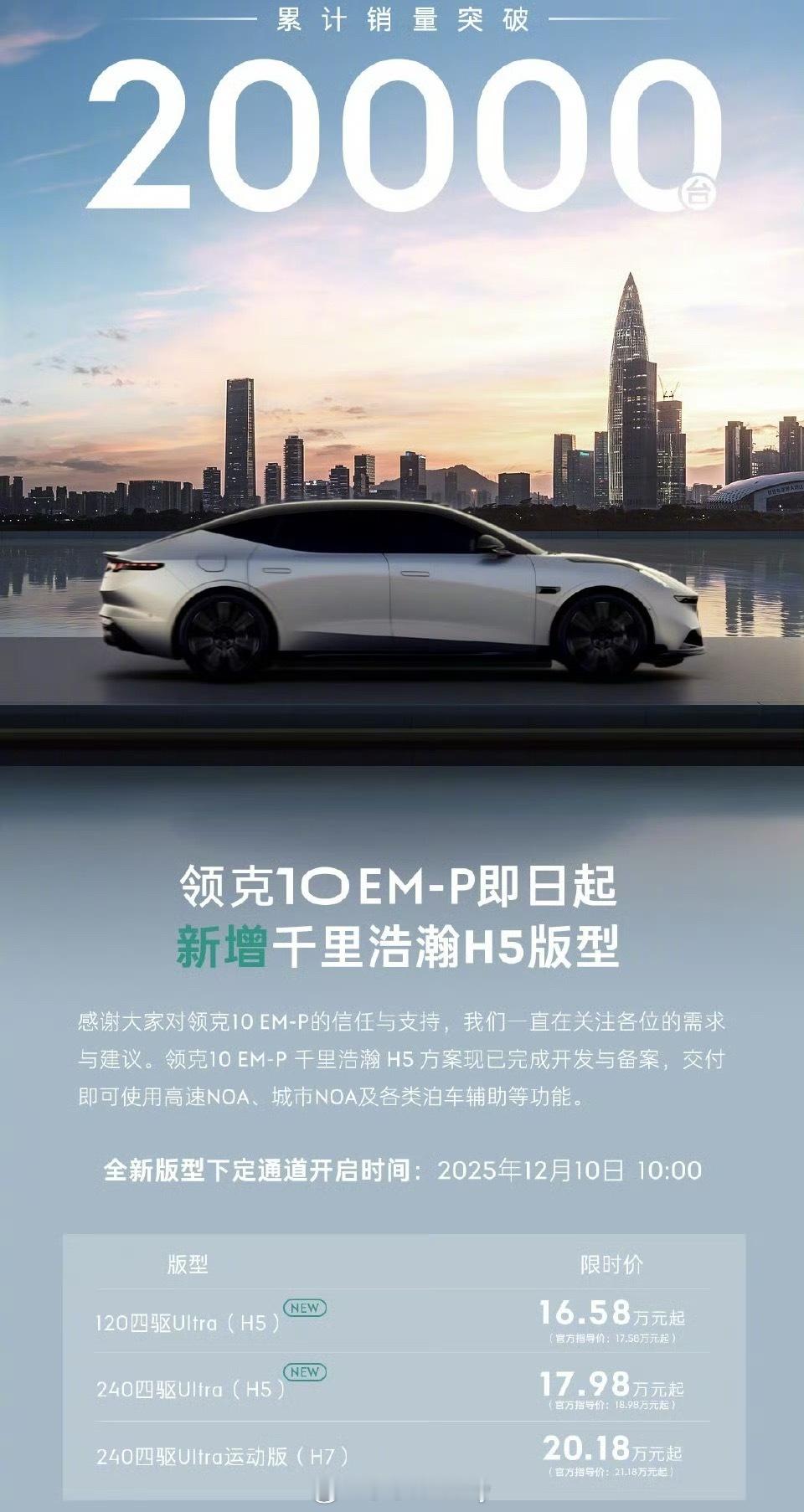 领克10EM-P销量快速突破2万 这个销量大家想到了吧我觉得大家之前对于轿跑不好卖没市场的观念可能还是产品不到位导致销量一般但领克10 EM-P有自己的产品特色三个月的时间销量破2万台还是源自于配置、空间、多场景用车覆盖到位了比如全系标配智能电混四驱、激光雷达、LYNK Flyme Auto 2高配置下方+新配置上车这次乘胜追击在于价格的新增千里浩瀚H5版型120四驱Ultra H5限时价16.58万元起240四驱Ultra H5限时价17.98万元起主持高速NOA、城市NOA以及各类泊车辅助等新版本价格上也有优势了你们觉得?如何