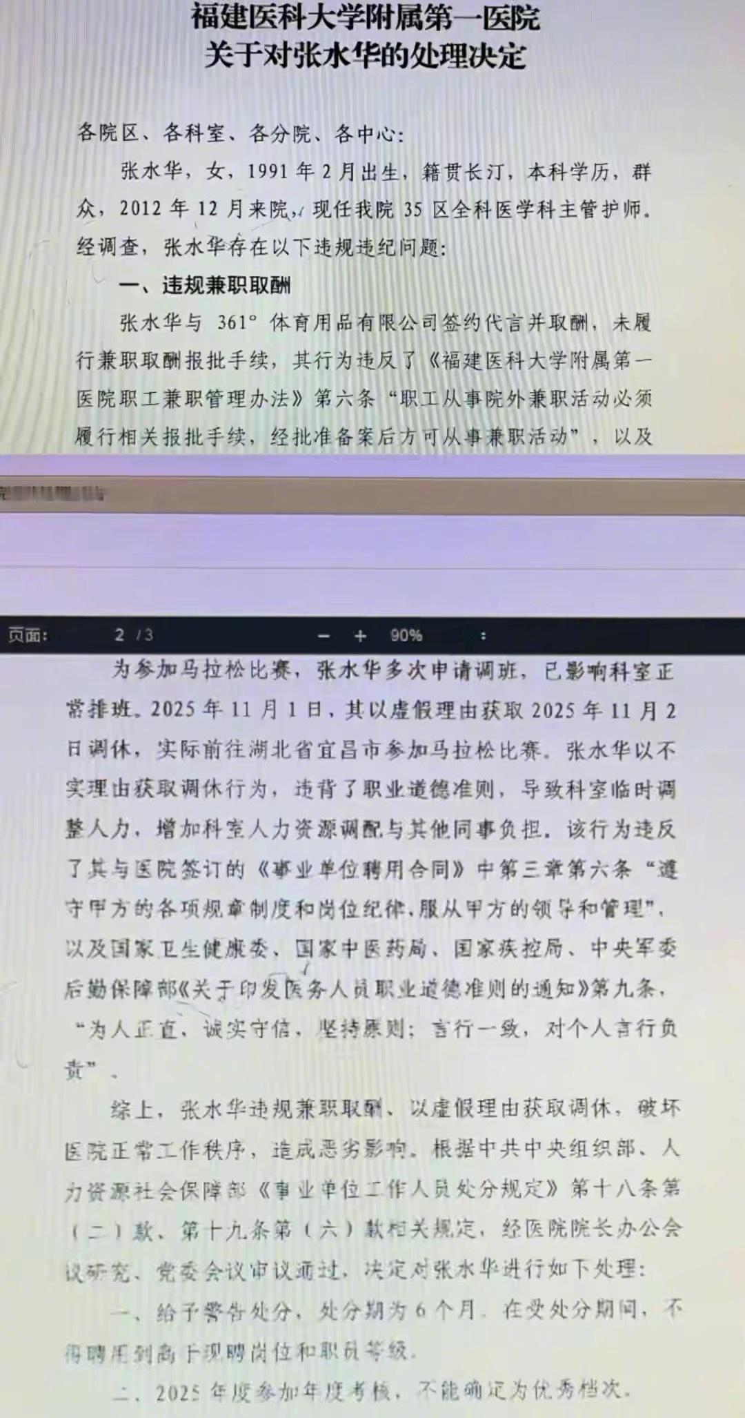 医院回应最快女护士张水华被处分最快女护士张水华被医院处分热点解读 平心而论,福建医科大学附属第一医院对护士张水华作出的处分,算相对温柔。换个私立医院或公司,早被开除了。之所以引起巨大反响,主要是一些个体——尤其是牛马对繁重劳动和低人权待遇的情绪爆发——支持张水华其实就是声援那个平时被机构强权压制的自己。理性一点看,也再次将“员工个人成就与单位管理边界”推上舆论风口。争议之所以巨大,是因为她既是凭实力屡夺马拉松冠军的“励志人物”,也是医疗岗位上肩负责任的专业人员,两种身份在规则冲突中被同时放大。争议的核心在于规则意识与公众情绪的冲撞。一方面,医疗行业排班严密、岗位不可替代,张水华以虚假理由调休,不仅影响科室运行,也破坏同事间的信任,这是任何单位都无法接受的底线。另一方面,她高频参赛、屡获奖金,使其行为更像“职业运动员”,公众更容易将其视为个人奋斗的象征,而忽视其身处的特殊岗位要求。其次,兼职代言未报批引发第二重争议。医院作为公共事业单位,对外接合作需要统一管理,张水华与品牌签约、取酬却未履行程序,容易造成个人与机构形象混同,甚至被误解为医院背书。这场风波暴露了部分单位缺乏完善的员工外部活动规范;而个体明星化与机构纪律之间的矛盾被放大,引发专业群体对“劳务边界”的讨论。就警告6个月、取消当年评优,属于较轻但具有教育性的处理而言,兼顾了纪律性与舆论温度,整体相对适当——但这是一个双输的结果,相当令人遗憾。医院如果有足够管理智慧的话,或能找到更好解决方案。