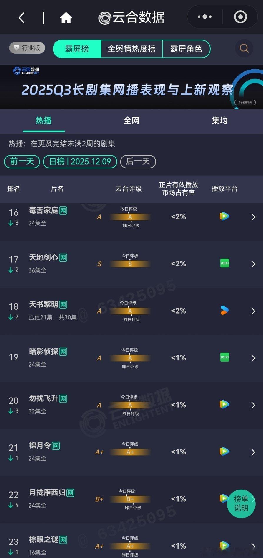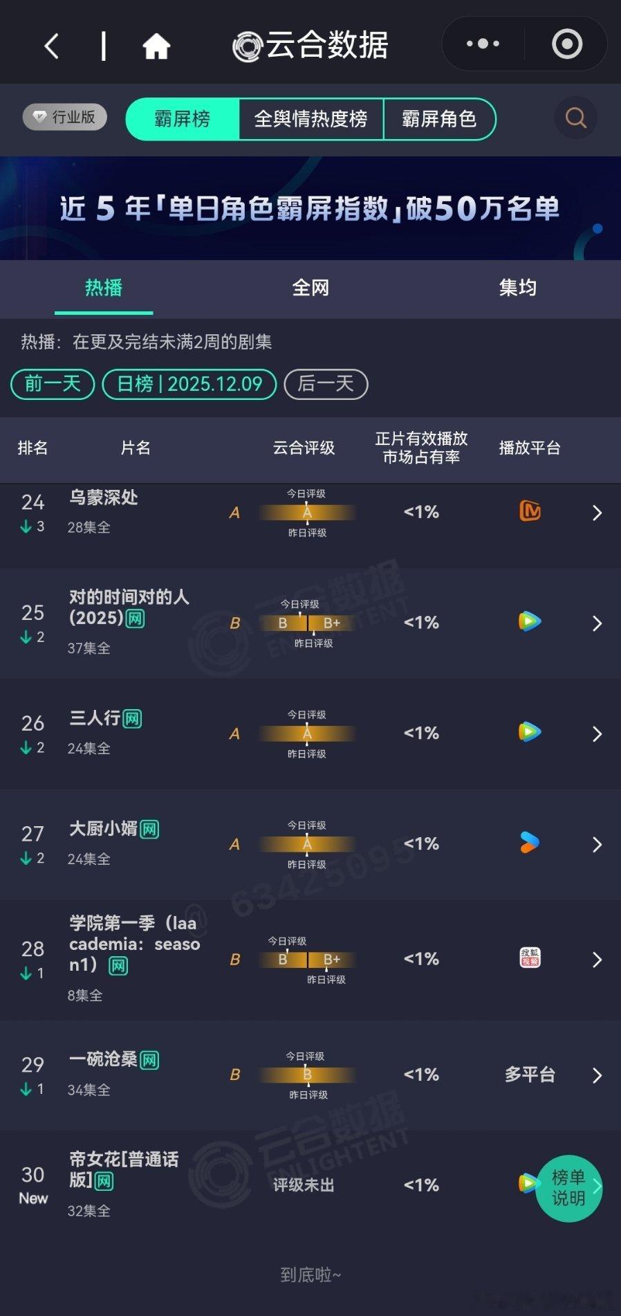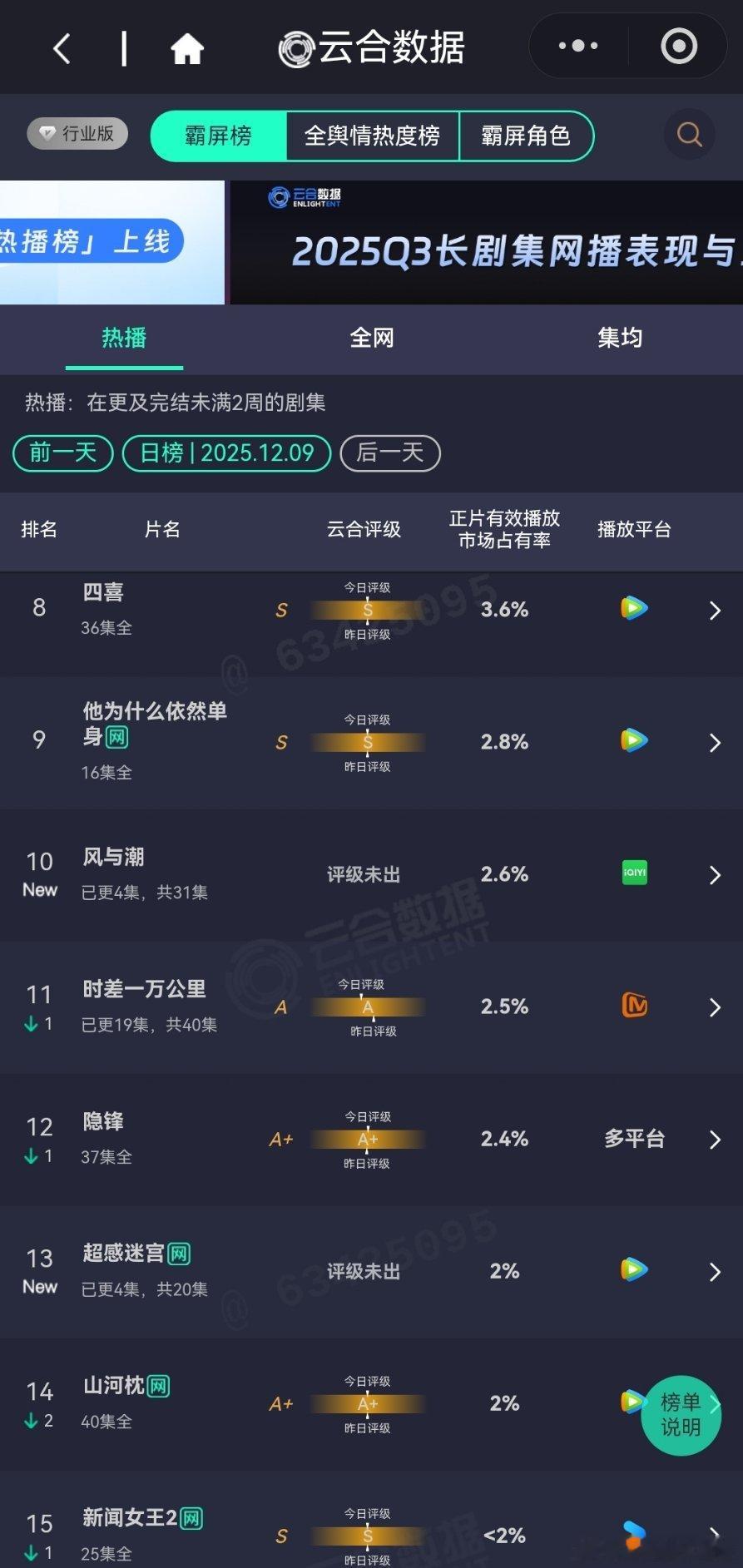 12月9日云合播放占比云合 大生意人云合20.6%大生意人 稳住了,台网都播得不错。风与潮2.6%电视剧风与潮 晚上八点才播,非会员十点才更新,这个水平算不错的开局。