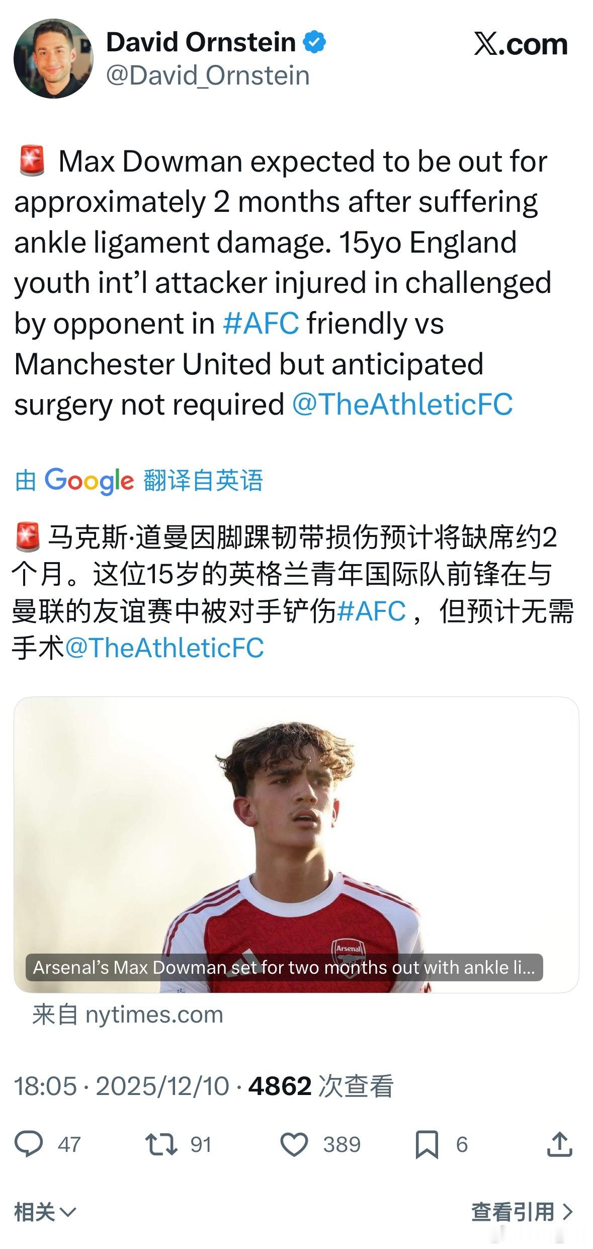 David Ornstein:道曼因脚踝韧带受伤将预计缺阵两个月