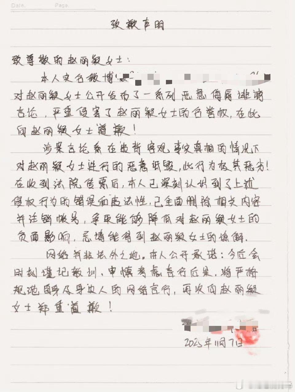 侵犯赵丽颖权利的人给赵丽颖手写道歉信了