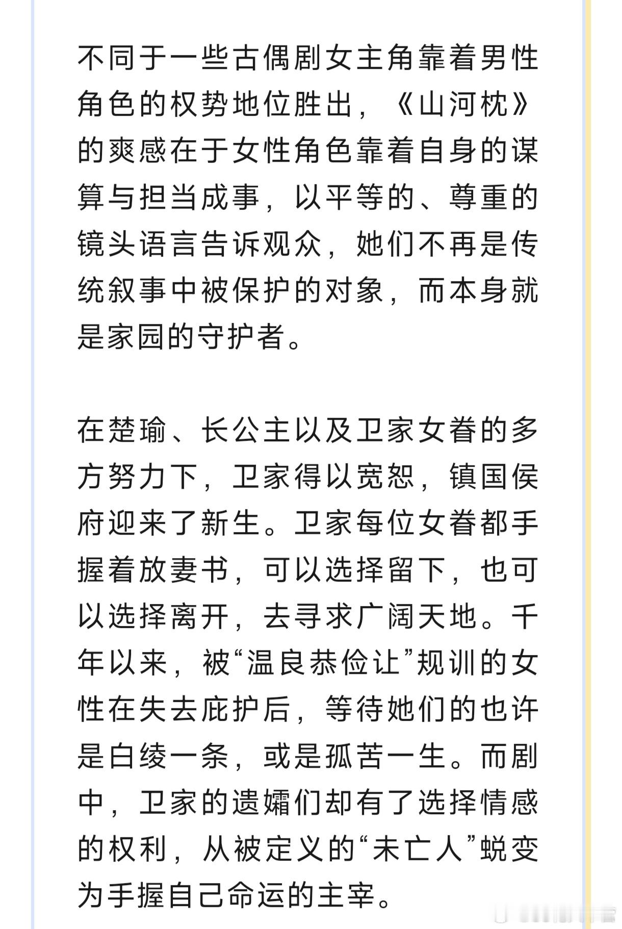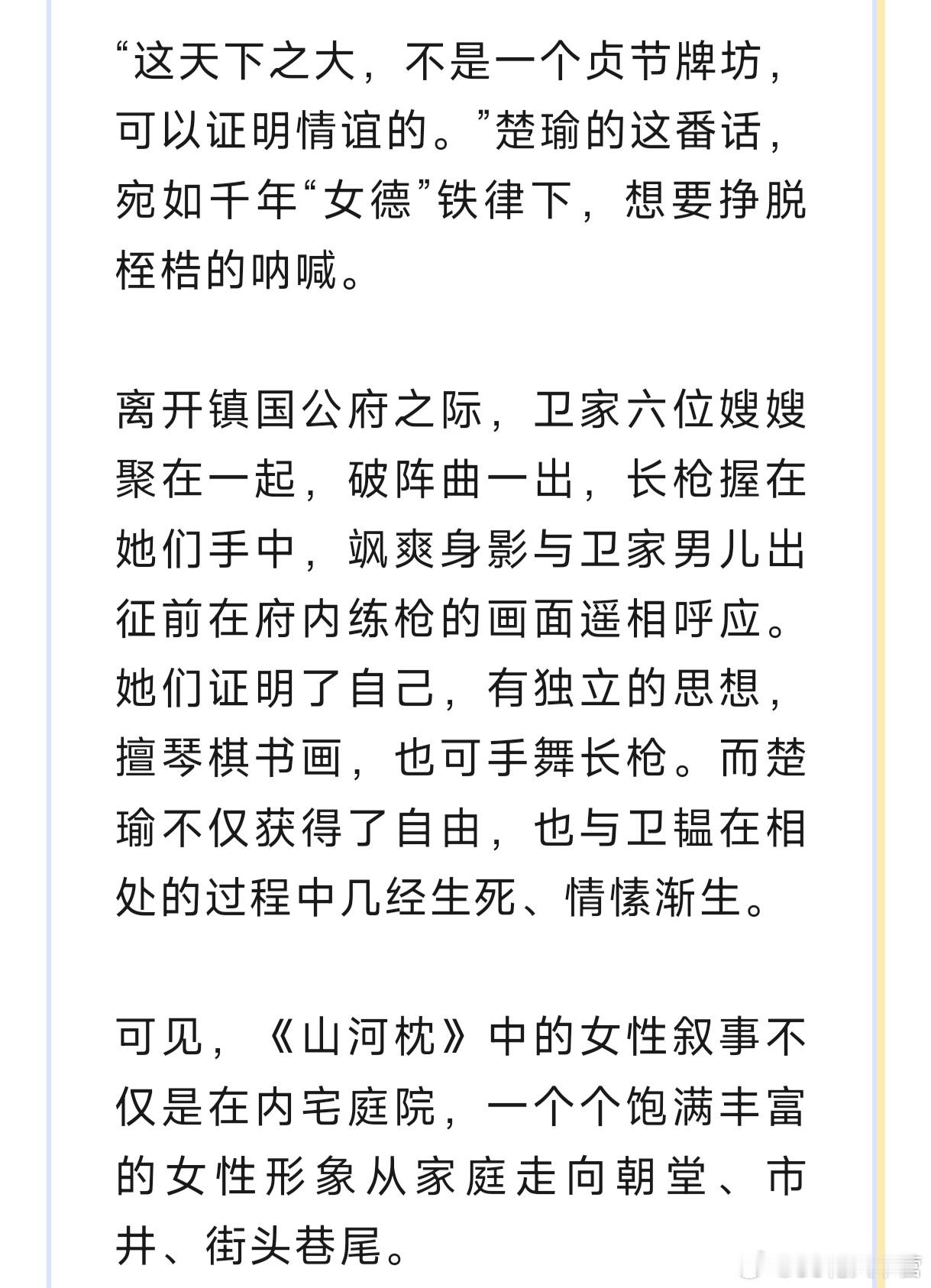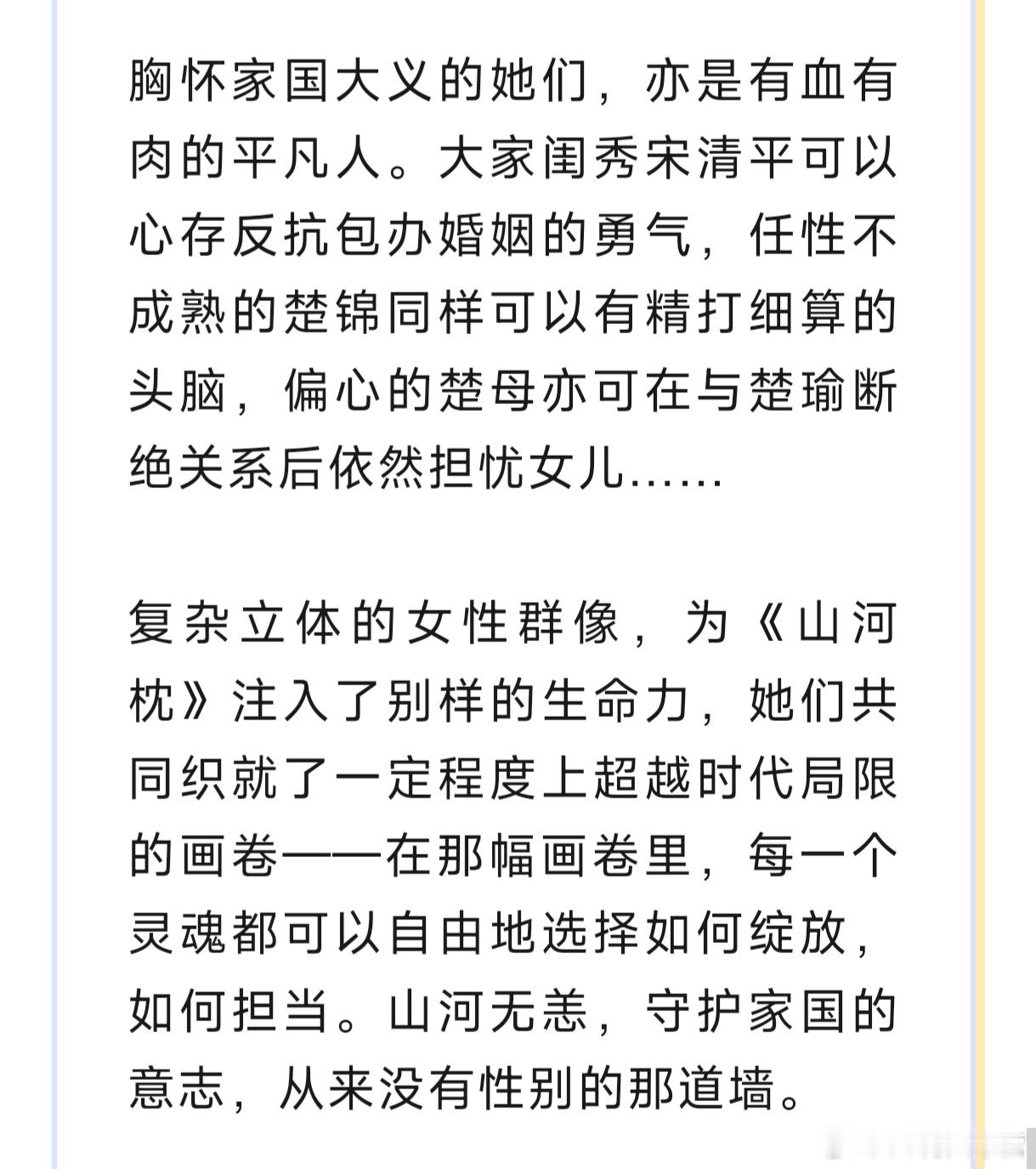 【中国妇女报】“她们”的守护与担当——评《山河枕》中女性群像的塑造!《山河枕》中,立体而复杂的女性形象共同织就了一定程度上超越时代局限的画卷——在那幅画卷里,每个灵魂都可以自由地选择如何绽放,如何担当。不同于一些古偶剧女主角靠着男性角色的权势地位胜出,《山河枕》的爽感在于女性角色靠着自身的谋算与担当成事,以平等的、尊重的镜头语言告诉观众,她们不再是传统叙事中被保护的对象,而本身就是家园的守护者。“这天下之大,不是一个贞节牌坊,可以证明情谊的。”楚瑜的这番话,宛如千年“女德”铁律下,想要挣脱桎梏的呐喊。复杂立体的女性群像,为《山河枕》注入了别样的生命力,她们共同织就了一定程度上超越时代局限的画卷——在那幅画卷里,每一个灵魂都可以自由地选择如何绽放,如何担当。山河无恙,守护家国的意志,从来没有性别的那道墙。山河枕宋茜山河枕