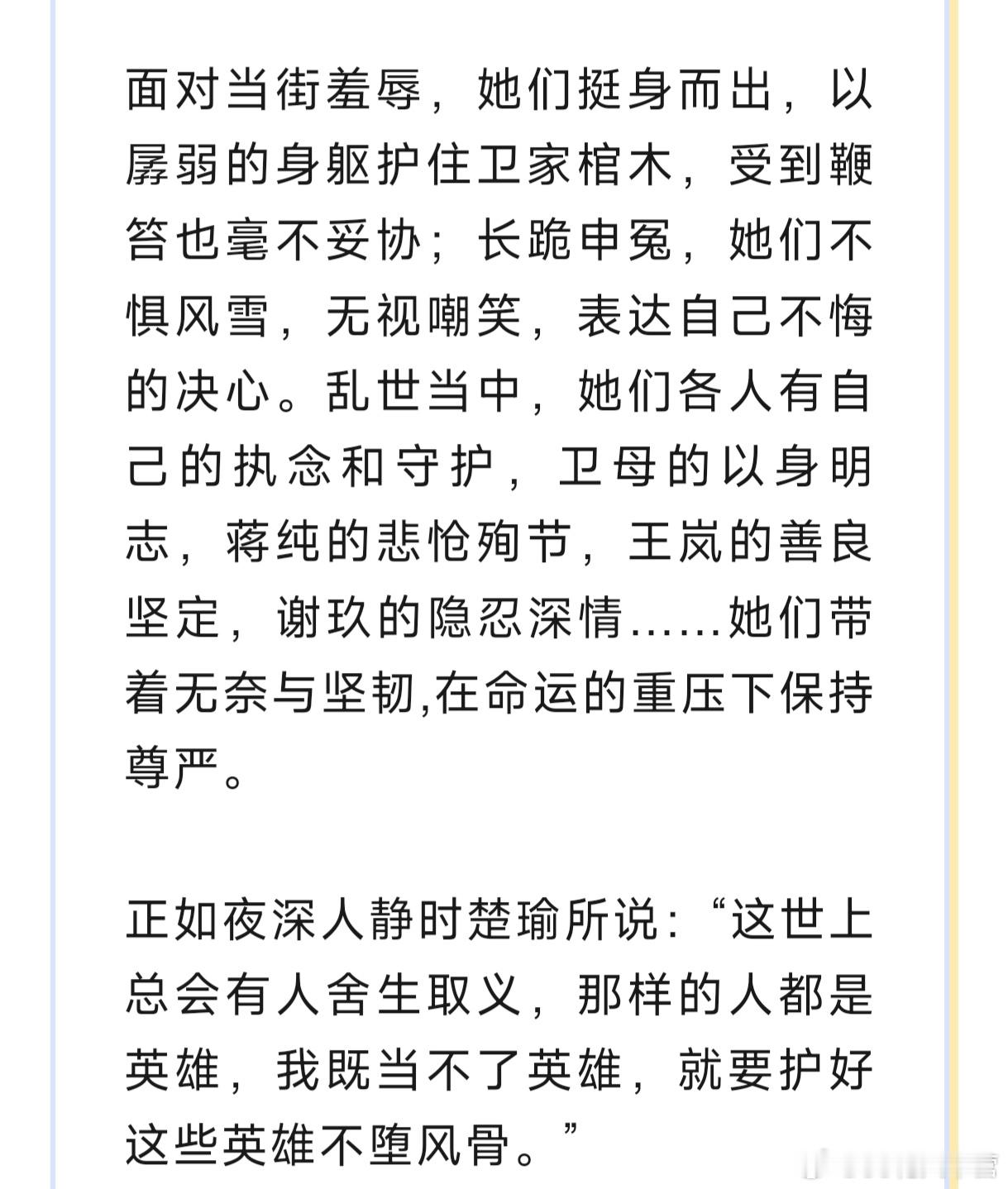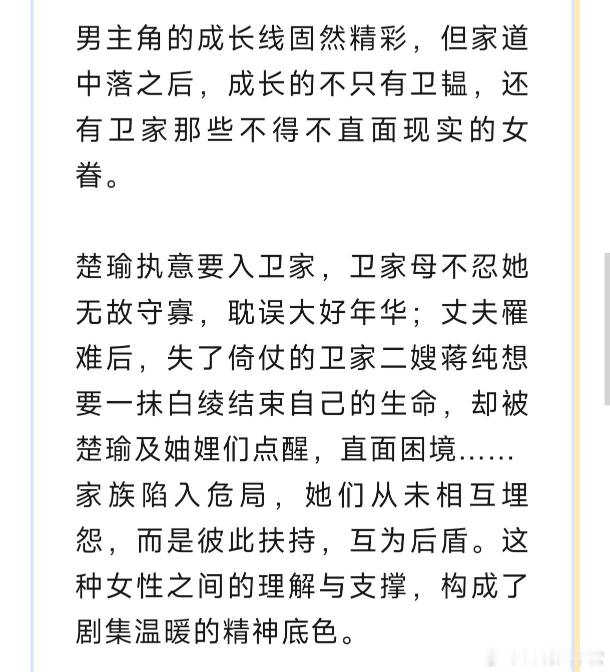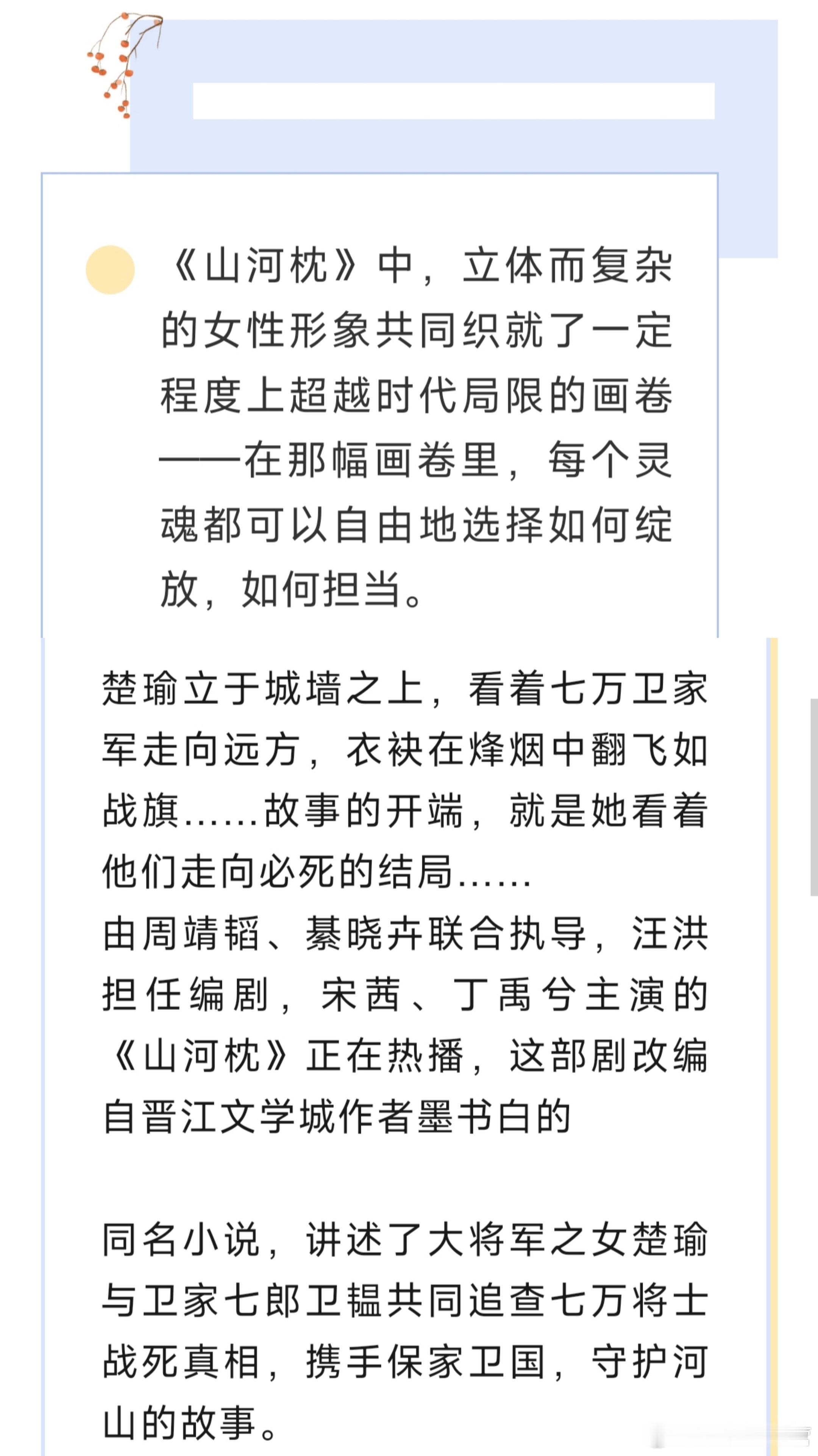 【中国妇女报】“她们”的守护与担当——评《山河枕》中女性群像的塑造!《山河枕》中,立体而复杂的女性形象共同织就了一定程度上超越时代局限的画卷——在那幅画卷里,每个灵魂都可以自由地选择如何绽放,如何担当。不同于一些古偶剧女主角靠着男性角色的权势地位胜出,《山河枕》的爽感在于女性角色靠着自身的谋算与担当成事,以平等的、尊重的镜头语言告诉观众,她们不再是传统叙事中被保护的对象,而本身就是家园的守护者。“这天下之大,不是一个贞节牌坊,可以证明情谊的。”楚瑜的这番话,宛如千年“女德”铁律下,想要挣脱桎梏的呐喊。复杂立体的女性群像,为《山河枕》注入了别样的生命力,她们共同织就了一定程度上超越时代局限的画卷——在那幅画卷里,每一个灵魂都可以自由地选择如何绽放,如何担当。山河无恙,守护家国的意志,从来没有性别的那道墙。山河枕宋茜山河枕