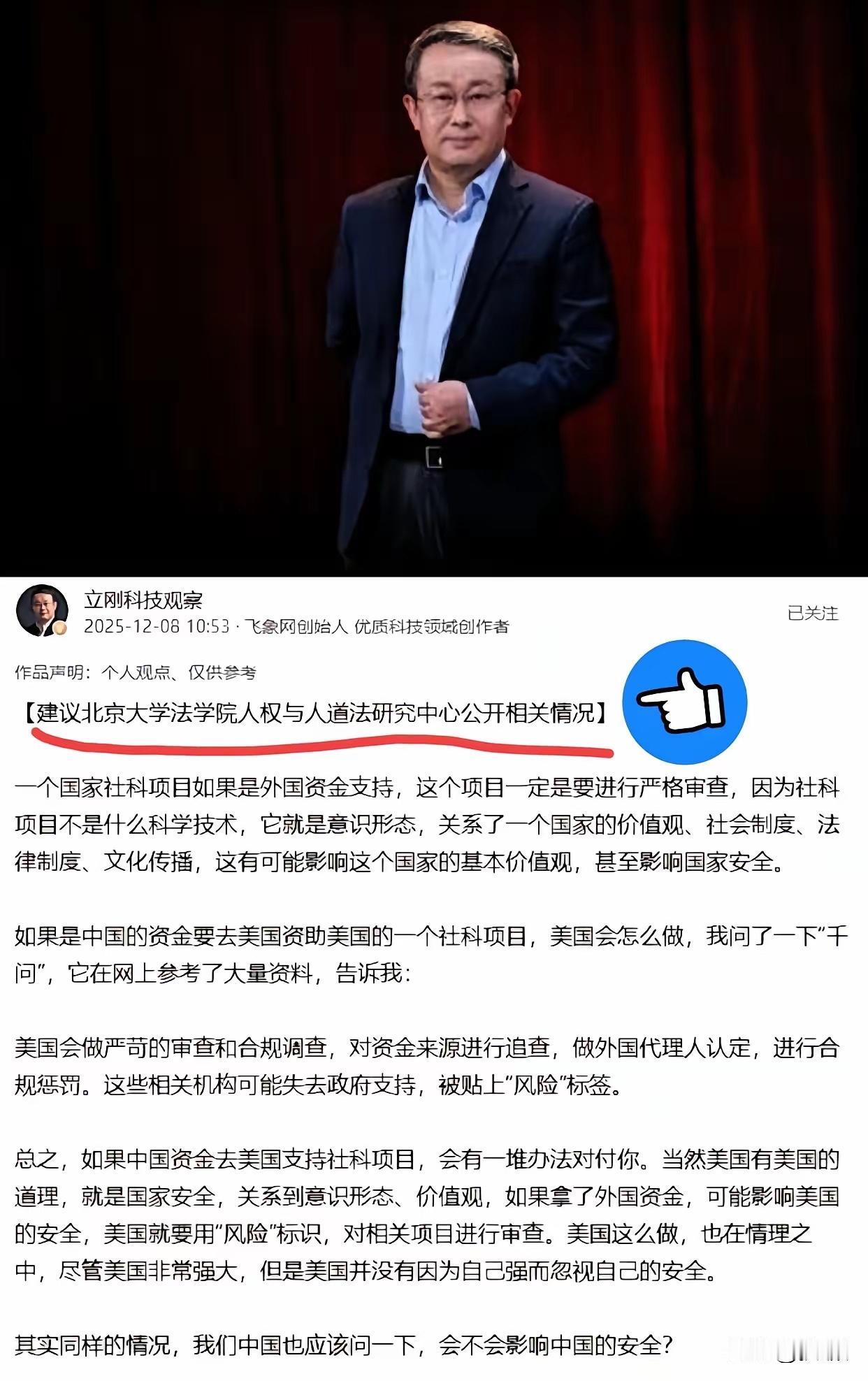 项立刚公开呼吁! 要求北大法学院公开外国学术捐款项目,这把火可烧得旺!依我看,不光北大,所有接受国外政府或非政府组织资金的学校、个人都得公开。 美国和俄罗斯都有外国人代理法案,把接受外国人资金纳入监管,咱为啥就不能借鉴? 项立刚的呼吁能迅速引发全网热议,核心是戳中了大众对学术领域境外资金透明度的关注。这些年国内高校与境外机构的学术合作越来越频繁,资金往来也日趋密切,部分项目因信息不公开,已多次引发公众对学术独立性的质疑。北大法学院作为国内顶尖法学研究机构,其学术立场和研究方向本就备受关注,境外捐款项目的透明度问题被提出后,自然成了舆论聚焦的引爆点。 先看境外资金进入学术领域的现实背景。全球范围内,高校接受境外捐赠本是常见现象,不少资金确实用于推动基础学科研究、国际学术交流等正向领域。但不可忽视的是,部分境外资金带有明确的意识形态倾向或利益诉求。有学术监管领域从业者透露,曾发现某境外非政府组织通过捐赠,要求合作高校将特定议题纳入研究范畴,且研究结论需贴合其预设立场,这种隐性干预已触碰学术独立的底线。 美国和俄罗斯的相关法案,其实早为我们提供了监管范本。美国《外国代理人登记法》要求,接受境外资金并从事相关活动的个人或机构,必须依法登记并公开资金来源和用途,未登记的将面临严厉处罚。俄罗斯的《外国代理人法》则进一步明确,接受境外资金且从事影响国家内政活动的组织,需被标注“外国代理人”身份并接受严格监管。这两部法律的核心逻辑,都是通过强制公开和监管,切断境外势力利用资金干预本土学术、舆论的渠道,且已在实践中取得显著效果。 国内目前并非没有相关监管规则,现有法律和政策已对境外非政府组织在华活动、高校接受境外捐赠等作出框架性要求。但问题在于,部分规则的细化程度不足,执行过程中也存在信息公开不及时、监管覆盖面不全的漏洞。比如高校境外捐款项目,往往仅在内部财务系统登记,公众无法查询具体的资金流向和使用用途;部分个人学者接受境外资金开展研究,甚至未纳入学校统一监管,形成了监管盲区。 公众对境外学术捐款公开的诉求,本质是对学术独立性的捍卫。学术研究本应秉持客观中立立场,若研究项目的资金来源带有特定利益捆绑,其结论的公正性就可能受到影响。曾有某高校学者发表的涉外领域研究报告,因背后存在境外机构资金支持,其结论被质疑偏向资方立场,最终引发学术圈和公众的双重争议。这类事件反复发生,让大家意识到,资金透明度是学术独立的重要前提,没有公开透明的监管,就难有纯粹的学术研究环境。 也有部分声音认为,过度强调境外资金监管会影响国际学术交流。这种担忧并非没有道理,但监管与交流并非对立关系。合理的监管规则,能过滤掉带有干预意图的境外资金,保障正常学术合作的纯粹性。比如可建立分级公开制度,对用于基础学科研究、无附加条件的境外捐款,简化公开流程;对涉及敏感领域、有明确附加要求的资金,则实施严格的全流程公开和监管,既不阻碍正常交流,又能守住学术底线。 还有观点指出,除了高校和学者,部分智库、媒体机构也存在接受境外资金的情况,这类主体同样应纳入监管范畴。毕竟学术领域的境外资金干预只是表象,其最终目的往往是影响社会舆论和公共决策,只有实现全领域的监管覆盖,才能从根本上筑牢防线。 学术领域的境外资金监管本质是守护学术独立与国家利益,建立完善的公开和监管体系是平衡国际交流与本土安全的必然选择。 各位读者你们怎么看?欢迎在评论区讨论。