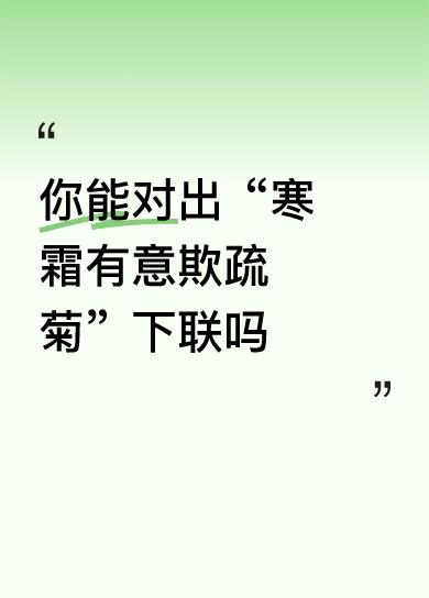 上联:寒霜有意欺疏菊 下联:朔雪无声护瘦梅 拆解赏析: 1. 词性对仗:“寒霜”对“朔雪”(皆为冬日气象名词,质感相近),“有意”对“无声”(一含主观情态,一藏静默状态,虚实相映),“欺疏菊”对“护瘦梅”(动宾短语,“欺”字写出寒霜的凛冽凌压,“护”字衬出朔雪的温柔庇佑,菊与梅呼应,冷暖对比鲜明); 2. 意境呼应:上联绘寒霜凌菊的凛冽之景,透着冬日的冷峻;下联写朔雪护梅的温润画面,藏着生机的守护,一欺一护,一刚一柔,勾勒出冬日里草木与风雪相生相契的别致意境; 3. 格律协调:上联平仄为“平平仄仄平平仄”,下联“仄仄平平仄仄平”,对仗工整,音韵和谐,读来有抑扬顿挫之美。