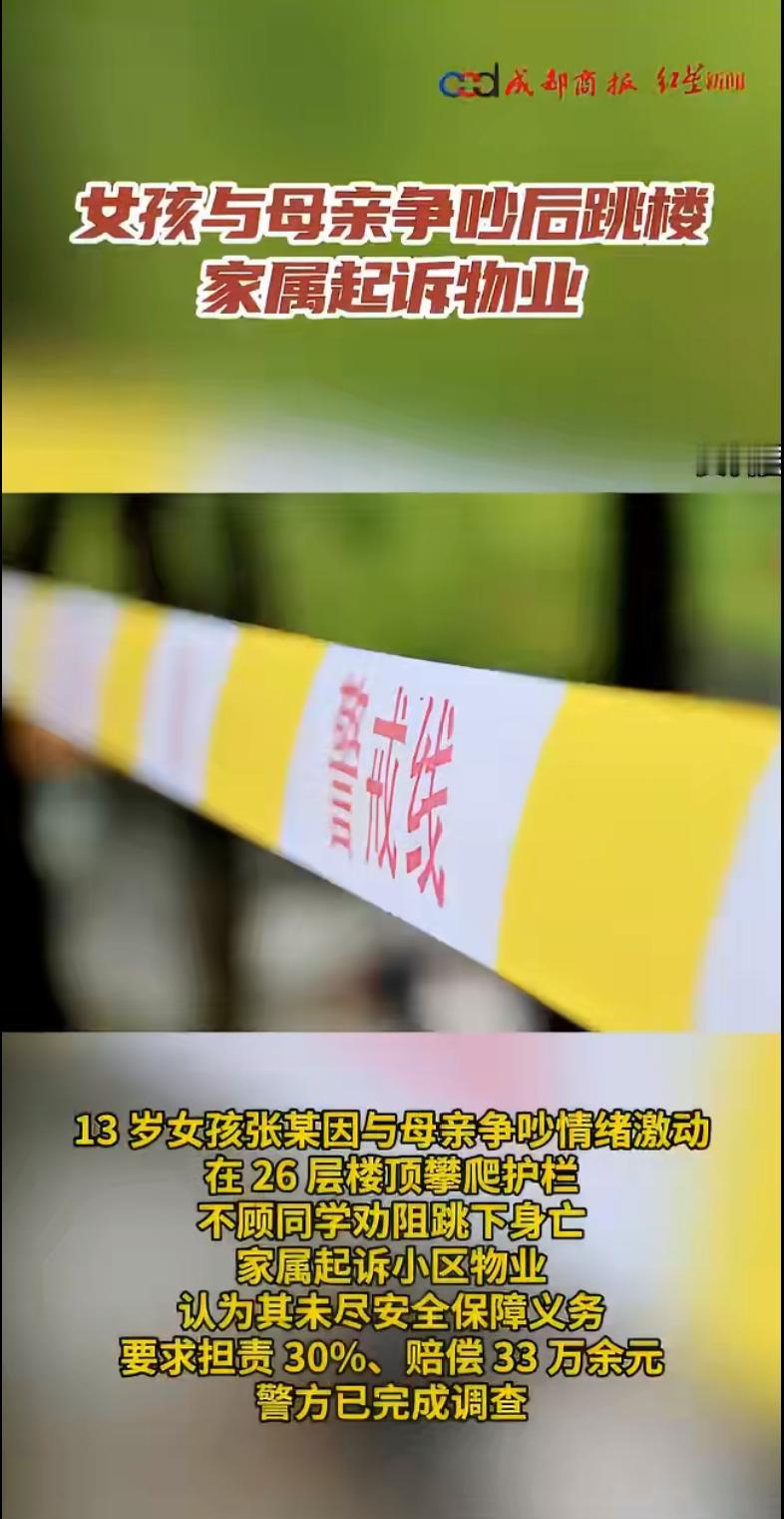 一起令人心痛的事件引发社会关注:一名女孩与母亲争吵后从高楼跳下,家属将物业公司告