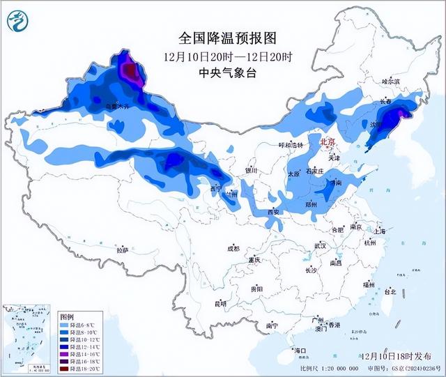 预计,12月10日20时至12日20时,新疆北部、青海北部、甘肃河西、内蒙古中部、东北地区中南部、华北西部和南部、黄淮等地气温下降6~10℃,其中,新疆北部、吉林东南部、辽宁东部等地的部分地区降温可达10~16℃。