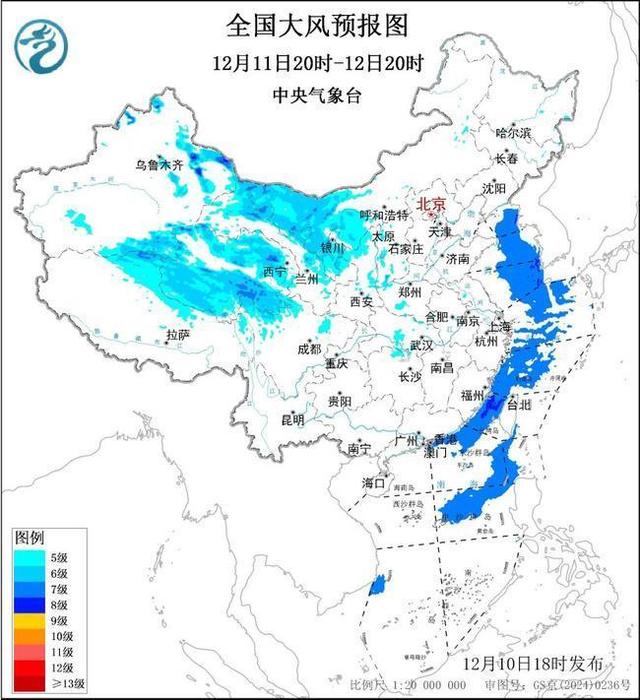预计,12月10日20时至11日20时,新疆北部、甘肃河西、青海南部、内蒙古西部、华北西部、山东半岛、辽东半岛、西藏中北部等地部分地区有5~7级风、阵风8~9级的大风,其中,新疆山口地区阵风可达10~11级;渤海、渤海海峡、黄海大部海域、东海北部海域、台湾海峡、南海中东部海域将有7级、阵风8~9级的大风,其中渤海、黄海北部部分海域风力可达8级、阵风9~10级。