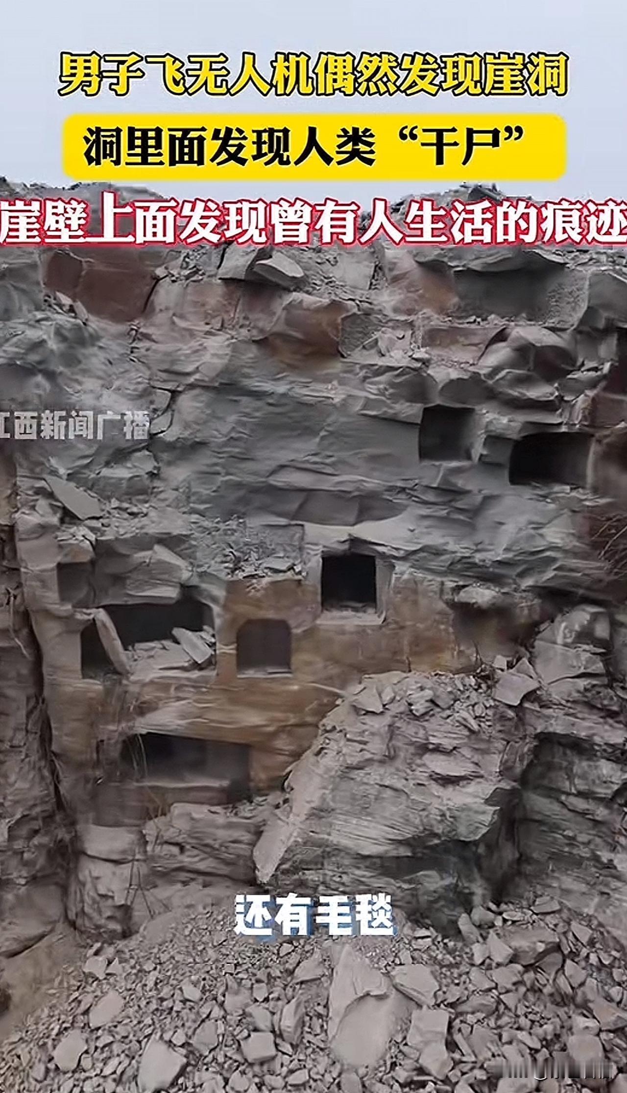 万万没料到,四五十米高的崖洞里竟惊现人类“干尸”,洞内还有被子、矿泉水瓶等物品。