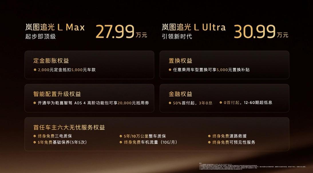 【2025压轴之作,岚图追光L上市,27.99万起】日前,岚图旗舰级轿车追光L正式上市,新车共推出两款车型,其中Max 版 27.99 万、Ultra 版 30.99 万,新车配有行业独有的 800V 超混 + 5C 超充 + 63kWh 大电池,搭配华为乾崑智驾 ADS 4 与鸿蒙座舱,并且拥有1400km 综合续航和12 分钟快充,新车作为岚图的收官之作,也将进一步充实岚图在轿车细分市场的整体实力。 岚图追光 L 上市