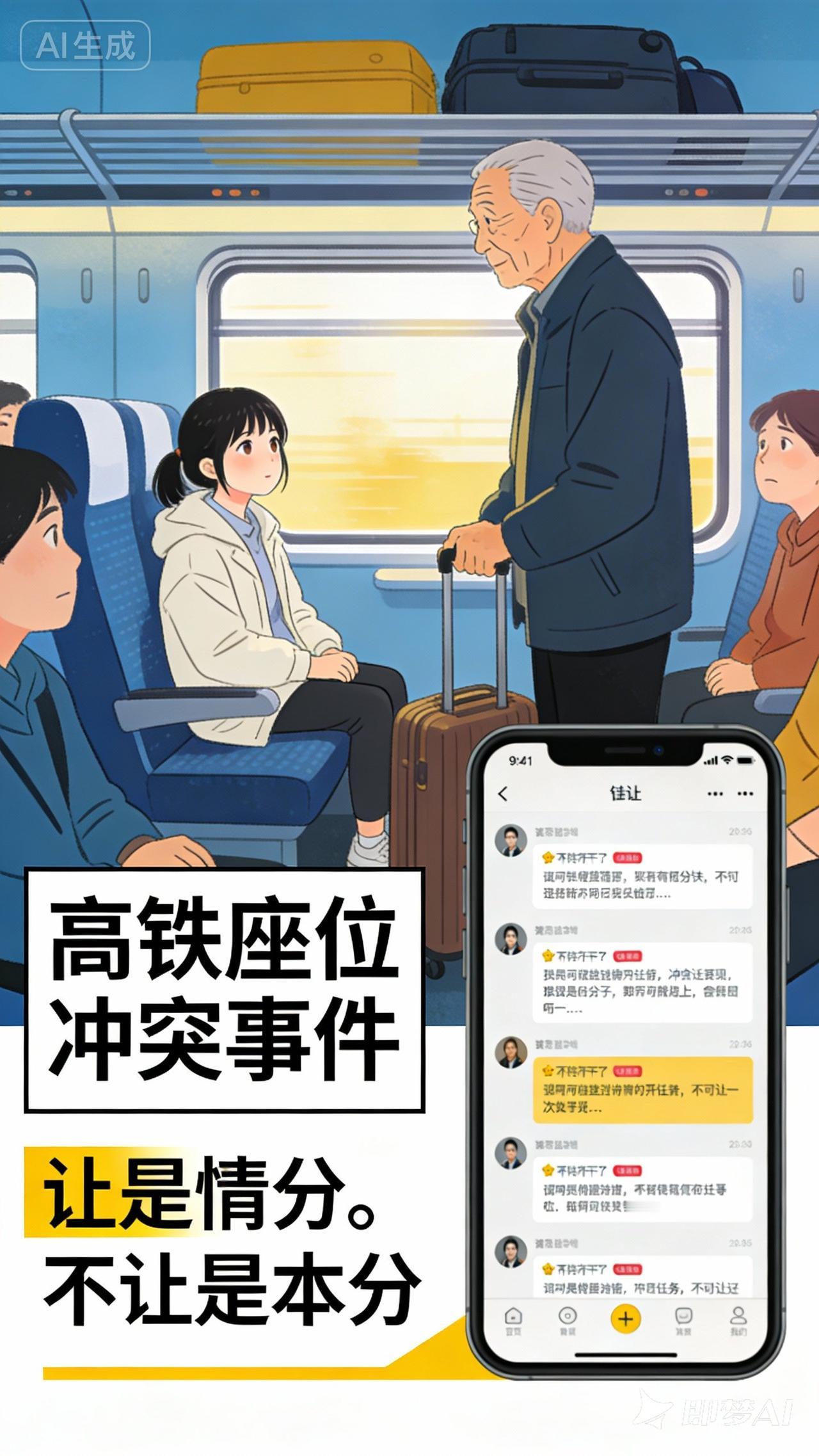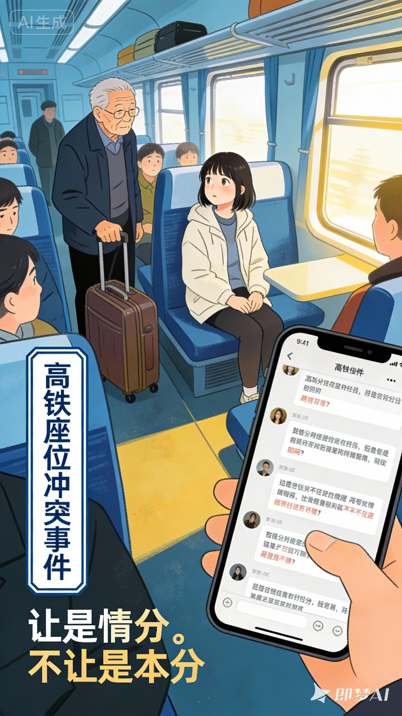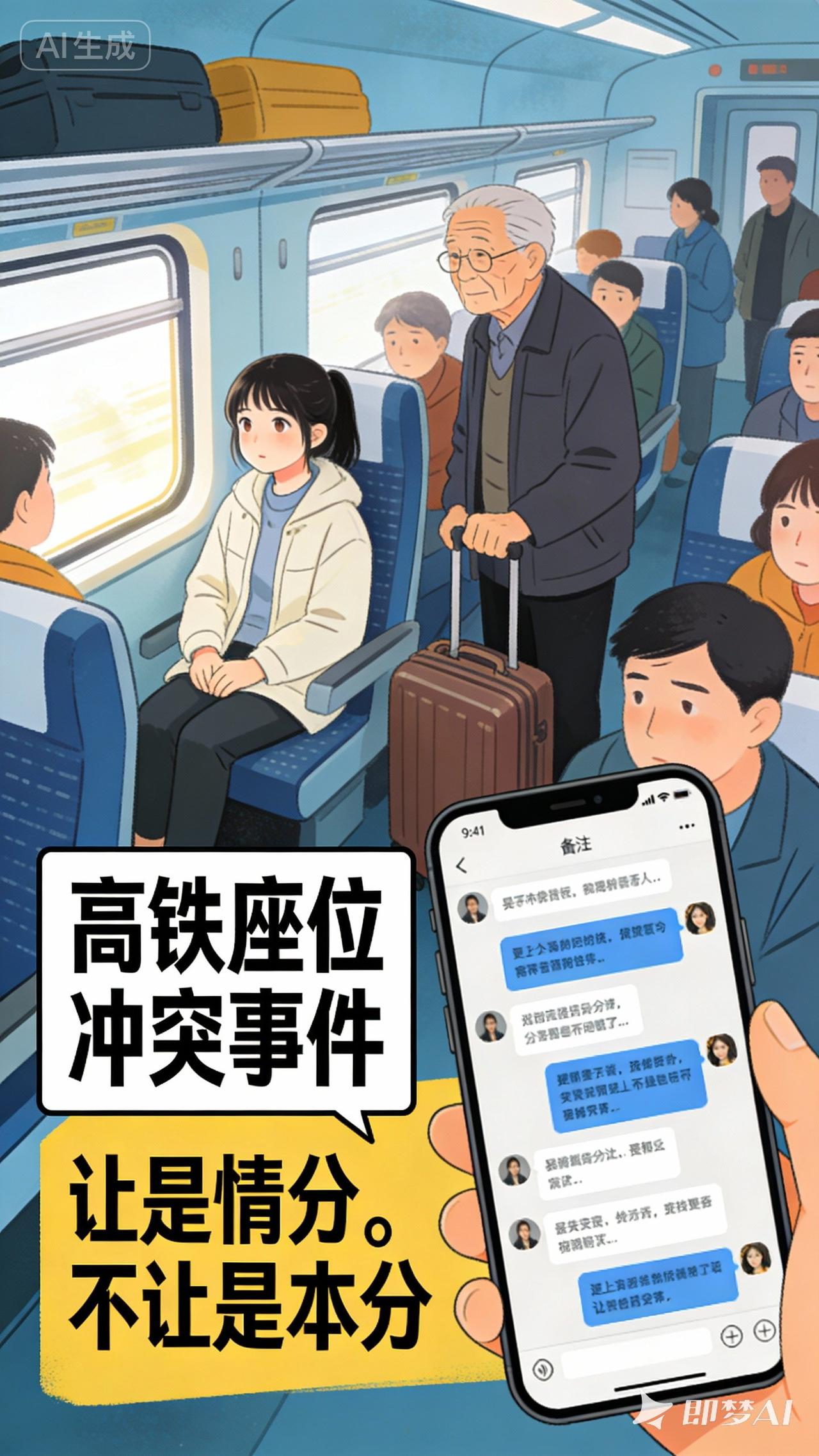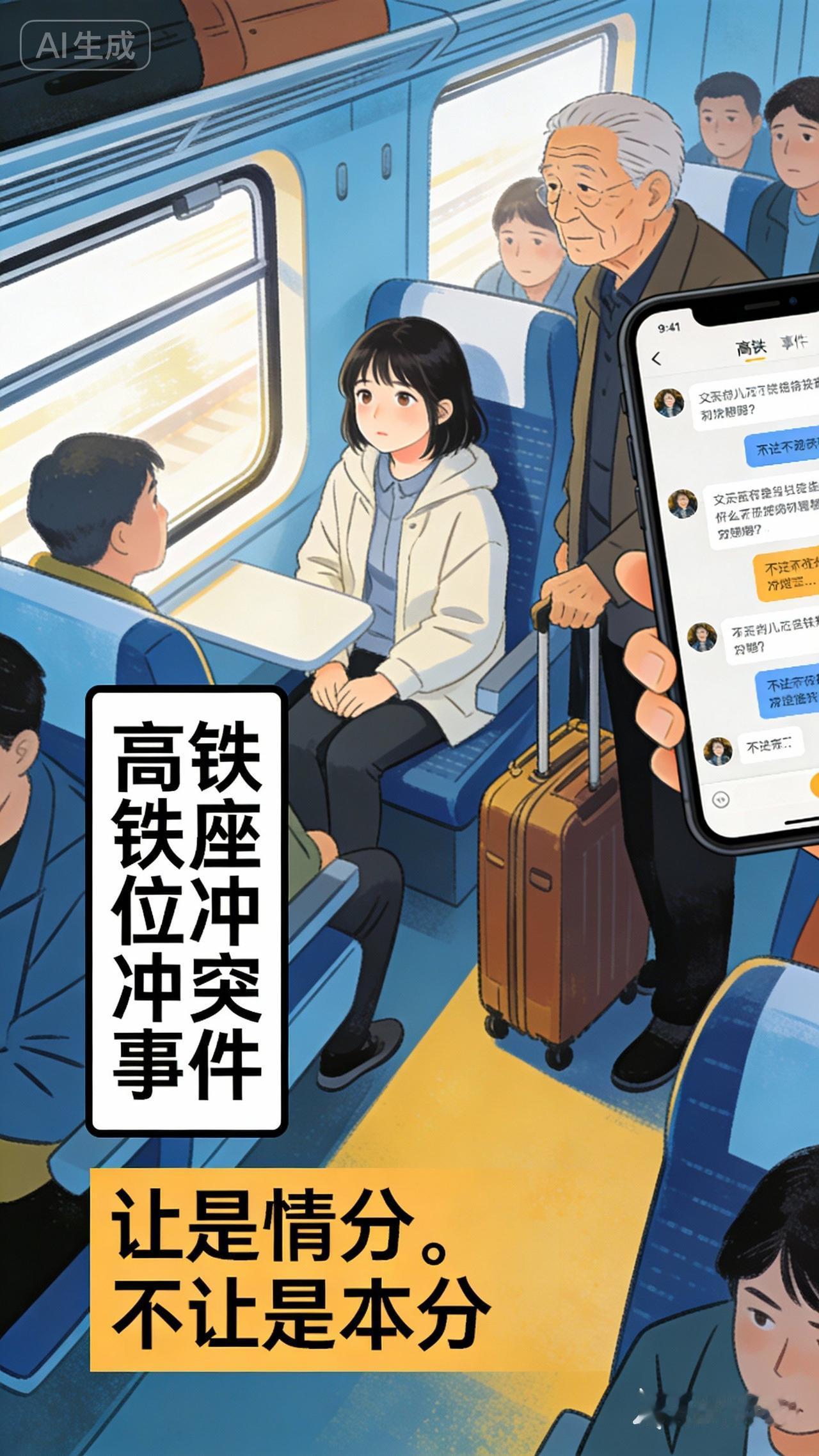 她只是安静地坐在自己花钱购买的位置上,却被迫站在了道德审判台前。这一幕,像极了我们每个人生活中都可能遭遇的“道德绑架”现场。 为什么一个正常使用自己权利的人,会遭到如此猛烈的攻击?这背后折射出的,是一种扭曲的“弱者即正义”逻辑。仿佛只要一方年龄大、处境弱,另一方就必须无条件退让,否则就是冷漠、自私、缺乏教养。 让座是情分,不是本分。 高铁座位不是公交车上的爱心专座,每一个座位都是乘客真金白银购买的有限使用权。那位老人没有购买到座位,本质上是铁路运力调配或他个人规划的问题,而不该由另一位乘客全权承担后果。 我们鼓励尊老爱幼,提倡善意互助,但这必须建立在自愿基础上。当“要求让座”变成“强迫让座”,当“道德倡导”沦为“道德绑架”,整个社会的善意反而会被消耗。 更值得深思的是,那些在网络上挥舞道德大棒的人,有多少在现实生活中遇到同样情况时会毫不犹豫让座?键盘上的“圣人”太多,现实中的践行者却太少。这种割裂,正是网络暴力的典型特征。 真正的文明社会,不是弱者有理的蛮横,而是权利边界清晰的尊重。 那位女子没有错,她维护了自己的合法权益。而那位老人需要的,也不是一个勉强挤出来的半边座位,而是铁路系统更人性化的服务,或者子女更周全的出行安排。 下次当你想要评判他人时,请先问自己:我是在维护正义,还是在发泄情绪?我是在倡导善良,还是在实施绑架? 让善良回归自愿,让权利得到尊重,这才是我们该追求的社会温度。社会热点 高铁一女子