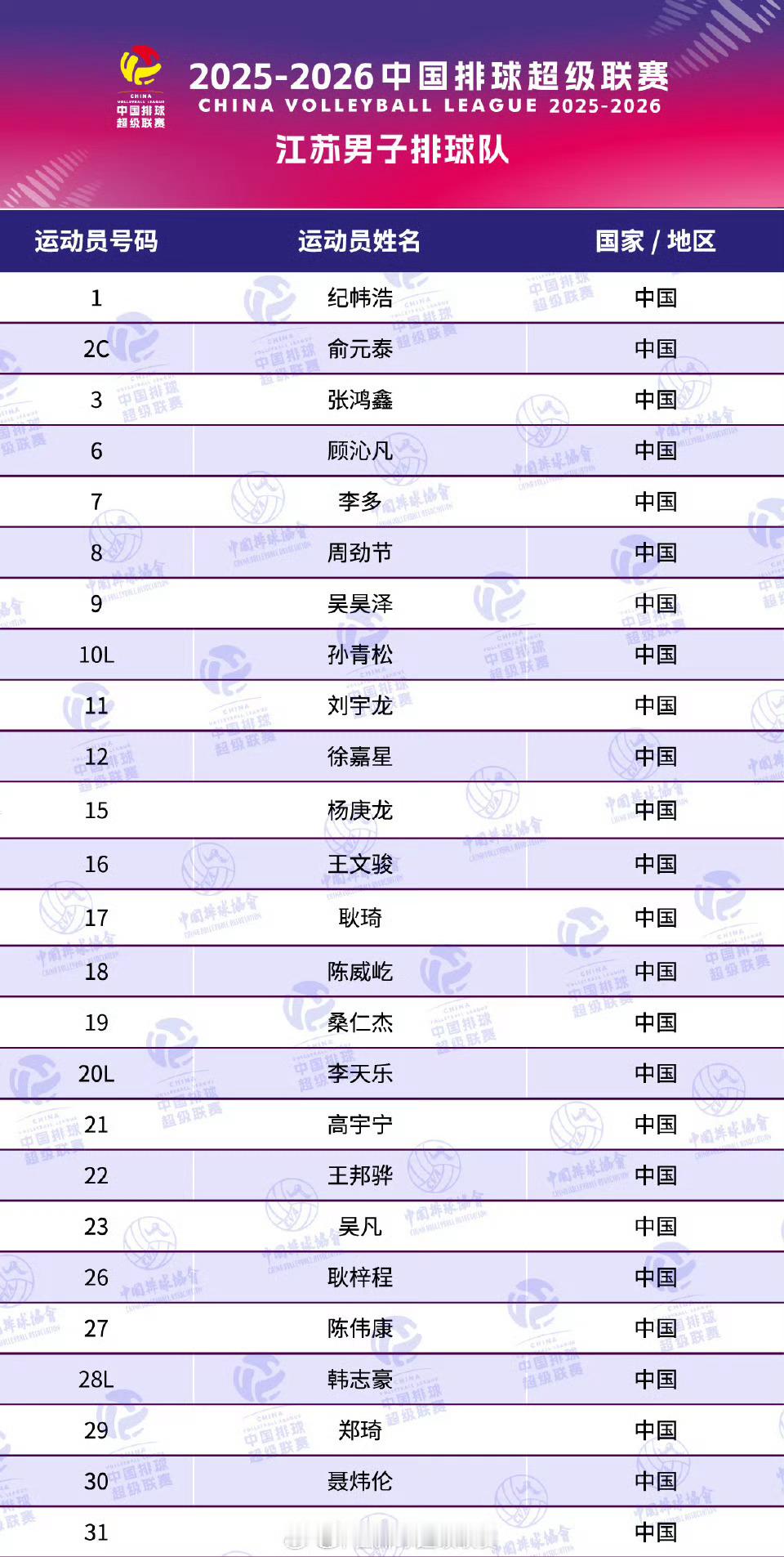 2025-2026赛季中国男排超级联赛江苏男排大名单排超联赛2025-2026中国排球超级联赛