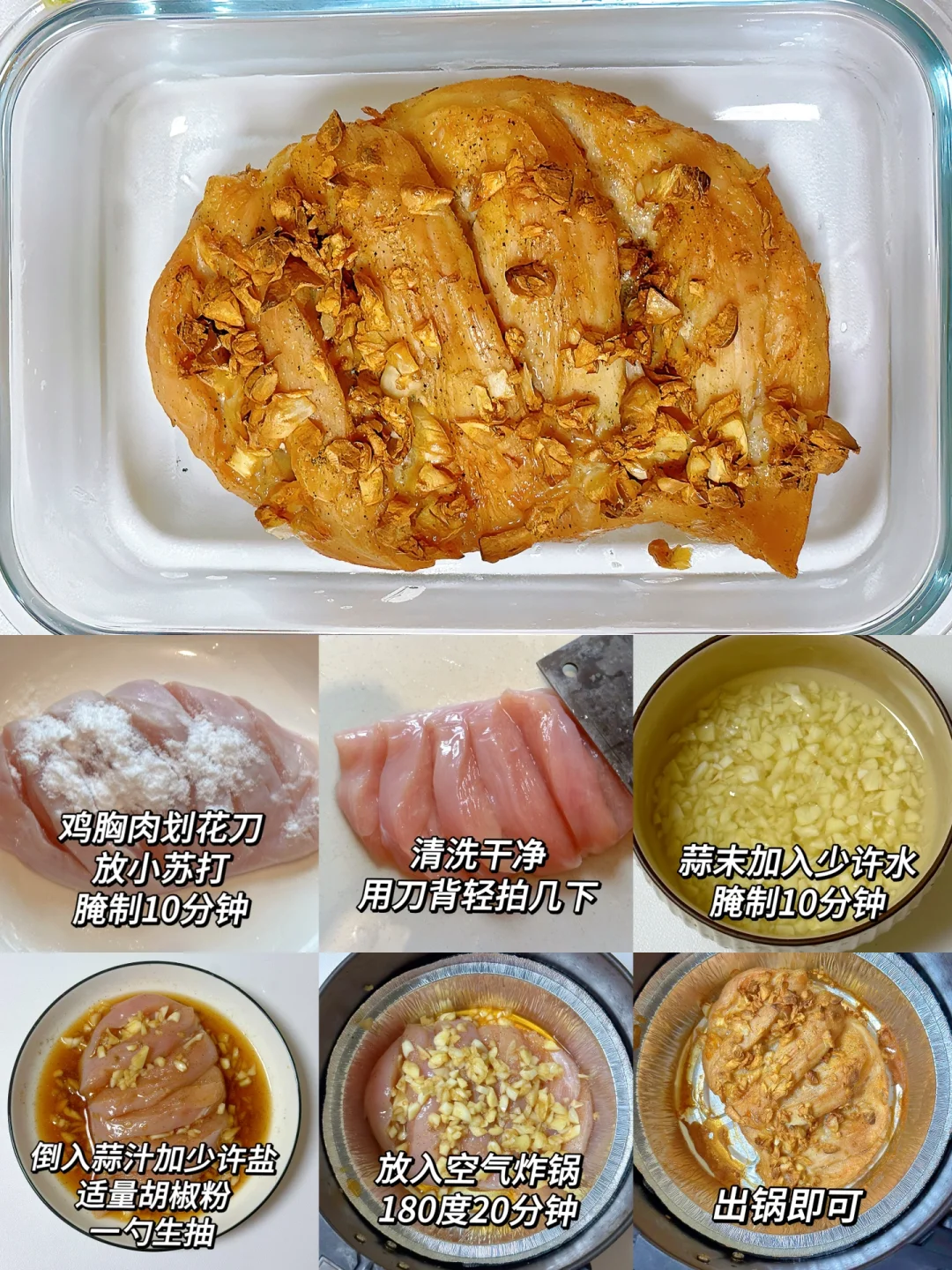 🥘做法:鸡胸肉划花刀,用小苏打腌制10分钟,清洗干净用刀轻拍几下,倒入蒜汁(蒜末加入少许水腌制15分钟)加入少许盐和适量黑胡椒粉、一勺生抽,搅拌均匀腌制30分钟,放入空气炸锅180度20分钟,出锅即可。