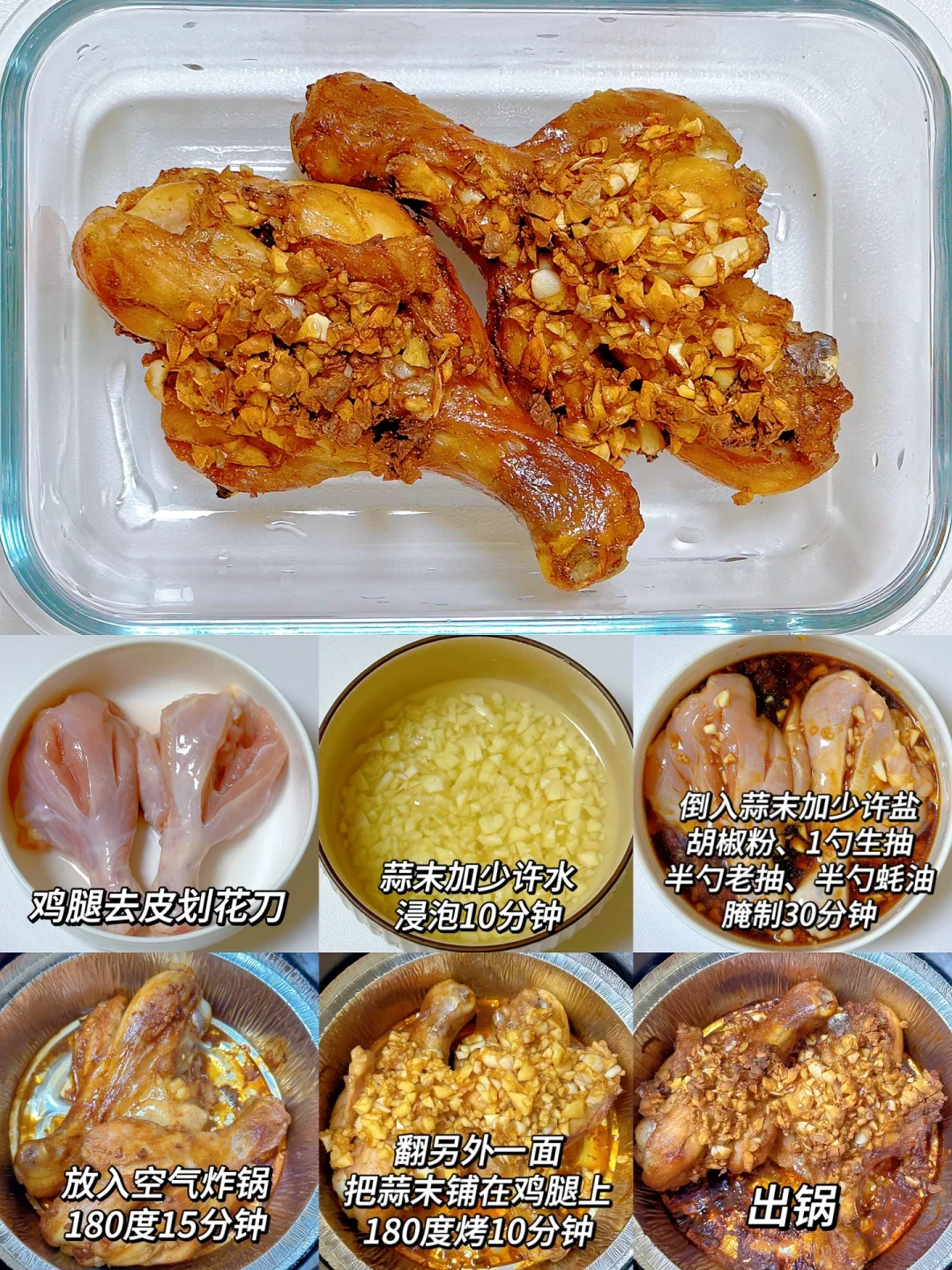 🥘做法:鸡腿去皮划3~5刀,倒入蒜末汁(蒜末加少许水腌制10分钟)加入少许盐、胡椒粉、一勺生抽、半勺老抽、半勺蚝油,搅拌均匀腌制30分钟,放入空气炸锅180度15分钟,翻面把腌制的蒜末铺在鸡腿上180度继续烤10分钟出锅即可。
