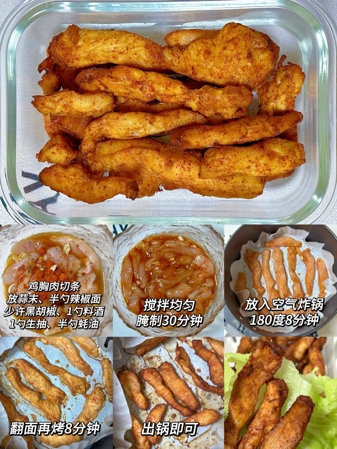 🥘做法:鸡胸肉切条加入蒜末、一勺料酒、一勺生抽、半勺蚝油、半勺辣椒面、少许黑胡椒粉搅拌均匀腌制30分钟,放入空气炸锅180度8分钟,翻面再烤8分钟出锅即可。