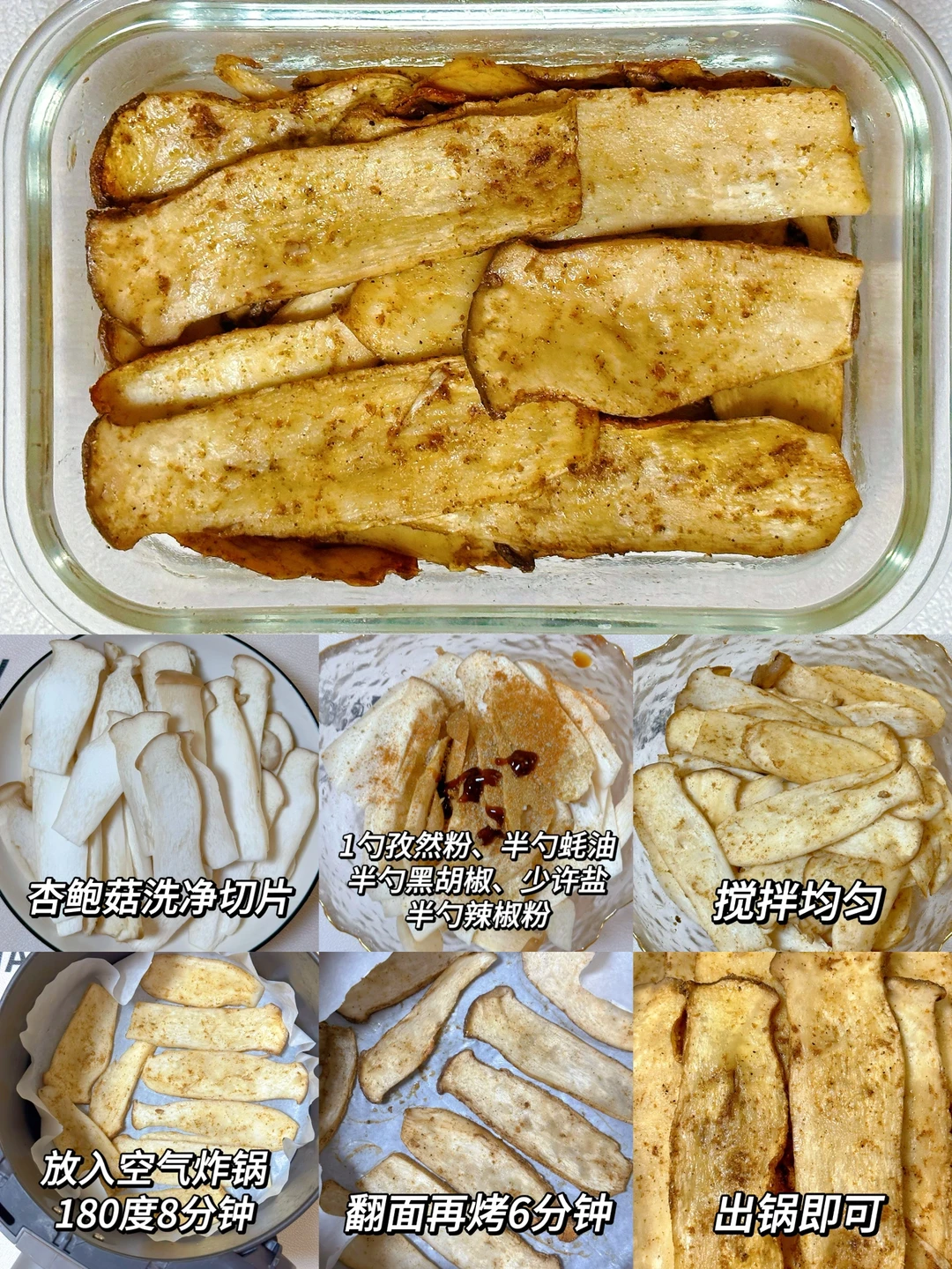 🥘做法:杏鲍菇洗净切片,放一勺孜然粉、半勺黑胡椒粉、半勺辣椒粉、半勺蚝油和少许盐搅拌均匀,放入空气炸锅180度烤8分钟,翻面再烤6分钟出锅即可。