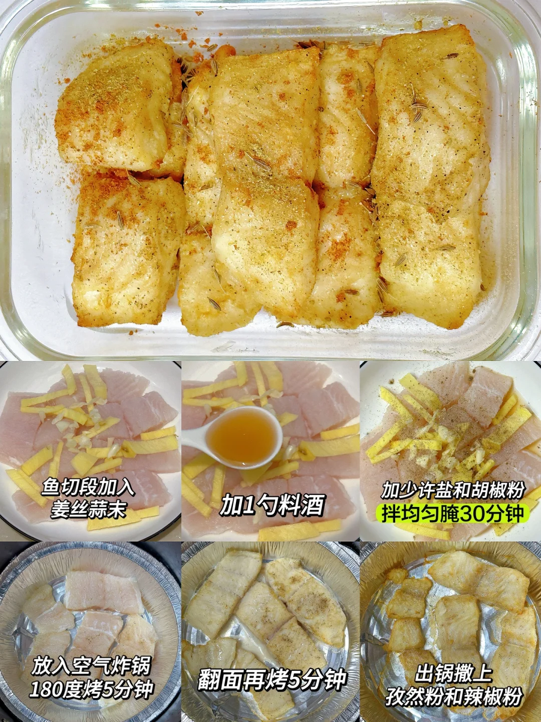 🥘做法:鱼切段加入姜丝和蒜末加入一勺料酒、少许黑胡椒粉和盐拌均匀腌制30分钟,放入空气炸锅180度烤5分钟,翻面再烤5分钟,出锅撒上孜然粉和辣椒粉。